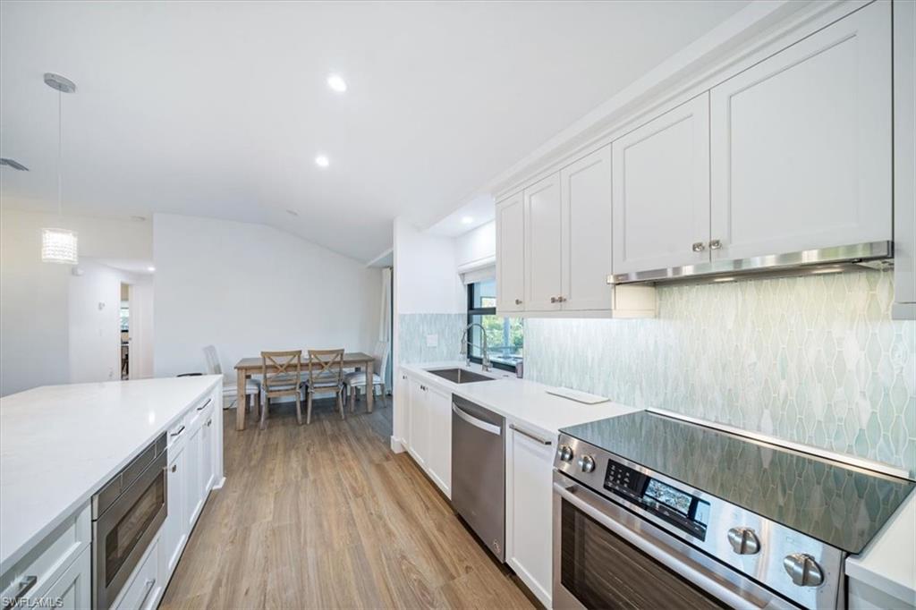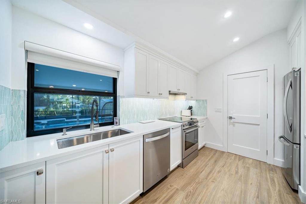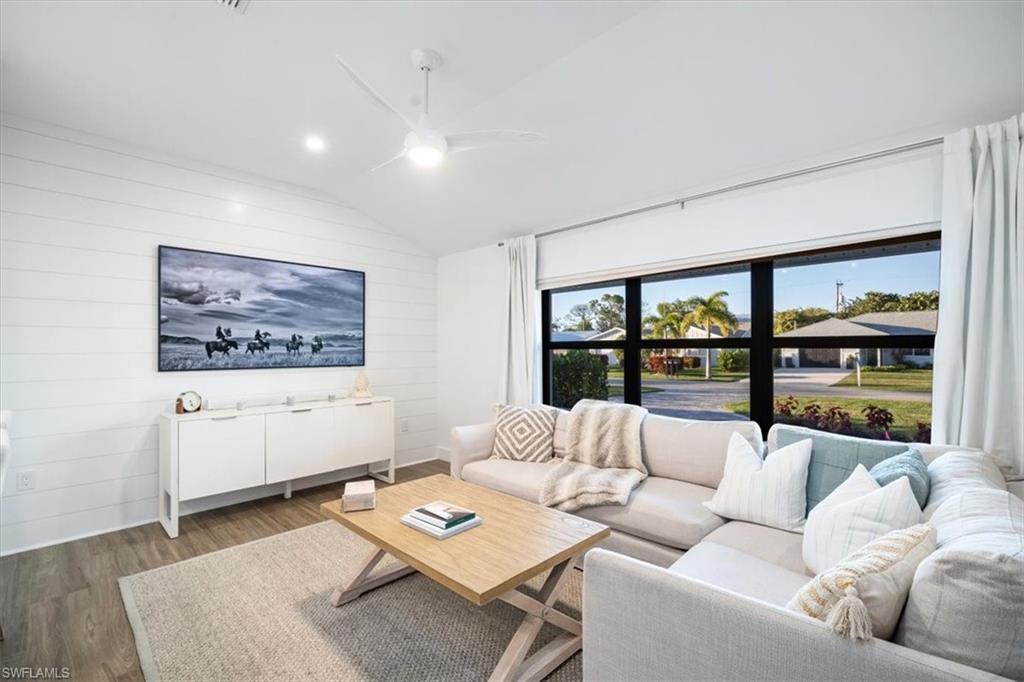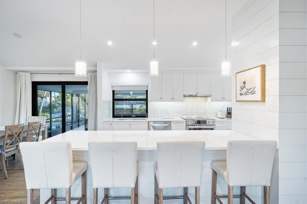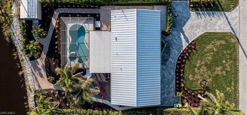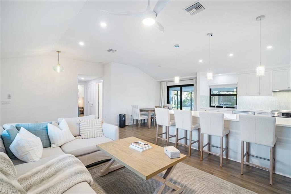 AMAZING RENOVATION & GORGEOUS CURB APPEAL! 1.2 MILES TO THE BEACH!! Noteworthy updates include a new roof in 2023, impact windows and sliders, a tankless water heater installed in 2021, and a 2020 AC unit. 2 fully remodeled baths - main bath is a STEAM SHOWER. The interior showcases a spacious great room with vaulted ceilings and exquisite detailing, complemented by “wood look” tiled flooring. The Shaker-style kitchen, the heart of the home, features an island with quartz countertops and an elegant tiled backsplash. A private guest wing offers its own entrance, a morning kitchen, and a serene patio off the bedroom, ideal for a peaceful retreat. Two additional bedrooms boast vaulted ceilings, ceiling fans, and generous closet space, providing a bright and airy feel. Outdoors, enjoy the Naples lifestyle with a newly renovated pool and spa adorned with mosaic tiles, stone coping, and a paver deck. The screened lanai overlooks the beautifully landscaped yard, creating a serene outdoor haven. A custom-built fire pit invites relaxation while you savor stunning sunsets over the lake from the western-exposure backyard. Additional outdoor features include a shed, LED landscape lighting lushly landscaped. Neighborhood has a community center, boat ramp and perfectly located steps to open waters, boating, kayaking, paddle boarding activities in this northern Collier County community.