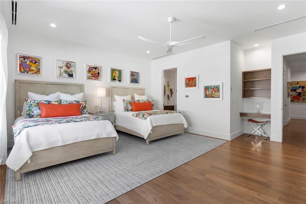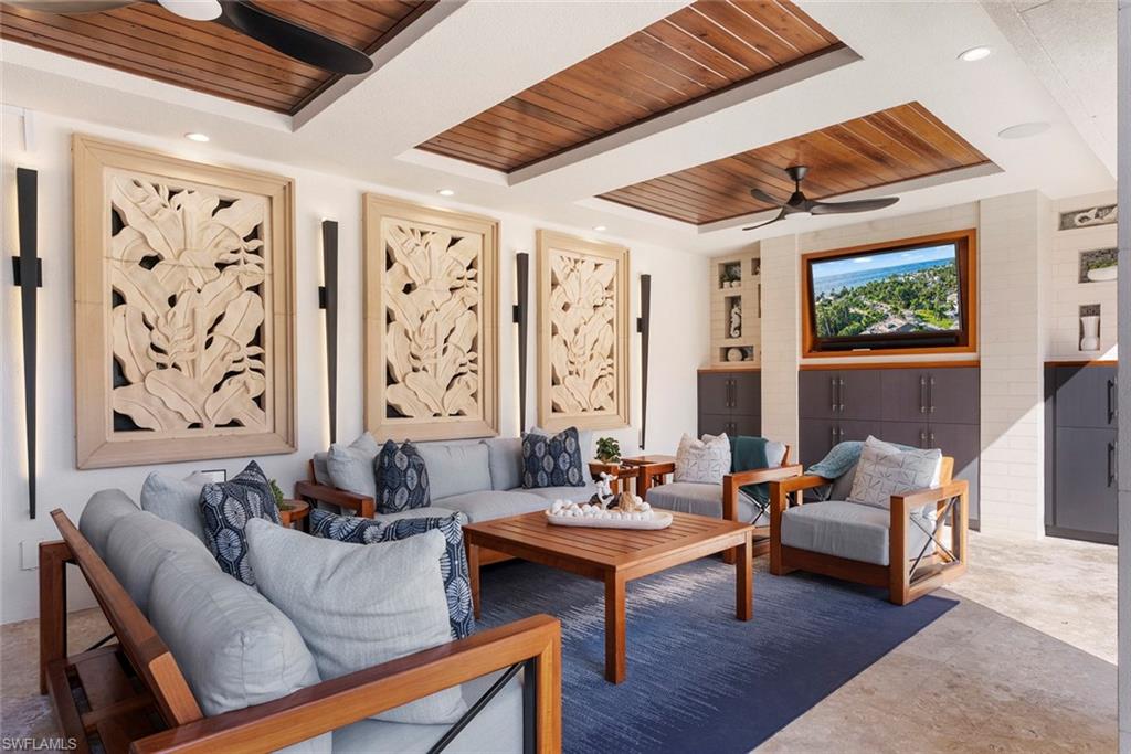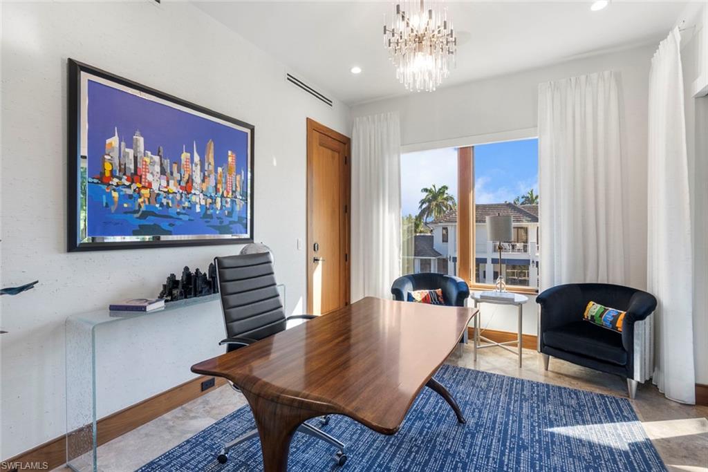 The perfect location in Old Naples, just one block from the beach and two blocks from the fine dining and boutiques of Third Street South. This exceptional all-concrete custom home crafted by Grand Bay Development embodies the best of Naples' luxury living. Featuring 5 bedrooms, 2 dens, plus a flex room off of the pool area and 5 & 1/2 bathrooms. Every detail reflects a commitment to world-class design and craftsmanship, from the curated global finishes to the tropical connection between indoor and outdoor living. The gourmet kitchen adorned with Cristallo Quartzite serves as the heart of the home, with beautiful hardwoods that are increasingly rare, and surrounded by spectacular greenery that creates a sense of privacy and retreat. A custom quartz and agate wet bar opens to the elegant great room, where walls of glass frame western facing terraces. The primary suite offers an elevated sense of serenity with a private balcony with partial gulf views. A rooftop terrace provides panoramic views of the coastline, breathtaking sunsets, and the Naples skyline. The southwest-facing lanai features a vanishing-edge saltwater pool, expansive covered entertaining areas protected by screens and shutters, and meticulously designed tropical landscaping. Combining architectural integrity, global inspiration, and an unmatched location, this residence defines a warm and inviting luxury along the Naples coast.
