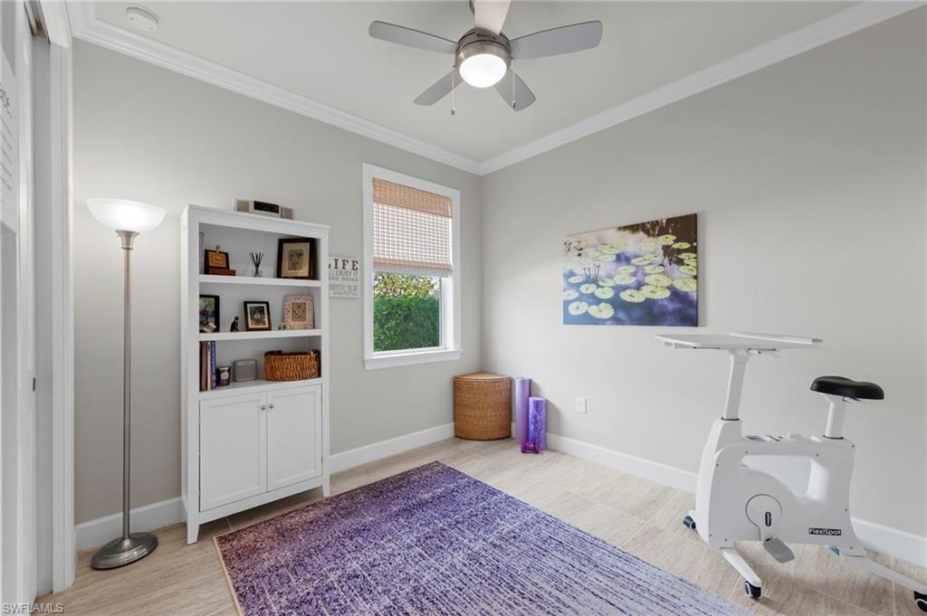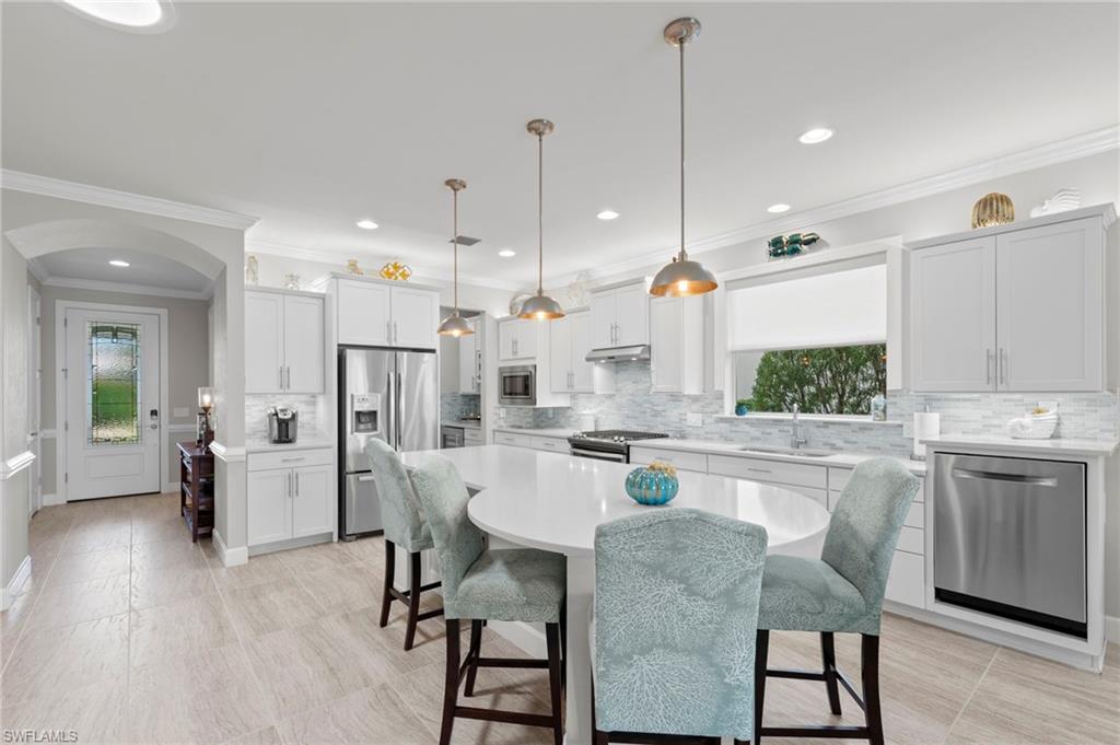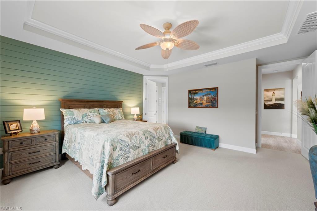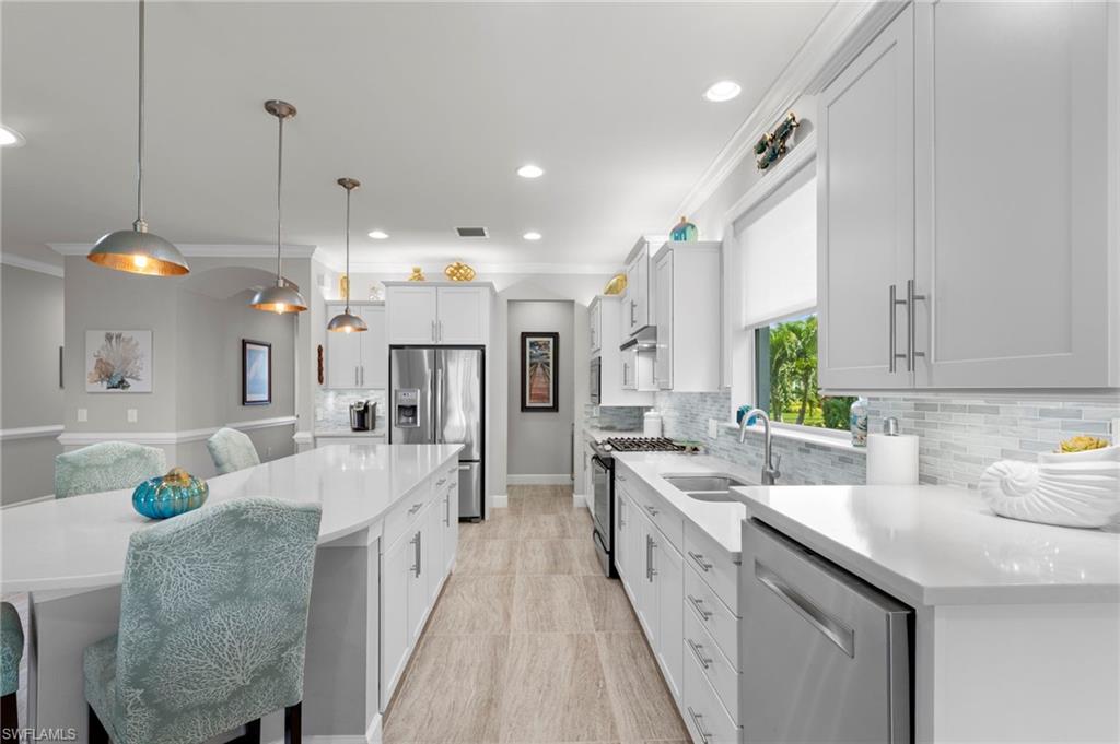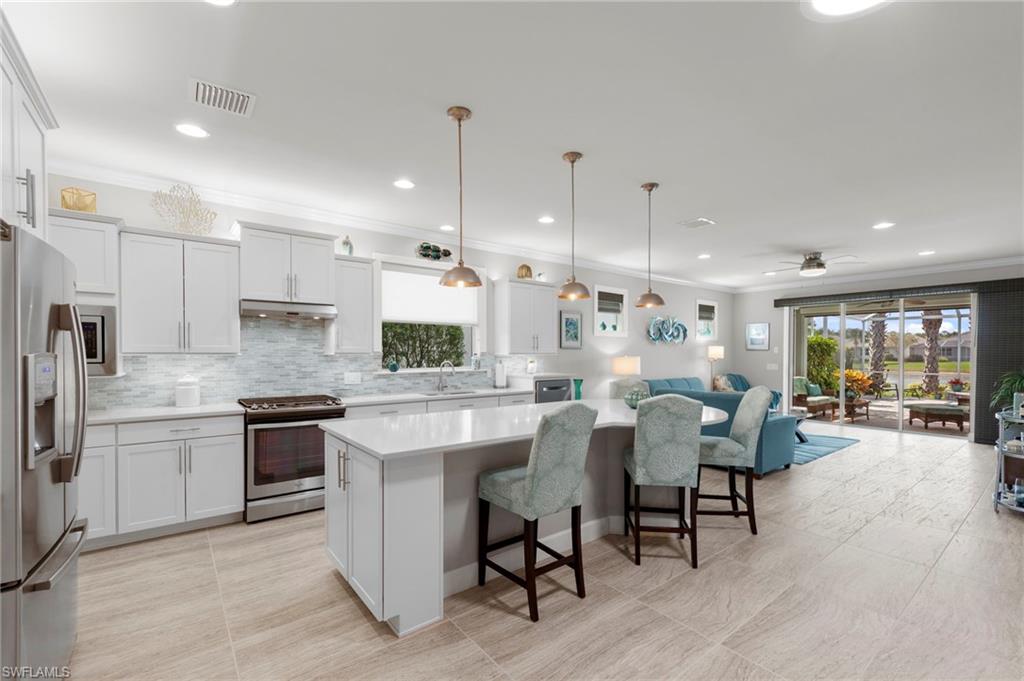 Welcome to 10613 Jackson Square Drive in the attractive Tidewater by Del Webb 55+ active adult gated community. This beautifully upgraded Martin Ray model home offers 3 Bedrooms + Den, 2 full Bathrooms and a spectacular lake view on an oversized lot. The exterior of the home painted in 2025. To fully enhance the home, it also offers a heated private pool, with new pool filter assembly in June 2025, new pool light in 2025, dual heaters, gas, and electric, and the electric heater can also work as pool Chiller! Inside you will find a chef's kitchen with large island, butler's pantry, walk-in pantry, Quartz countertops, Natural Gas for cooking, crown molding throughout, upgraded tile floors in main living areas, 2 Sun tubes for added daylight, drop zone by garage door, and more! The Master suite offers a quiet retreat, a custom accent wall, ensuite bath with large shower and custom finished walk-in closet. The beautiful interior flows seamlessly to the outside. where you will find an extended covered lanai, with 2 motorized roll-down UV sun shades to filter the sunlight, and additional motorized roll-down hurricane shutters to allow outdoor furniture storage during storms. Beyond the covered area, the lanai offers space to relax by the heated pool, with a view of the lake and fountain. This home offers the perfect amount of space for two, yet provides an 2 extra bedrooms for company! The award-winning amenity center offers bocce ball, pickle ball, tennis a resort-style pool and more! Tidewater by Del Webb is Estero's premier Active 55+ community, offering the perfect location in Estero, and NO CDD! Close to RSW Airport, Miromar Outlets, Hertz Arena, I-75... and a short drive to the sandy beaches of SWFL. Welcome home!