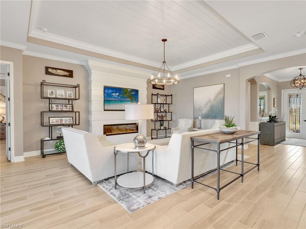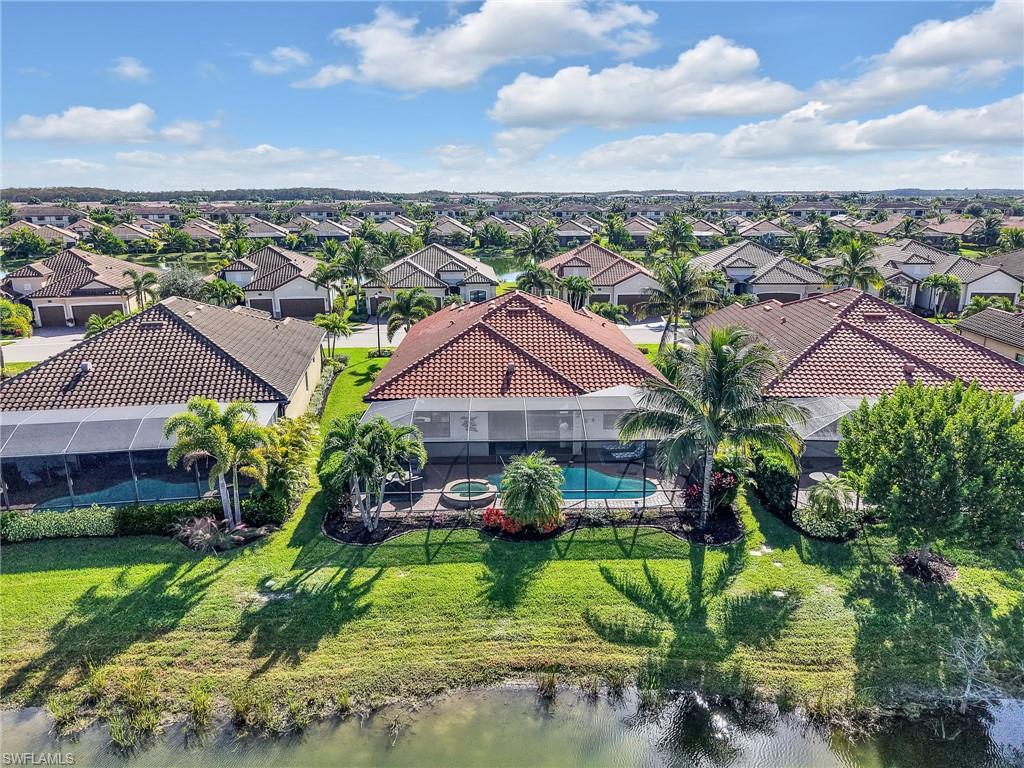 Exquisite Summerville Lake View Home in Bonita National Golf & Country Club! This beautifully upgraded 3-bedroom plus den, 3-bath, 3-car garage home offers resort-style living at its finest. Outside, enjoy a heated saltwater pool and spa, summer kitchen with stonework, wood ceiling lanai with lighting, sealed driveway and lanai, and lush custom landscaping with added drainage and gutters. Inside, this fully integrated Google Smart Home features plank tile flooring, fresh interior paint, plantation shutters, custom drapery, designer lighting, and custom closets throughout. The kitchen impresses with upgraded cabinetry, stainless range hood, under-counter wine cooler, custom backsplash, and wainscoting in the formal dining area. The living room showcases a shiplap ceiling, custom entertainment wall with fireplace. The primary suite is a true retreat with a custom ceiling, electronic shade, dual closets, and an elegant bath featuring his and her vanities, a soaking tub, a separate glass shower, and framed mirrors. Guest suites feature crown moulding, custom lighting, and tile to ceiling. The home is equipped with a Kinetico whole-house water filtration system, plus reverse osmosis at the kitchen sink for ultra-clean drinking water. The garage offers epoxy floors, insulated doors, custom cabinetry, attic storage, and an HVAC air scrubber. Enjoy the amenities of Bonita National, including an 18-hole championship golf course, resort-style pool with waterfall and cabanas, full-service spa, fitness center, tennis courts, fine and casual dining, and a lively social calendar. This home is one of the most extensively upgraded Summerville models in Bonita National—move-in ready and truly exceptional.