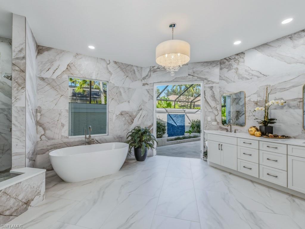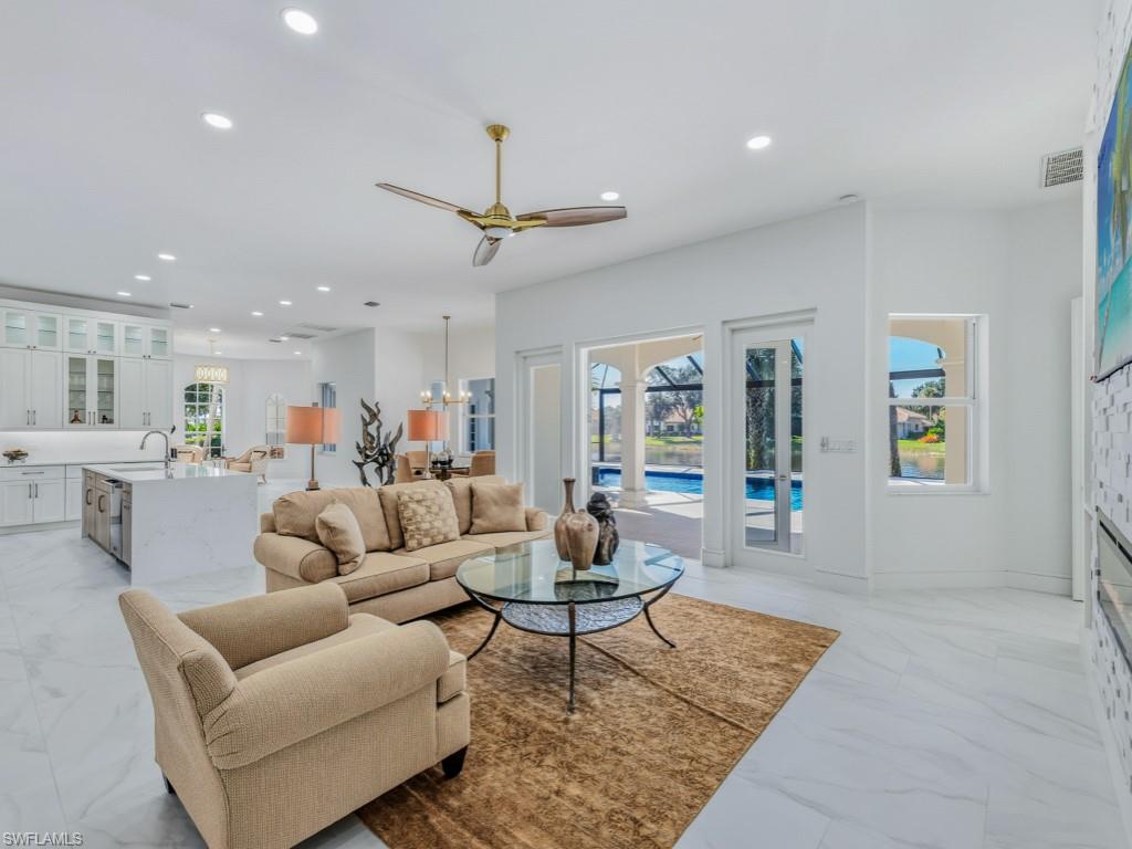 This home combines timeless design with today’s most sought-after luxuries. From the moment you enter, light fills every corner of the open-concept living space, drawing your eye to expansive western lake and sunset views. The chef’s kitchen is a showstopper, featuring soft-close custom cabinetry, quartz waterfall center island, and a full suite of Viking stainless appliances, including dual convection ovens and an induction cooktop. A stunning fireplace and 80” TV anchor the main living area, perfect for relaxed entertaining. Retreat to the primary suite where French doors open to the lanai and a spa-inspired bath offers a freestanding soaking tub, oversized walk-in shower, and a private garden lanai shared with the office. Outdoors, the panoramic screened pool area with water feature becomes your own private oasis, ideal for watching sunsets over the lake. Additional highlights include a non-flood zone location, all new lighting, porcelain tile and luxury vinyl plank flooring, and fresh interior/exterior paint. A secluded upstairs suite with its own bath provides the perfect haven for guests or live-in accommodations. Pelican Landing offers an impressive range of amenities, including a top-notch tennis program, a private beach park accessible by water taxi, scenic kayaking and canoeing on Spring Creek, a lively community center, a state-of-the-art fitness center, sailing, bocce, pickleball courts, and miles of scenic walking and biking trails. Golf enthusiasts can also take advantage of membership opportunities at The Nest Golf Club. With effortless access to Naples, Southwest Florida International Airport, Coconut Point, Miromar Outlets, and the stunning Gulf of Mexico beaches, this home is a must-see. Schedule your showing today!
