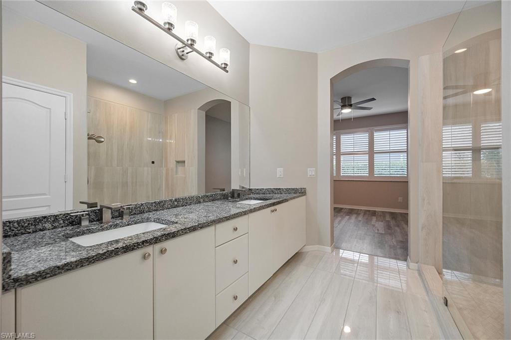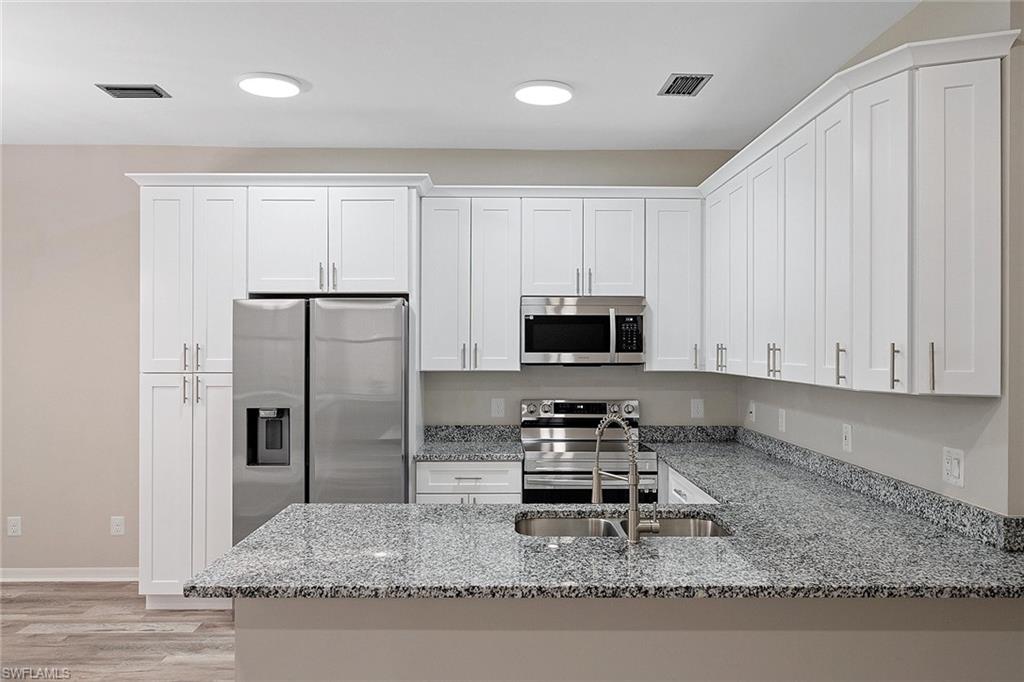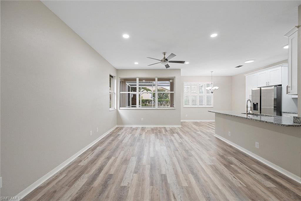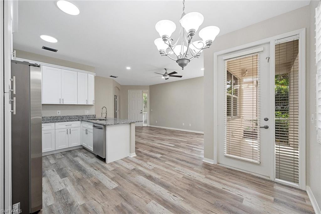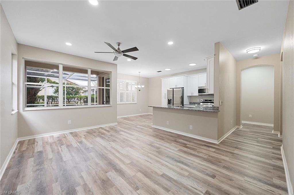 The HOA provides ROOF REPLACEMENT every 15 years, included in fees. Remodeled in 2023, this three-bedroom, two-bath single-family home showcases thoughtful updates, including wood-look tile flooring, plantation shutters, epoxy-coated garage floors and an electric vehicle charger. This beautifully updated kitchen blends style and functionality with sleek cabinetry and gleaming stainless steel appliances. The open layout creates seamless flow into dining area and living areas. Ideal for everyday living and entertaining alike. The primary suite features a walk-in closet and a beautifully updated bath with dual sinks and walk-in shower. A new air-conditioning system (August 2025) adds peace of mind. Outdoor living shines on the screened lanai with covered and open areas for relaxing or entertaining. The Villages of Bonita Springs offers resort-style amenities, including a clubhouse, pool and spa, fitness center, billiards, shuffleboard, and tennis courts that convert to pickleball, along with year-round social activities. Conveniently near downtown Bonita Springs and Coconut Point Mall.