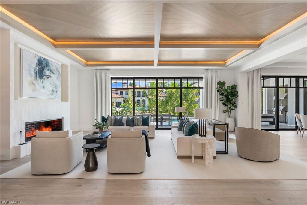 This is Naples' only neighborhood that provides walk to beach, Third Street historic district, and direct boat access. Close to a hidden beach path, and tucked away in a private section of Aqualane Shores, this custom home was beautifully designed and furnished by Broad Avenue Studios, expertly crafted by Toscana Homes, and penned by the renowned Stofft Cooney Architects, showcasing timeless elegance and meticulous attention to detail. Situated on 107' of waterfront with protected harborage on Kite Cove, the property is close to the open waters of Naples Bay with direct gulf access. Built with full concrete construction, the interior features European oak floors throughout, enhancing the warmth and sophistication of the great room that presents 10’ tall pocketing lift and slide doors to seamlessly integrate the outdoor living. The chef’s kitchen is a culinary dream, boasting a 60" Wolf range with double ovens, 72” Subzero refrigeration, and custom SOHO cabinetry covered in honed quartzite counters, and complemented by a butler’s kitchen for seamless entertaining. Modern conveniences abound, including Lutron lighting, three washer and dryer sets, tankless water heaters, and natural gas service with a 48KW whole home generator. Each en-suite bedroom is an oversize private retreat, while the study offers flexible space for work or relaxation. The outdoor area is an entertainer’s paradise, with a resort-style 40’ lap-pool and custom spa, a fully equipped outdoor kitchen, lower firepit deck, and spacious covered seating areas that overlook the serene tropical waterfront. Close to Naples’ finest restaurants and world-class shopping on 5th Avenue South and Third Street South. With both beach and boating lifestyles at hand, this is the pinnacle of refined waterfront living in Aqualane Shores.