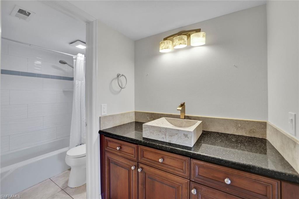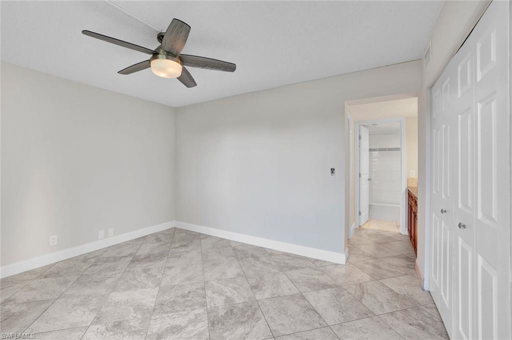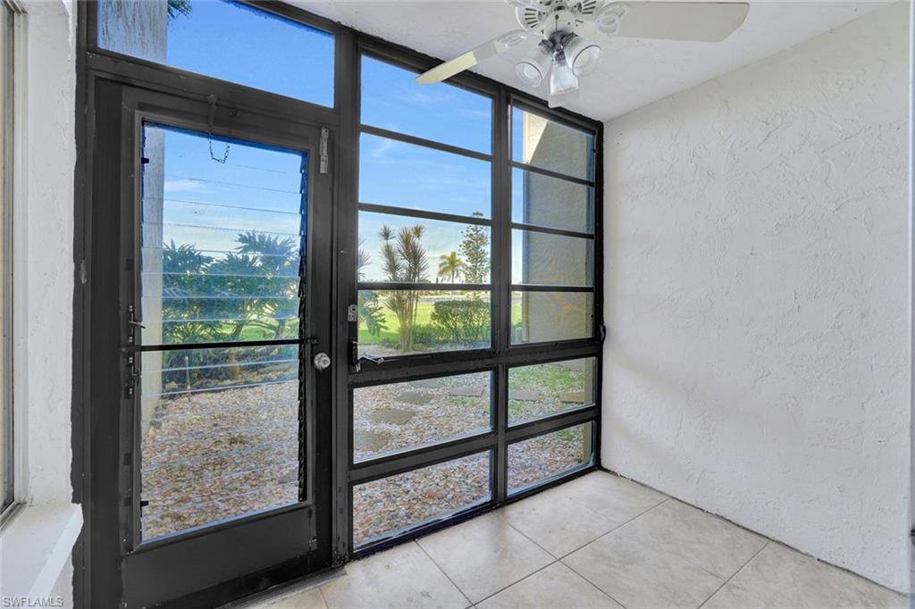 This condominium offers an inviting and open living space with several newer updates. The bright and spacious floor plan features a large living room, complemented by a separate dining area that is perfect for entertaining or enjoying daily meals. The kitchen is equipped with a breakfast bar, providing a convenient spot for casual dining, and tile flooring throughout adds a touch of modern style and easy maintenance. Step out onto the screened porch located at the rear of the unit, where you can relax while overlooking the scenic golf course and a distant lake, creating a peaceful and picturesque setting. The bedroom is generously sized and includes a large closet for ample storage. The bathroom has been updated with a new vanity, enhancing both functionality and appearance. An extra storage locker is available in the storage closet, providing additional room for your belongings. The washer and dryer are conveniently located in the condo's private utility closet in the front entry area, ensuring laundry tasks are easily managed. This highly sought-after location is just a 10-minute drive from downtown Naples and the beautiful beaches. Nearby plazas offer shopping and dining options for your convenience. Residents have the option to join the Lakewood Country Club, where they can take advantage of extra amenities such as golf, tennis, pickleball, and a clubhouse with dining facilities. Residents of the complex enjoy access to a community pool. The condo also includes a one-car carport and plenty of guest parking, making it easy to host visitors.