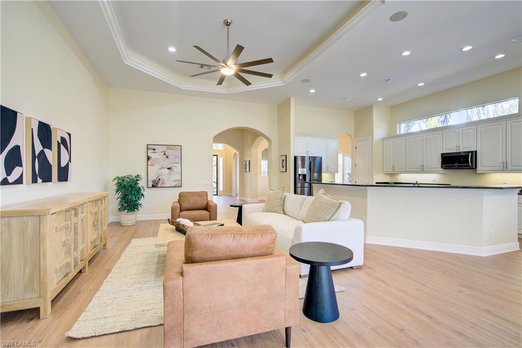 This beautifully updated, turnkey-furnished home sits at the end of a peaceful cul-de-sac on one of Vasari’s most desirable streets. With a FULL golf membership included and ready to use, you can start enjoying the bundled golf lifestyle from day one. Inside, the home lives light, bright, and stylish with luxury vinyl plank flooring, updated cabinetry and trim, modern lighting and fans, plantation shutters, and freshly painted interiors. A flexible layout includes 3 bedrooms, 2 baths, a den/office, and a formal dining space—perfect for hosting guests or creating private retreat areas. Significant upgrades were completed for long-term peace of mind: a new roof, exterior paint, and refreshed landscaping (2022), plus a new AC installed in 2025. Everything feels crisp, clean, and move-in ready. Step out your front door and embrace the full Vasari experience: championship golf, active tennis and bocce programs, fitness center, resort pool with food & beverage service, clubhouse dining, the lively Taverna bar, and pickleball on the way. It’s all included in your ownership. Whether you're seeking a seasonal escape or a full-time Florida residence, this home delivers exceptional value. Just minutes from Naples and Bonita Springs, RSW Airport, premier shopping, dining, and powder-soft Gulf beaches, it offers an unbeatable combination of convenience, comfort, and the coveted bundled golf lifestyle.