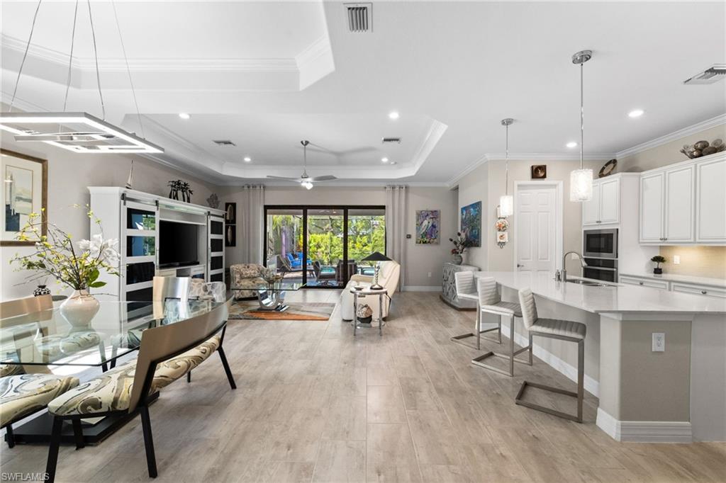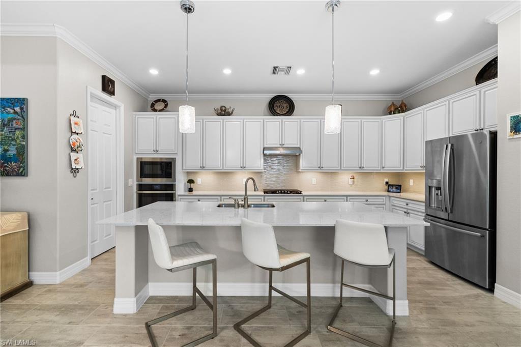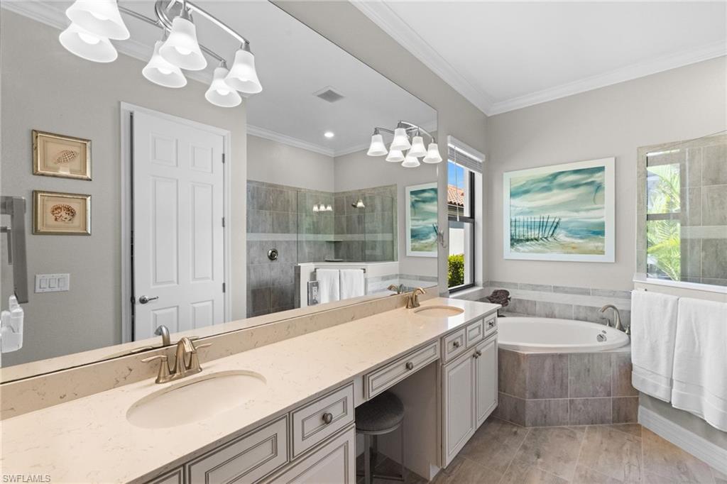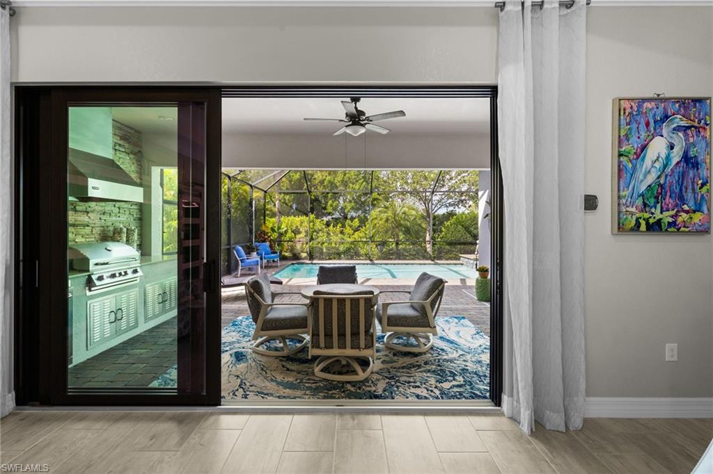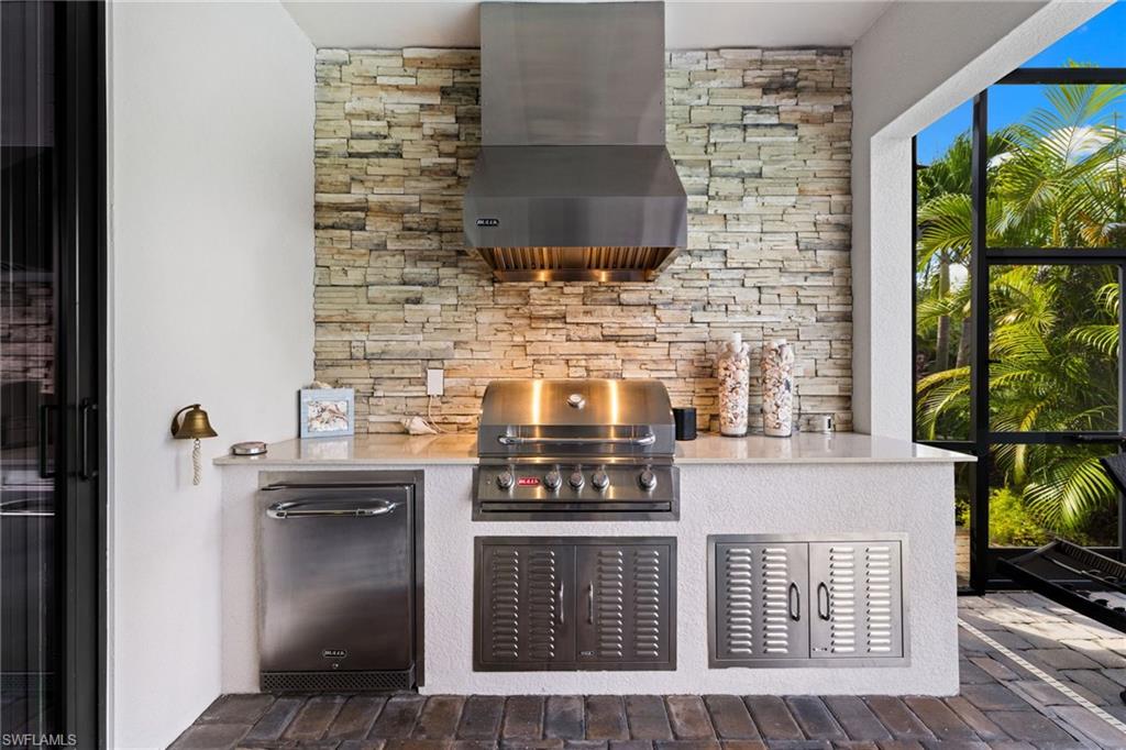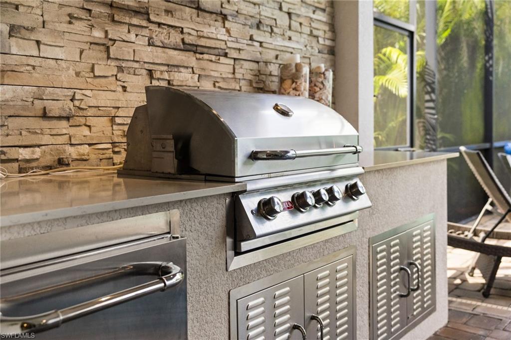 This lovely 3 bedroom 3 bath home, with a den easily converted to a 4th bedroom, is situated on a cul de sac in a pretty residential neighborhood in North Naples. The house is well protected from any weather concerns with a stand-by generator, impact glass doors and windows, and a lanai Storm Smart hurricane screen which offer peace of mind to the full-time or seasonal resident. Equipped with Smart Home Technology, upgraded lighting and fans, natural gas available for heating the pool as well as the kitchen cooktop, outdoor grill, clothes dryer, and tankless hot water system, the homeowners have an ease of living that is appreciated by the whole family. Extra shelving in the closets. and custom built-in storage in the garage provide a convenient solution to the many extras a family accumulates. The beautiful lanai, pool, and spa are enclosed by lush landscaping and invite family and friends to enjoy warm sunny days and spectacular sunsets in true Florida style. A small adjacent pond attracts abundant bird life to the area adding to the ambiance. An outdoor kitchen with gas grill and bar fridge complete the picture of a personal oasis of relaxation. LaMorada is a small residential community located near top rated schools, and Founder's Square with its numerous dining, shopping, medical, and service opportunities. The residents enjoy many club activities including tennis, pickleball, bocce ball, swimming, and their own pool bar and restaurant.