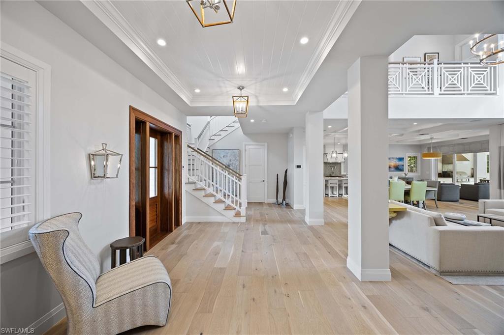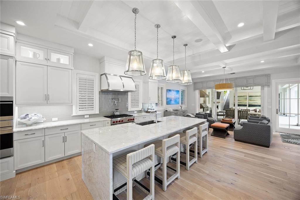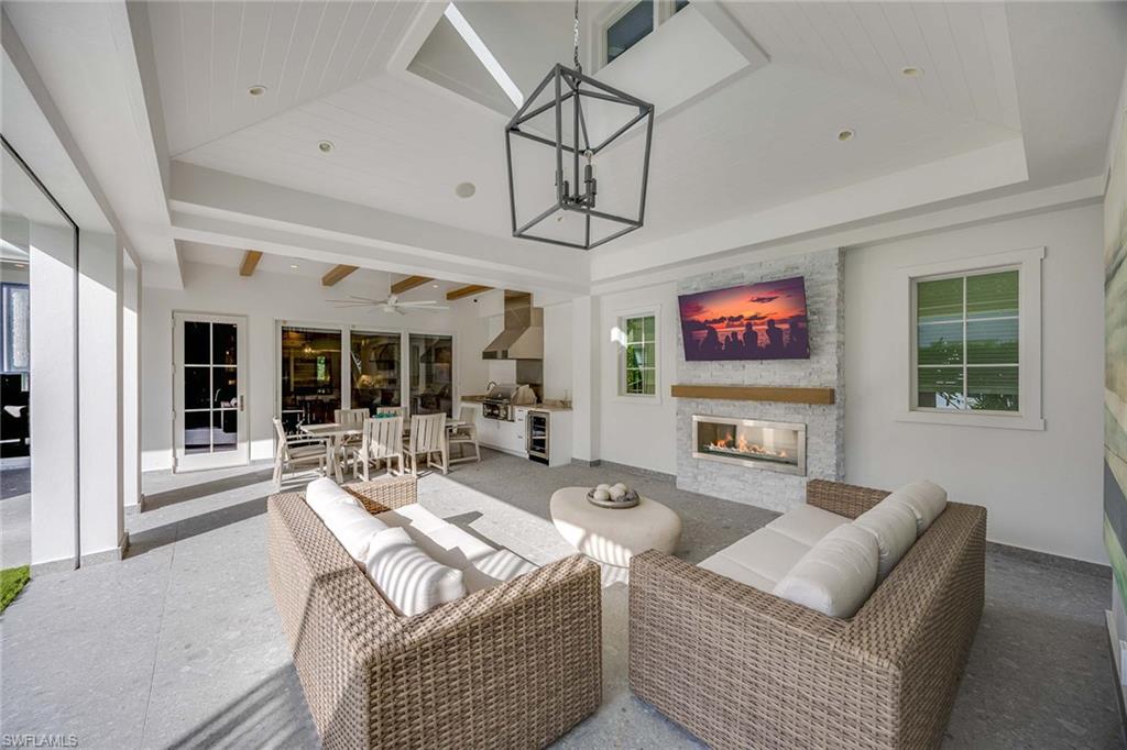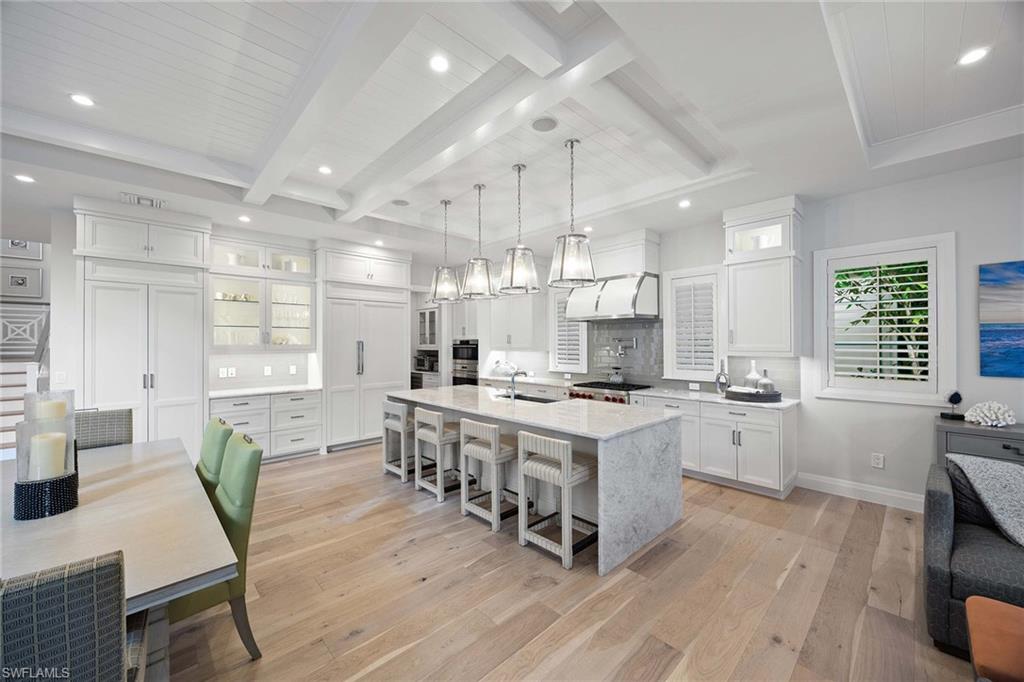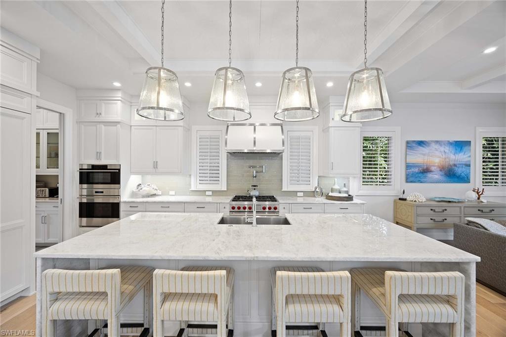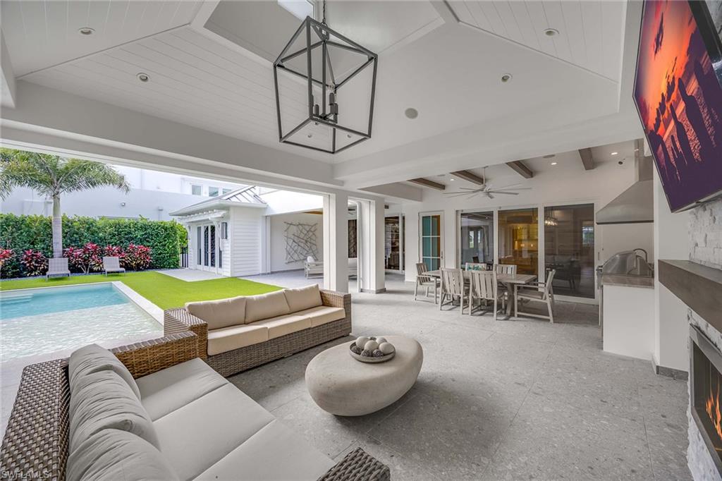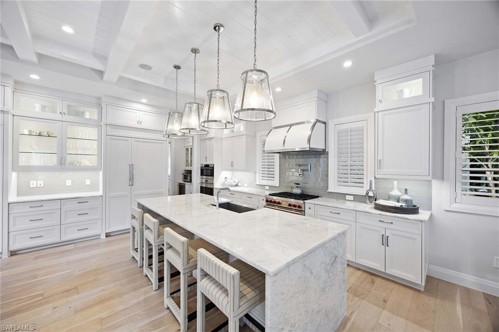 Embodying timeless coastal elegance, Seaglass Cottage emerges as an architectural masterpiece in the heart of Old Naples, a short distance from paradise, just seven blocks to the pristine Gulf Shores, four blocks to the vibrant shopping and dining on 5th Avenue and 3rd Street, epitomizing the pinnacle of Old Naples lifestyle. Celebrated as Home & Design Magazine's Signature Home of the Year and masterfully designed by MHK Architecture, this residence, completed in 2017 features a convenient first-floor main suite plus four additional en suites, totaling 6 1/2 baths. Desirable southern exposure for ultimate refined living. The chef-inspired kitchen boasts premium finishes such as Cristallo quartzite countertops, Ruffino cabinetry and top-tier Sub-Zero/Wolf appliances. As one of the select homes in Old Naples, upgraded from a traditional propane tank to continuous natural gas service. The outdoor oasis rivals a luxury resort, complete with a saltwater pool featuring a sun shelf, spa and waterfall, alongside an outdoor kitchen and fireplace.
