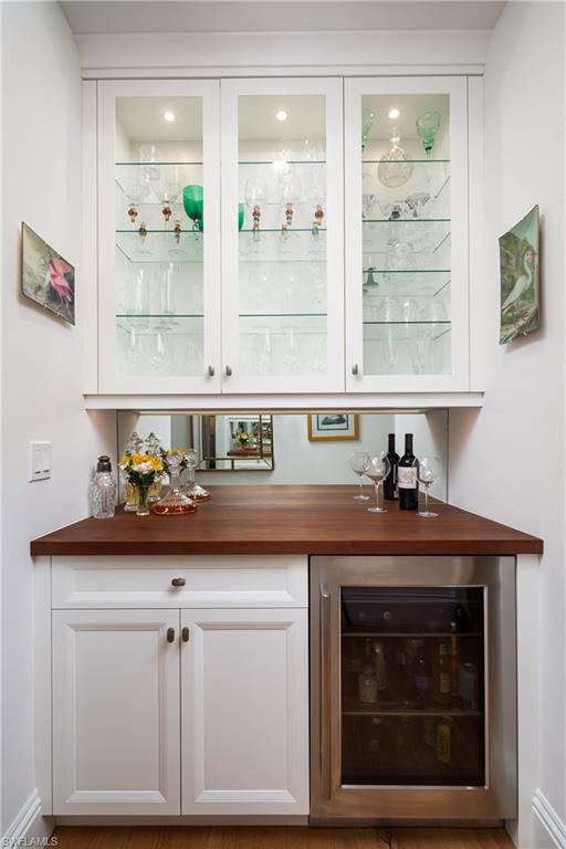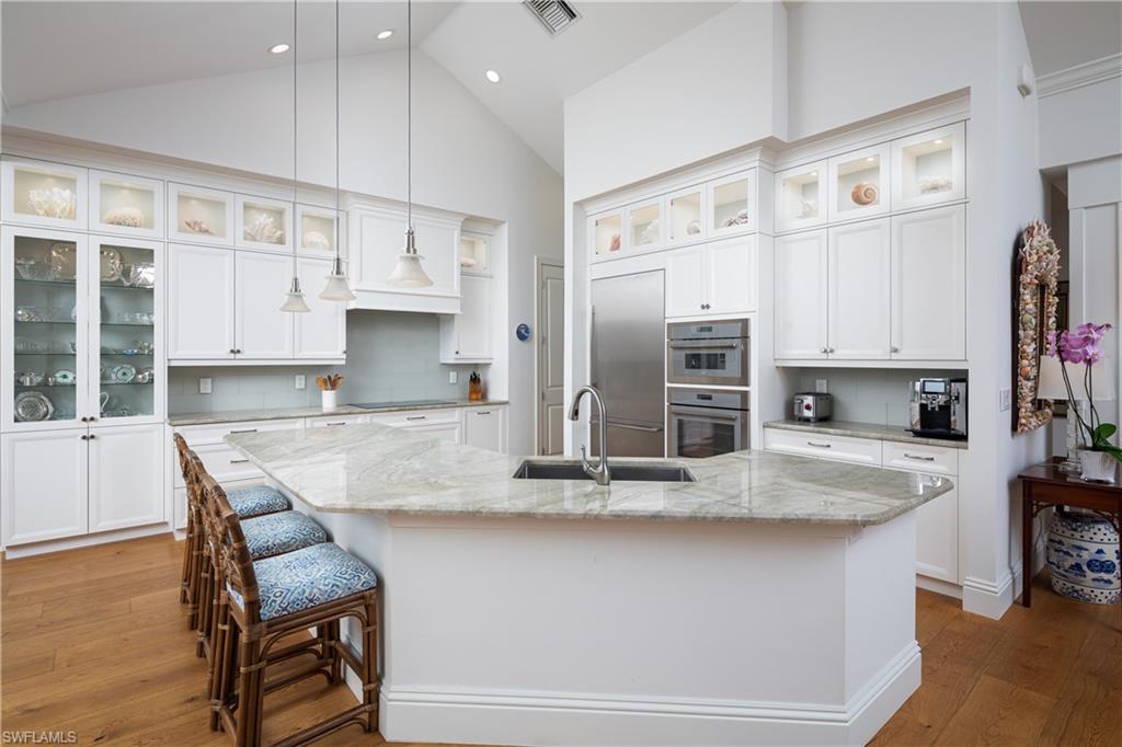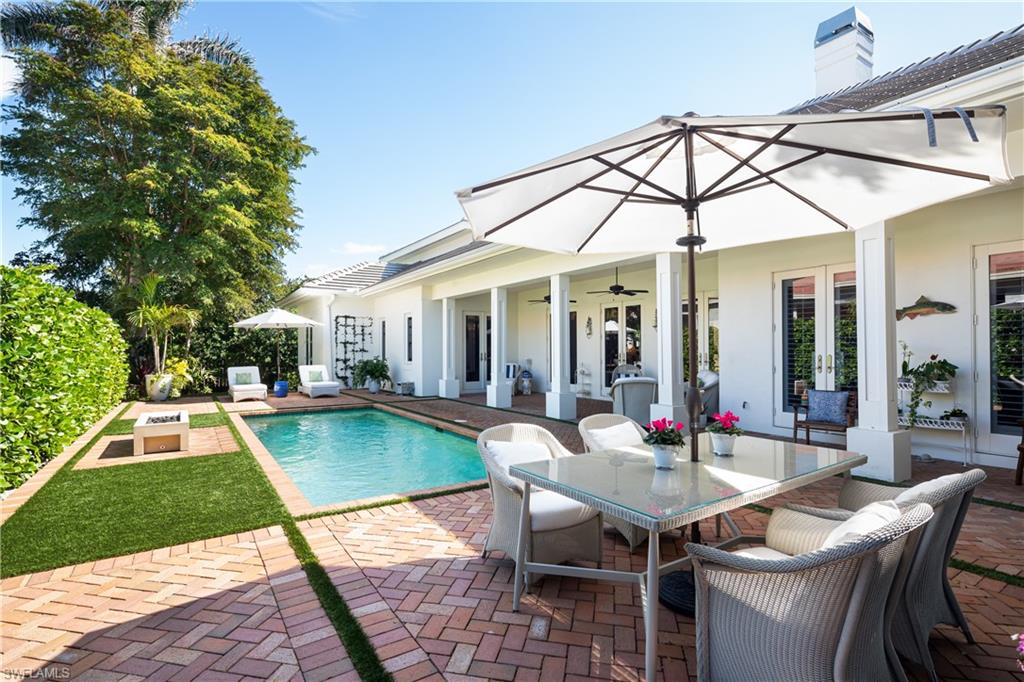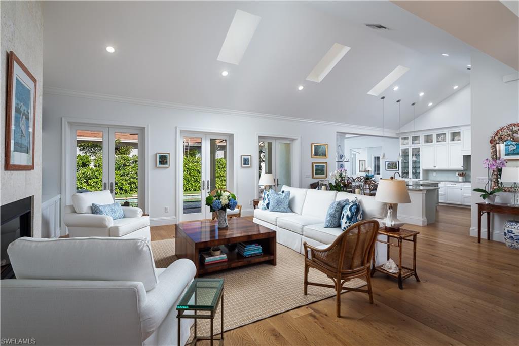 A sophisticated tropical retreat nestled in the heart of the Moorings neighborhood with updates/renovations 2019-2024. Exuding comfort and timeless elegance with a stunning vaulted ceiling Great Room featuring a Coral Stone fireplace. An updated kitchen with Thermador appliances including a 36 inch Induction cooktop, Quartzite counter tops, under counter lighting and custom cabinetry. Multiple French door draw you to a lushly landscaped outdoor area, which includes a covered lanai, heated pool, extended deck and an outdoor fire feature. Four spacious bedrooms, with an expansive and very private 1st floor primary suite with a gorgeous honed dolomite bath and large walk in closet. Additionally there is a first floor en-suite guest room plus two upstairs bedrooms with a nursery-office nook offering multiple family/guest spaces. Wide plank oak floors, crown molding, tremendous closet/ storage space, dry bar with walnut counter top and beverage refrigerator. Built in work center and 2024 cement tile roof. Come take a look at this very special offering. Private Moorings Beach Park is available to all homeowners but it is voluntary.