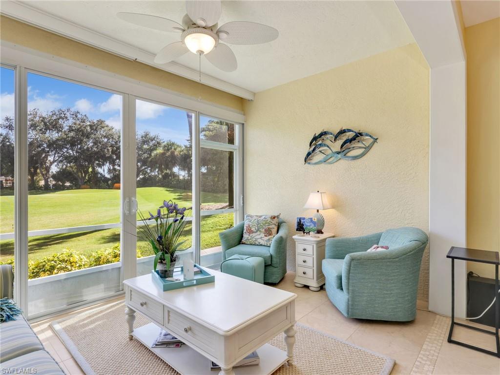 Welcome to this inviting first floor condo in the Carrington neighborhood of Stonebridge, offering comfortable living with one of the best views in the community. This 2 bedroom, 2 bathroom home overlooks the 14th hole green, giving you a front row seat to peaceful golf course scenery. The property is offered turnkey, making it easy to move right in and start enjoying the Stonebridge lifestyle. Inside, the layout feels open and welcoming, with plenty of natural light and an easy flow from the main living area to the kitchen and lanai. The home features plantation shutters throughout, adding a clean, classic touch and enhancing both privacy and style. The updated kitchen features modern finishes, good storage, and a bright breakfast nook. The primary bedroom is spacious and features a tray ceiling for added character. The attached primary bath includes dual sinks and a walk-in shower, offering both comfort and convenience. A guest bedroom and full guest bath provide a private space for visitors. One of the highlights of this home is the impact glassed lanai, which lets you enjoy the gorgeous golf course view in comfort throughout the year. Whether you’re relaxing in the afternoon or enjoying evening breezes, this space truly elevates the home. The building also received a new roof in 2019, the unit has a new AC system in 2023 and water heater in 2020 providing added peace of mind. Living in Stonebridge means enjoying a highly sought after country club lifestyle with amenities that include an 18-hole championship golf course, tennis, a fitness center, dining options, and an active social scene. All of this just minutes from Naples’ beaches, shopping, and restaurants.