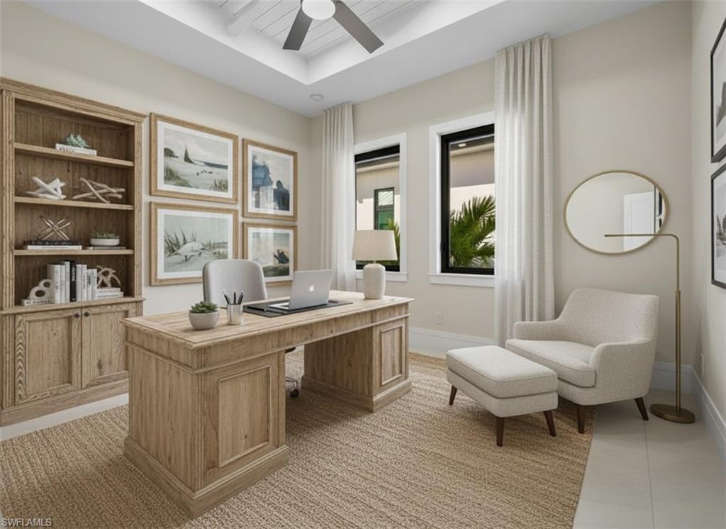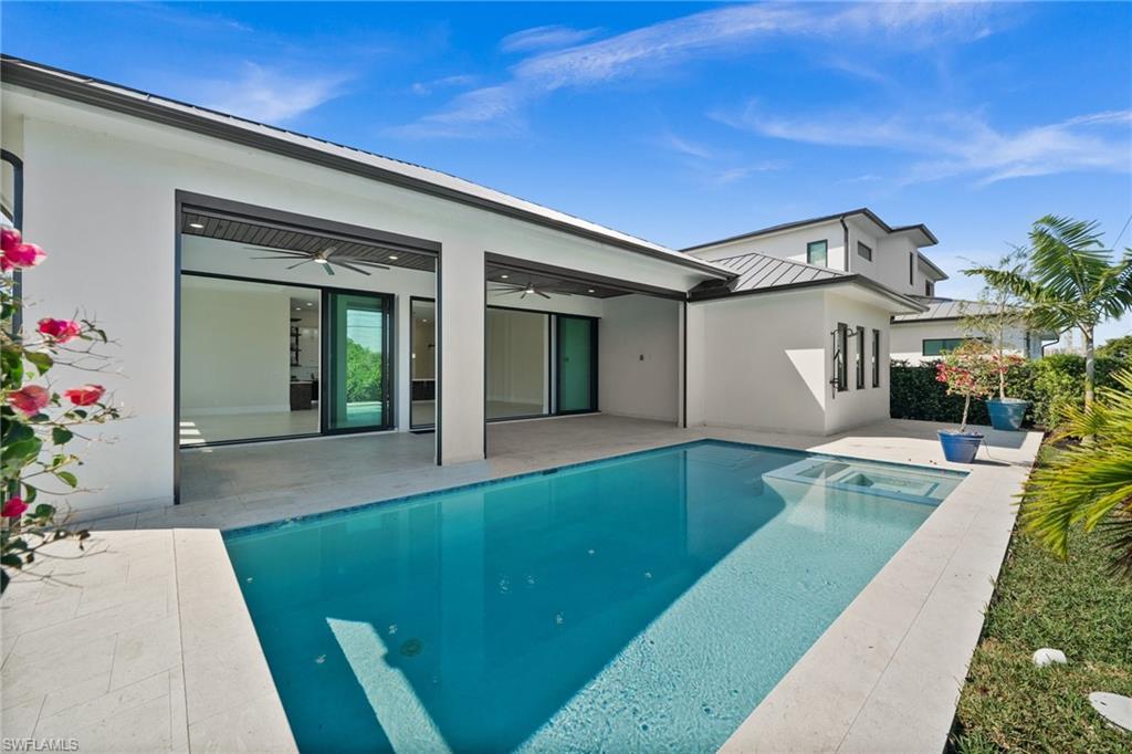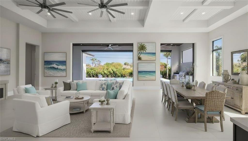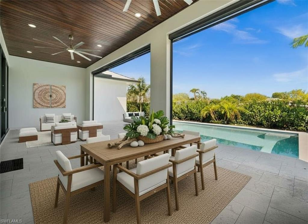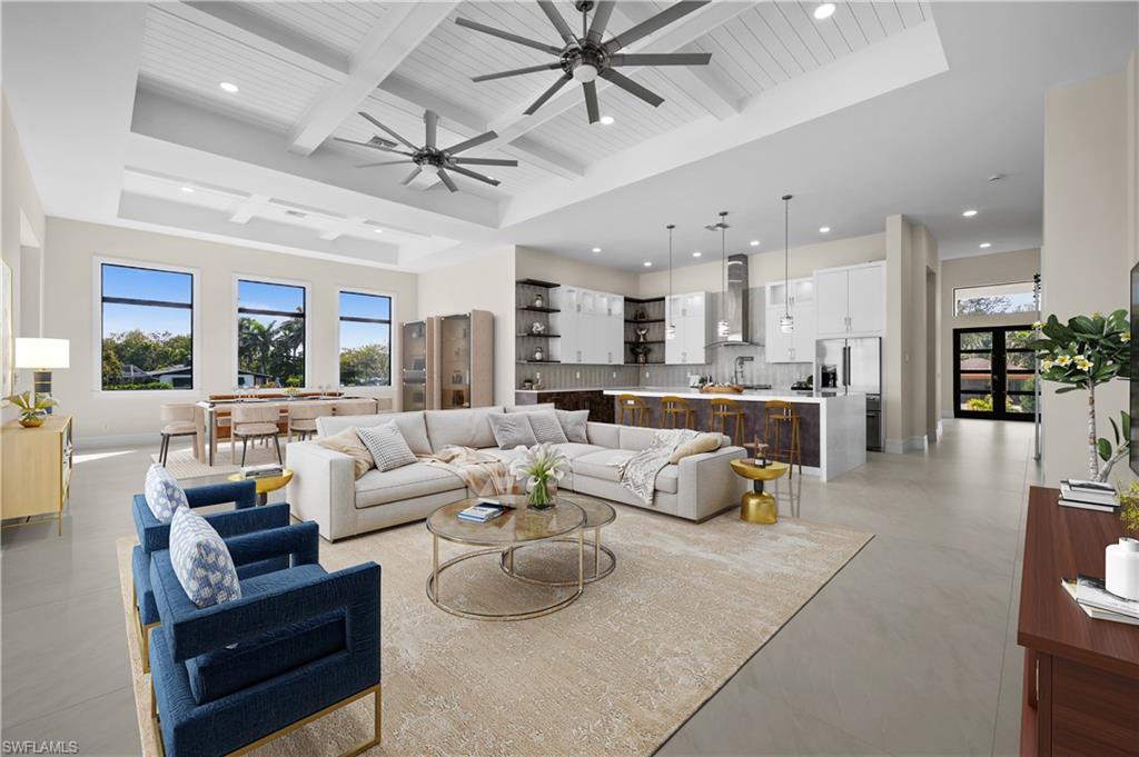 Welcome to Casa Del Sol: House of the Sun! WAY ABOVE REQUIRED ELEVATION (Floods would need their own elevator to reach you here). Experience the pinnacle of modern luxury in this never-lived-in Morningside new build, perfectly positioned in the heart of Naples, just minutes from 5th Avenue and the beach. With 3,275 square feet under air and nearly 5,000 total square feet, this 5-bedroom, 4-bathroom residence blends elegant design with high-end finishes and seamless indoor-outdoor living. Soaring 12-foot ceilings, all impact glass sliders and windows, and retractable screens to enclosed covered lanai space create a bright, open ambiance, while exquisite details like coffered ceilings with wood inlays, 48x48 porcelain tile flooring, and 8.5-inch baseboards elevate the aesthetic. The chef’s kitchen is a masterpiece, featuring a 48-inch, six-burner gas cooktop with a griddle, double ovens, a pot filler, a built-in food warmer, and a stunning 12’ x 5’ waterfall quartz island. A custom-built pantry with a coffee station enhances both function and style. The primary suite is a private retreat, complete with custom closet solutions and a spa-inspired bath featuring an oversized shower with three showerheads, including a rainfall. Frameless glass showers, quartz countertops, and sleek cabinetry add a modern, sophisticated touch throughout. Designed for effortless entertaining, the outdoor oasis boasts a summer kitchen with a 36-inch grill, sink, and beverage fridge, plus a heated saltwater pool with a sunken spa. Travertine pavers and a wood-inlay ceiling add warmth and elegance. A natural gas line powers the water heater, pool heater, cooktop, dryer, and grill for ultimate convenience. Smart home features, including a Lockly Video Smart Lock, air conditioned garage, a 220V EV charger, and an irrigation well for lush landscaping, ensure comfort, security, and efficiency. This home boasts an impressive 15.5 feet of elevation, exceeding the required level—great news for future owners seeking added peace of mind and potential savings on insurance! This exceptional home delivers a rare combination of style, luxury, and location—an extraordinary opportunity to own a slice of Naples paradise.
