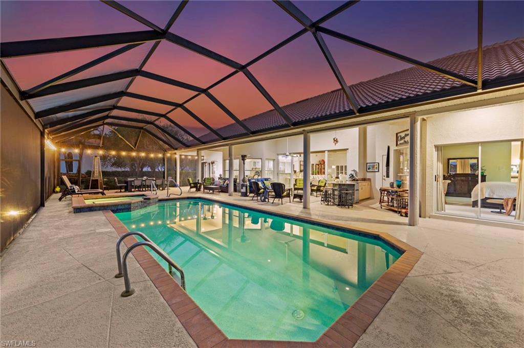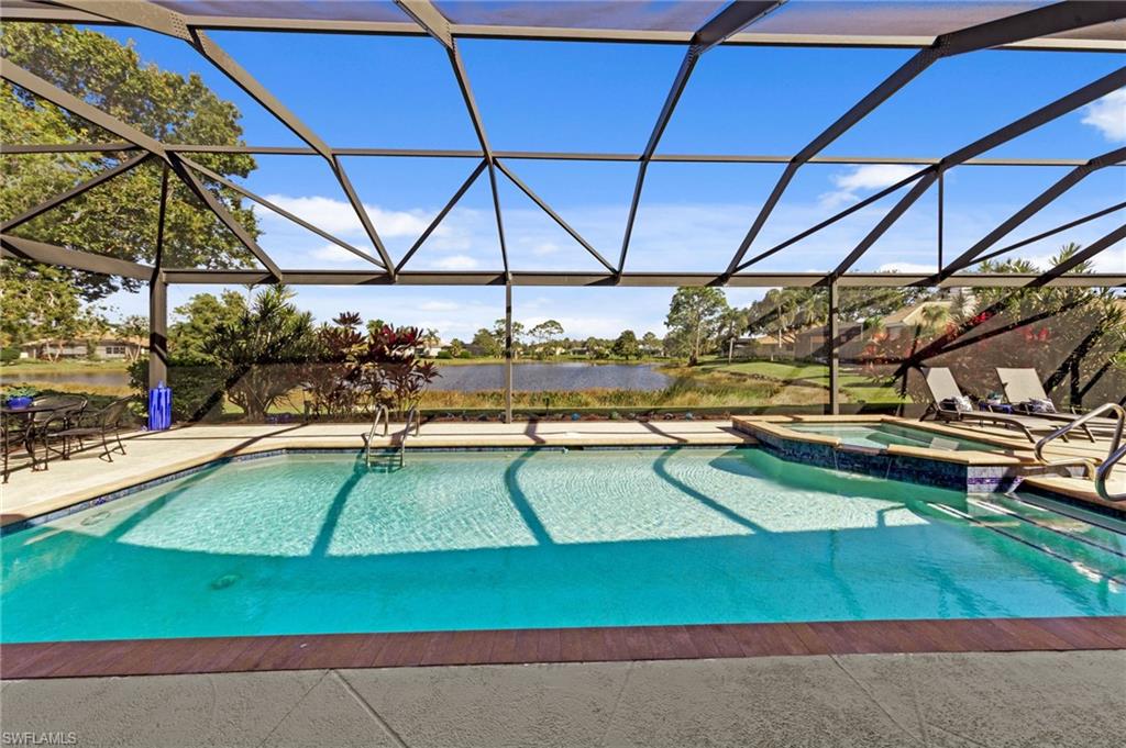 Welcome home to this beautifully maintained 3-bedroom + den, 3-bath residence in Wildcat Run, a private, low-density golf and country club community in the heart of Estero. Set on an oversized lot with a stunning wide water view and desirable Eastern exposure, this 2,755 sq. ft. home offers bright, open living with timeless finishes, a thoughtful 2018 interior remodel, and exceptional outdoor space. Remodeled in 2018, the open floorplan features soaring volume ceilings, custom lighting, an elegant vaulted ceiling, and a versatile den or office. The kitchen includes granite countertops, a tile backsplash, breakfast bar, and a charming breakfast nook overlooking the lake. The primary suite offers lanai access, a large walk-in closet, dual vanities with updated counters and sinks, a Jacuzzi tub, and a floor-to-ceiling tiled walk-in shower. Two guest suites provide comfort and privacy for visitors. Outdoor living shines on the expansive lanai designed to capture the best of Florida living, featuring a heated saltwater pool and spa, a panoramic screen framing the wide lake and golf course view, an outdoor bar, and generous covered space for lounging and dining. Electric roll-down shutters, hurricane screens (2018), and Jandy handheld + WiFi pool/spa controls provide added convenience and peace of mind. Recent improvements include updated pantry cabinetry (2019), landscape updates (2021 & 2023), new gutters (2022), HVAC ductwork (2022), and a new laundry room sink (2024). Additional features include a newer roof (2016), newer A/C (2022), a freshly maintained and painted driveway (2025), and a transferable home warranty available for less than $70/month—offering excellent value and peace of mind for new owners. Wildcat Run is known for its rare ½-acre homesites, custom-built residences, and lush, mature landscaping. Amenities include an Arnold Palmer–designed 18-hole championship course (with no waitlist for golf memberships), tennis, pickleball, bocce, fitness and wellness facilities, and exceptional dining—all minutes from I-75, RSW Airport, Coconut Point, Hertz Arena, and the Gulf beaches. An exceptional opportunity to enjoy refined living, stunning water and golf views, and a premier country club lifestyle in one of Estero’s most desirable communities.
