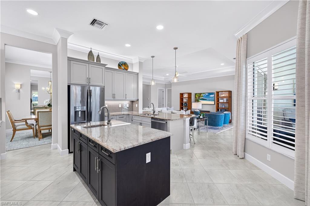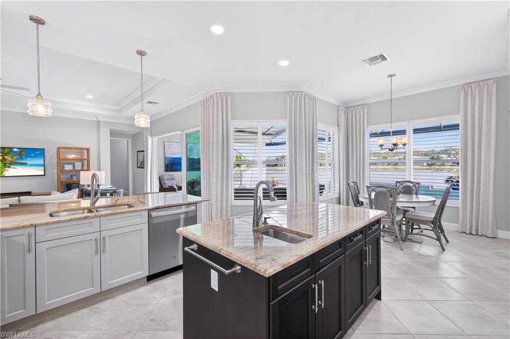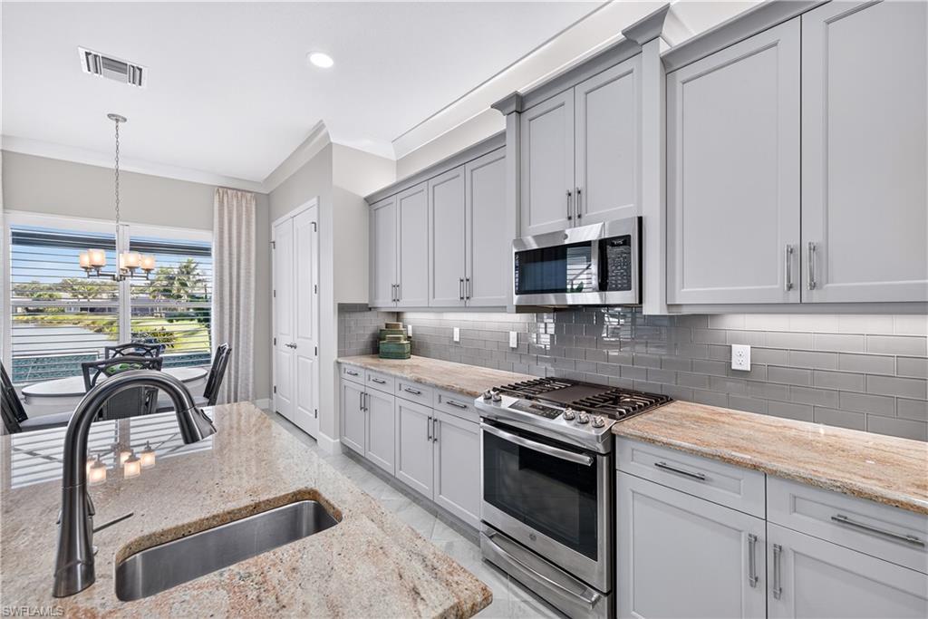Experience elegant living in this beautifully appointed, rarely available Julia model situated on a premium lakefront lot in the highly sought-after community of Valencia Bonita. This spacious 2,878 sq. ft. residence offers three bedrooms plus a den, three and a half baths, and a three-car garage, being sold with furnishings negotiable for a seamless transition. Thoughtfully designed for comfort and style, the home features impact-resistant windows and doors, a glass-front entry door, tile flooring throughout the main living areas, and newly carpeted bedrooms. The open-concept layout creates an inviting atmosphere with a generous living room, formal dining space, and a beautifully upgraded gourmet kitchen ideal for both everyday living and entertaining. The kitchen is a true highlight, offering natural gas cooking, granite countertops, abundant cabinetry, stainless steel appliances, an extended tiled glass backsplash, and both under-cabinet and over-cabinet lighting. A spacious eat-in breakfast area adds convenience and warmth to the heart of the home. The owner’s suite is a serene retreat, complete with two walk-in closets, a large bedroom with tranquil views, an upgraded bath featuring tile finishes, dual vanities, and a walk-in shower. Outdoor living is elevated by a custom-built saltwater pool with a waterfall feature, sun shelf with bubbler, and a full picture-window pool cage that showcases pristine lake views. The extended lanai offers upgraded travertine stone flooring and a ceiling fan, creating an exceptional setting for relaxing or entertaining while enjoying the peaceful water backdrop. Additional interior enhancements include plantation shutters throughout, diagonal tile installed in the main living area, high-hat lighting, a guest bedroom with its own private en-suite bath, and custom cabinetry added to the laundry room. Residents of Valencia Bonita enjoy access to an unmatched 55+ resort lifestyle with a clubhouse, dining, fitness center, tennis, pickleball, and a full calendar of social activities. This exceptional home combines luxury finishes, an ideal open-concept design, and a premium lakefront setting to deliver the essence of effortless Florida living. This is your chance to begin enjoying the best of Valencia Bonita immediately.