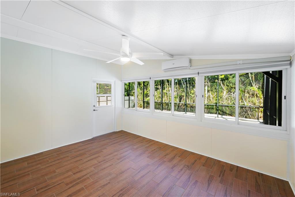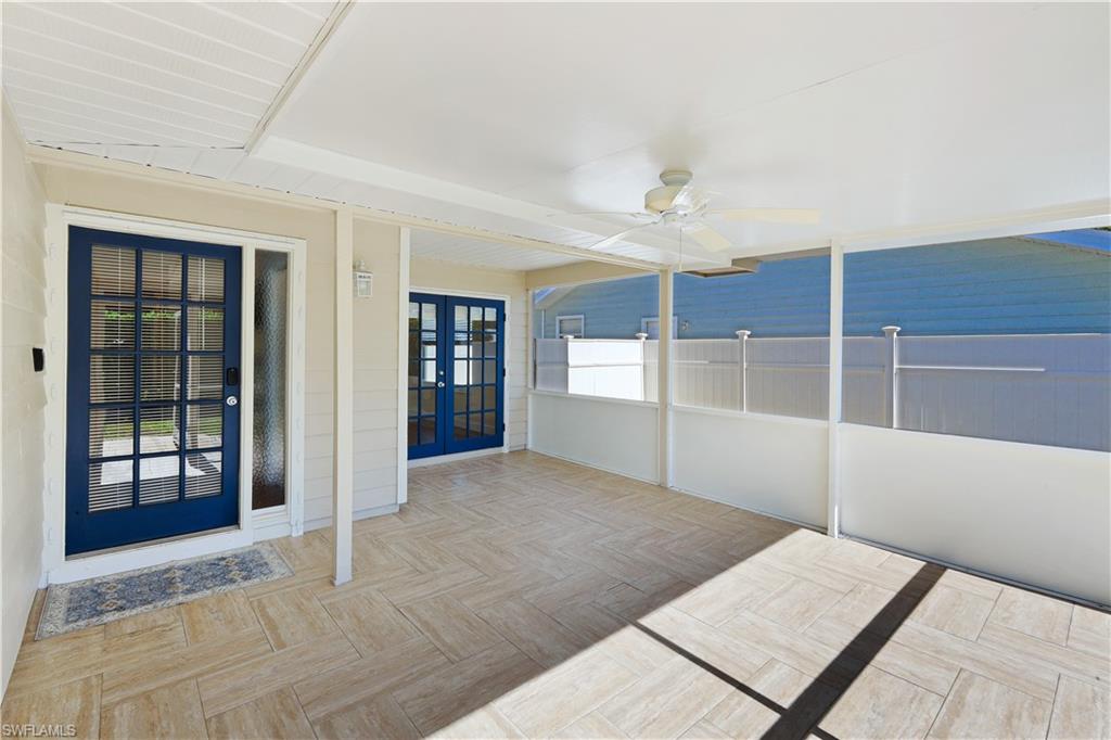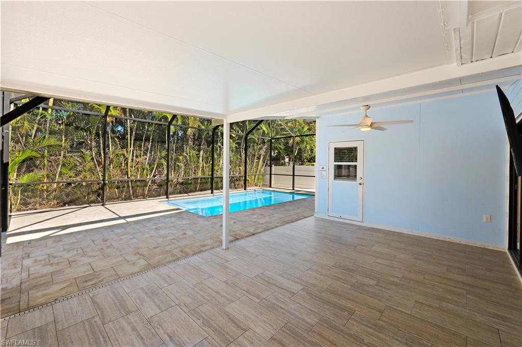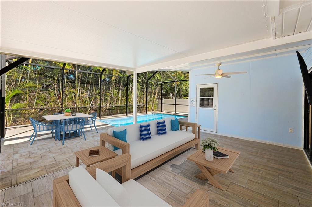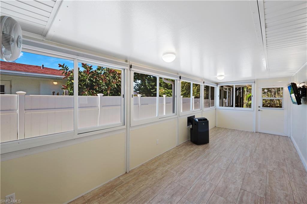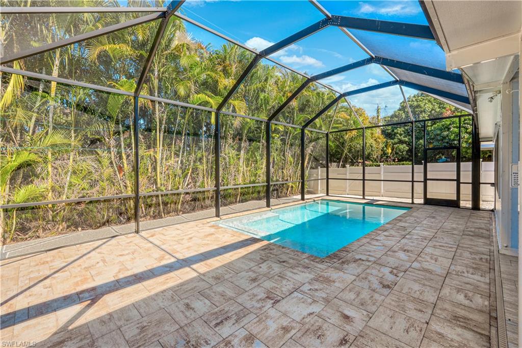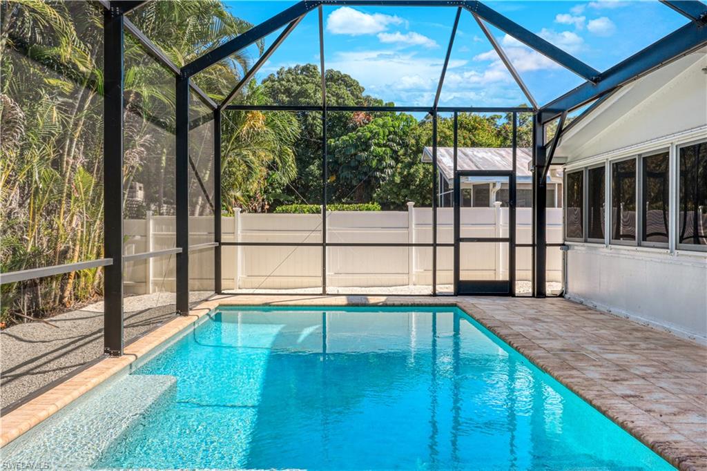 Welcome to your private North Naples oasis, an impeccably maintained, feature-rich home offering comfort, efficiency, privacy, and an unbeatable location. This open-concept residence flows beautifully between the living, dining, and kitchen areas, highlighted by natural light and seamless laminate flooring. The kitchen includes a water-filtration system and opens to the main living spaces, making it ideal for daily living and entertaining. The flexible primary bedroom extension is perfect for a nursery, home office, fitness room, or dressing suite, complete with mini-split AC, insulated roof, and peaceful pool views. The updated primary bath features modern tilework and a glass shower door. Guests will enjoy their own bedroom with a queen Murphy bed and direct access to the saltwater pool. The guest bath offers a tub/shower combo and granite counters. Additional living spaces include a west-side enclosed porch with slider windows (2019), portable AC, and custom shades, plus a welcoming front porch (2019) with insulated roof and French doors. Outdoors, enjoy the newer saltwater pool (2020), covered lanai (2020), storm-smart screens, outdoor shower, tall palms, crushed coquina, and full privacy from fencing and mature hedges. Practical upgrades include a fully insulated garage with epoxied floor and utility sink, tankless water heater (2019), Trane HVAC (2020), repainted cedar siding (2021), two propane tanks for gas cooking, gutters, TV antenna with booster, and xeriscaping with two irrigation zones. The propane was set up to provide fuel for a generator if desired, and to fuel the stove. Roof and wind-mit reports show long remaining life. Located in Flood Zone X500 with a transferable flood policy, and there are storm screen panels for hurricane protection, both offering significant insurance savings. All of this is just minutes to Mercato, Vanderbilt Beach, The world-famous Ritz-Carlton Naples Beach Resort, and top dining and entertainment in an A-rated school district. Perfect as a full-time home, seasonal retreat, or high-demand rental. Opportunities like this are rare...this home is a must-see.