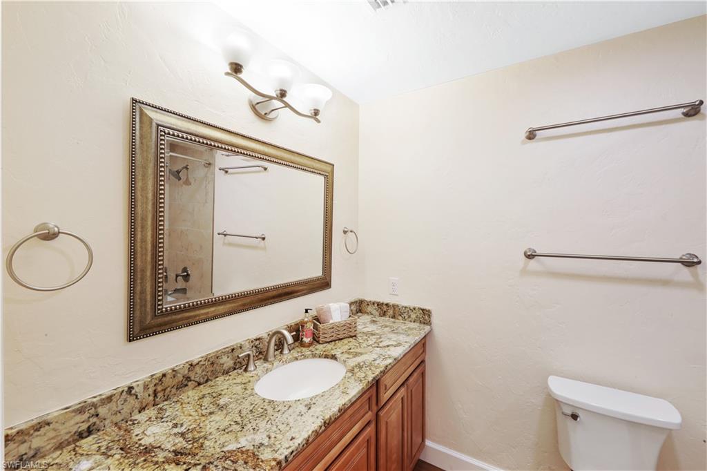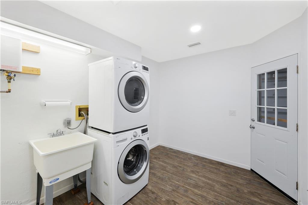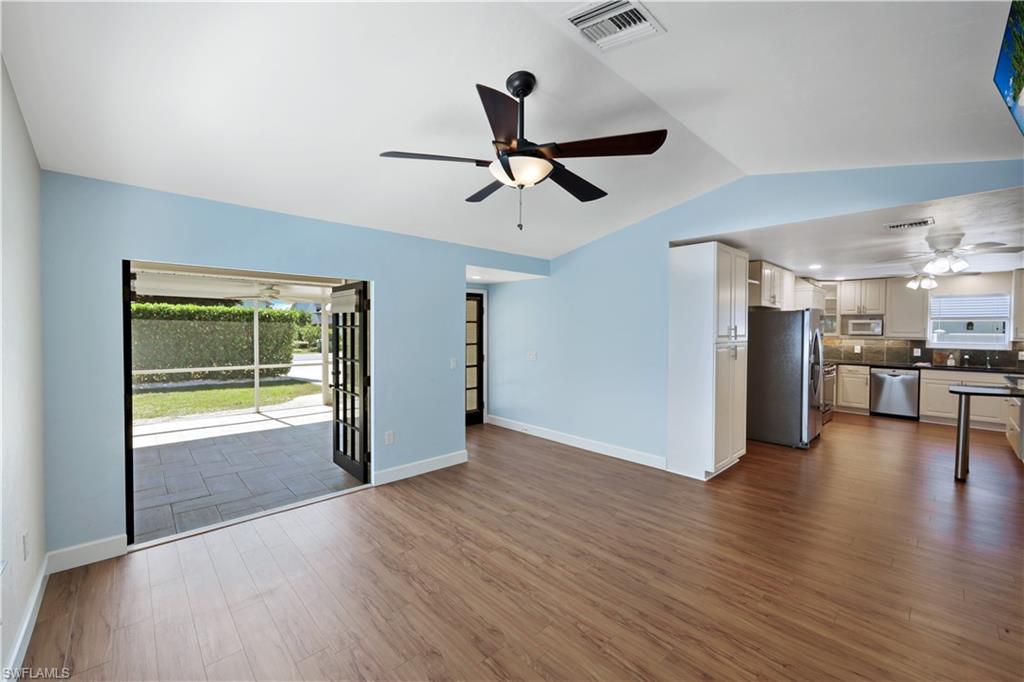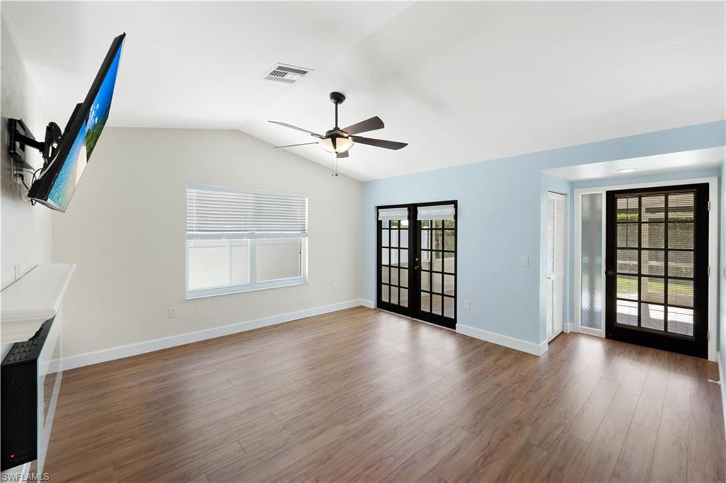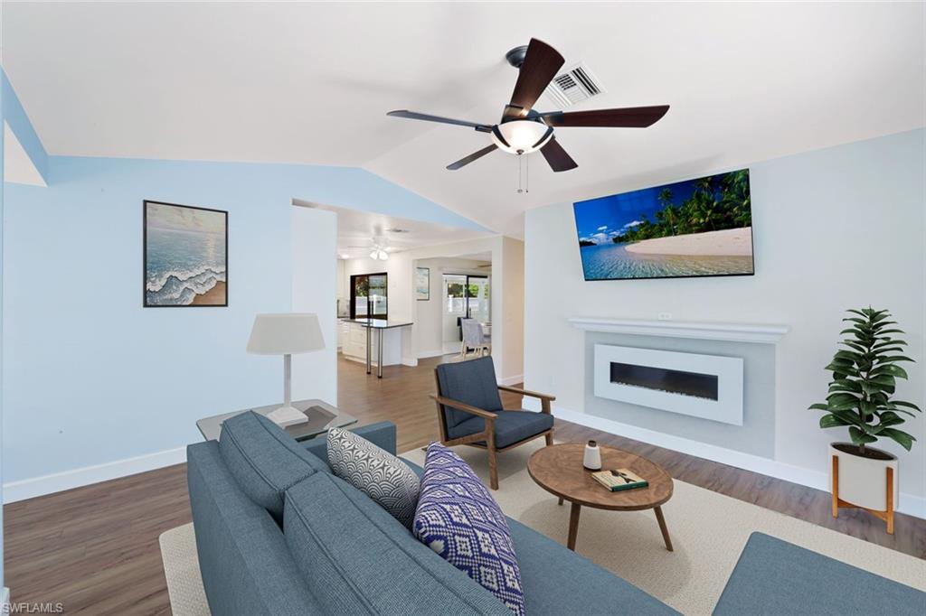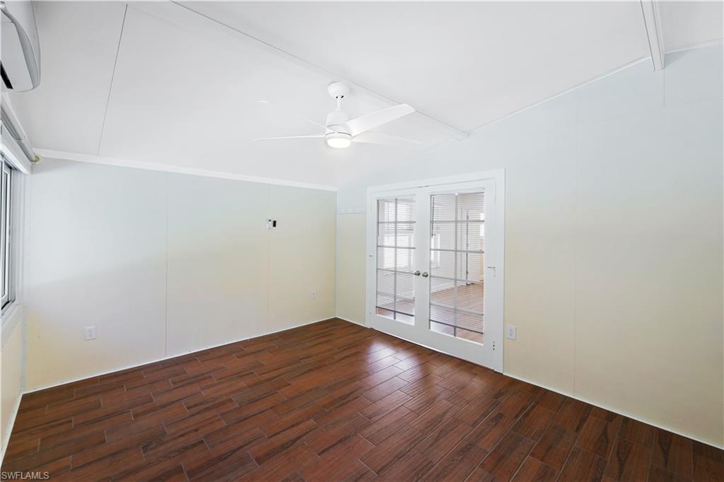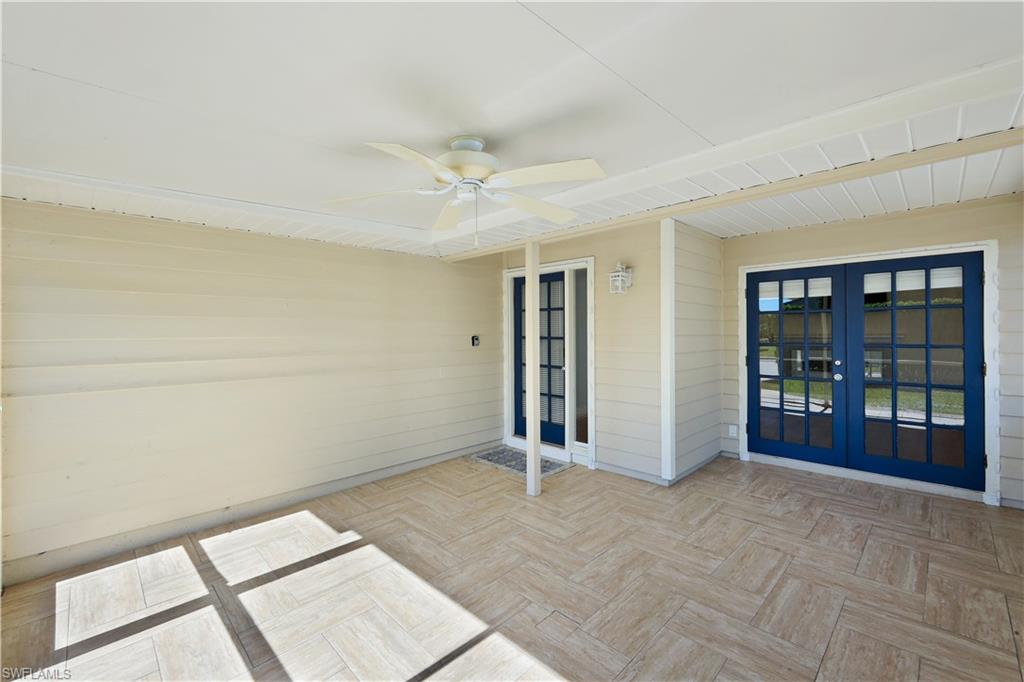 Welcome to your private North Naples oasis, an impeccably maintained, feature-rich home offering comfort, efficiency, privacy, and an unbeatable location. This open-concept residence flows beautifully between the living, dining, and kitchen areas, highlighted by natural light and seamless laminate flooring. The kitchen includes a water-filtration system and opens to the main living spaces, making it ideal for daily living and entertaining. The flexible primary bedroom extension is perfect for a nursery, home office, fitness room, or dressing suite, complete with mini-split AC, insulated roof, and peaceful pool views. The updated primary bath features modern tilework and a glass shower door. Guests will enjoy their own bedroom with a queen Murphy bed and direct access to the saltwater pool. The guest bath offers a tub/shower combo and granite counters. Additional living spaces include a west-side enclosed porch with slider windows (2019), portable AC, and custom shades, plus a welcoming front porch (2019) with insulated roof and French doors. Outdoors, enjoy the newer saltwater pool (2020), covered lanai (2020), storm-smart screens, outdoor shower, tall palms, crushed coquina, and full privacy from fencing and mature hedges. Practical upgrades include a fully insulated garage with epoxied floor and utility sink, tankless water heater (2019), Trane HVAC (2020), repainted cedar siding (2021), two propane tanks for gas cooking, gutters, TV antenna with booster, and xeriscaping with two irrigation zones. The propane was set up to provide fuel for a generator if desired, and to fuel the stove. Roof and wind-mit reports show long remaining life. Located in Flood Zone X500 with a transferable flood policy, and there are storm screen panels for hurricane protection, both offering significant insurance savings. All of this is just minutes to Mercato, Vanderbilt Beach, The world-famous Ritz-Carlton Naples Beach Resort, and top dining and entertainment in an A-rated school district. Perfect as a full-time home, seasonal retreat, or high-demand rental. Opportunities like this are rare...this home is a must-see.