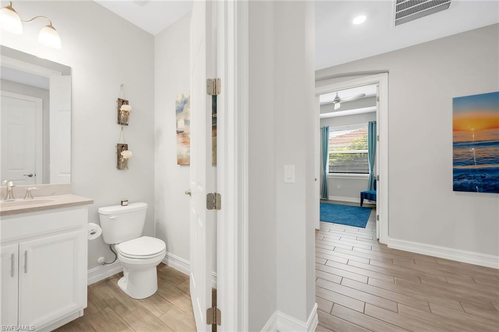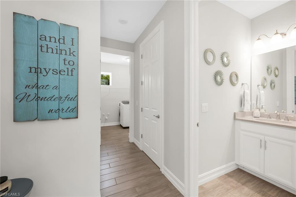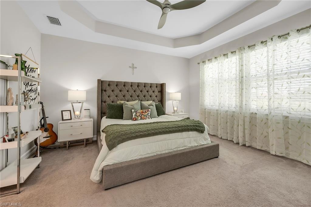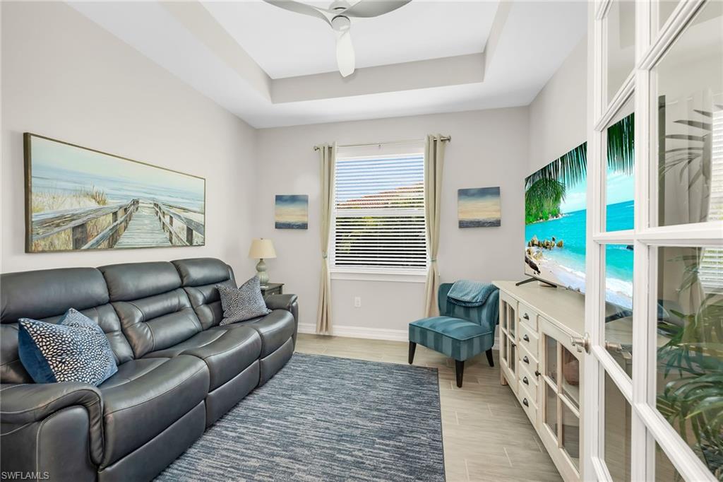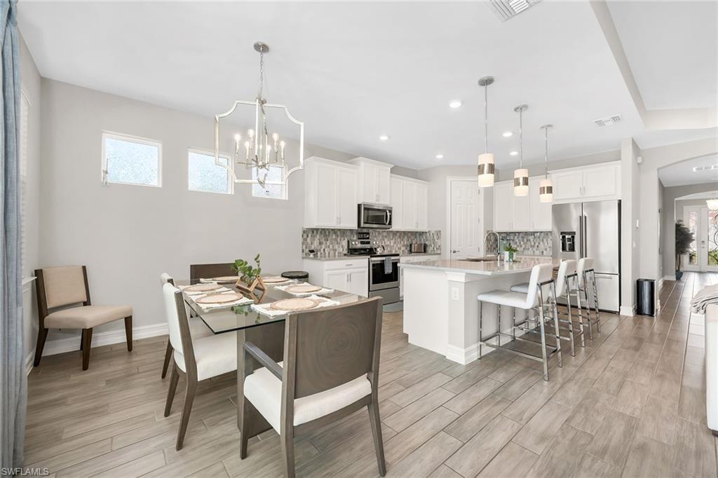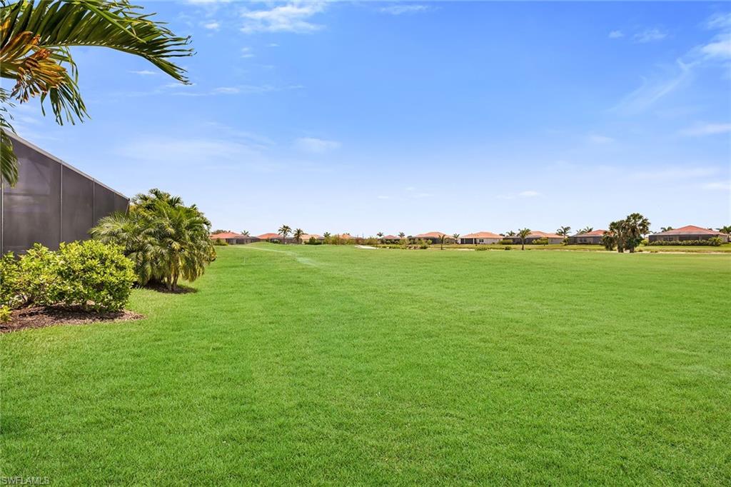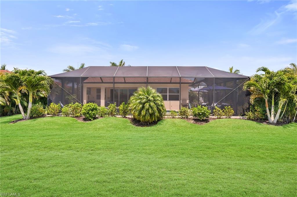 Welcome to this beautifully maintained single-story home in the gated community of Royal Palm Golf Estates. Offering three bedrooms plus a den, two full and two half baths, this residence blends luxury with everyday comfort. With serene golf course views, southern exposure and thoughtful upgrades throughout, this home is the epitome of Florida living. As you enter through the upgraded glass front door, you’re greeted by a long, welcoming hallway with ceramic tile flooring and freshly painted walls. The open-concept great room features a tray ceiling and large impact sliders that allow for an abundance of natural light and seamless indoor-outdoor living. The heart of the home is the kitchen, showcasing a large center island with a Sterling sink and Moen faucet, granite countertops, a tile backsplash and stainless steel appliances including a KitchenAid refrigerator and Whirlpool oven, microwave and dishwasher. Three pendant lights over the island add a stylish touch, while the adjacent dining area offers a cozy and light-filled space with a large chandelier. Just off the main living area, the French door entry to the den can be utilized as a home office, library or guest space. The spacious primary suite is a peaceful retreat with tranquil views and a large walk-in closet. The en-suite bath is spa-inspired, complete with a soaking tub, a walk-in glass shower with double shower heads, granite countertops and dual vanities. On the opposite wing of the home, two additional guest bedrooms offer privacy and comfort with a full guest bath. Outdoor living is exceptional in this home. Go out onto the screened lanai, complete with no-see-um mesh screening for year-round comfort, a custom saltwater pool and spa, with jets and a new pool pump, and a pool bath offer a place to unwind while enjoying tranquil golf course views. The spa is thoughtfully placed to create a stunning water feature visible from the entry, enhancing the home’s ambiance. Privacy palms and blooming gardenia bushes planted along both sides of the property create a lush and secluded outdoor sanctuary. Additional features include a freshly painted interior, impact sliders, manual shutters, a spacious laundry room with Samsung top-load washer and dryer, a storage closet with air handler and a large pantry. The oversized three-car tandem garage with painted concrete flooring provides exceptional storage and flexibility, offering more space than any other model in the neighborhood. In the gated, pet-friendly Royal Palm Golf Estates community, this home benefits from low HOA fees and allows golf carts on neighborhood streets. Residents have access to Eagle Lakes Golf Club, a public course with a clubhouse, restaurant and bar. Just minutes from the sugar-sand beaches of Marco Island and upscale shops and dining on Naples lively Fifth Avenue, this home is positioned for a lifestyle of coastal charm and casual sophistication.