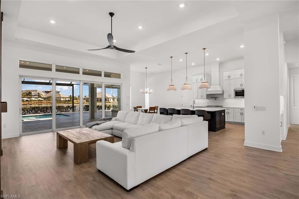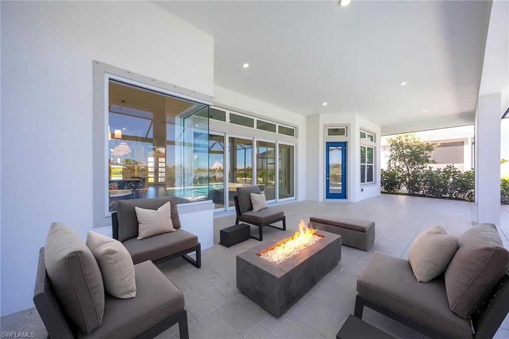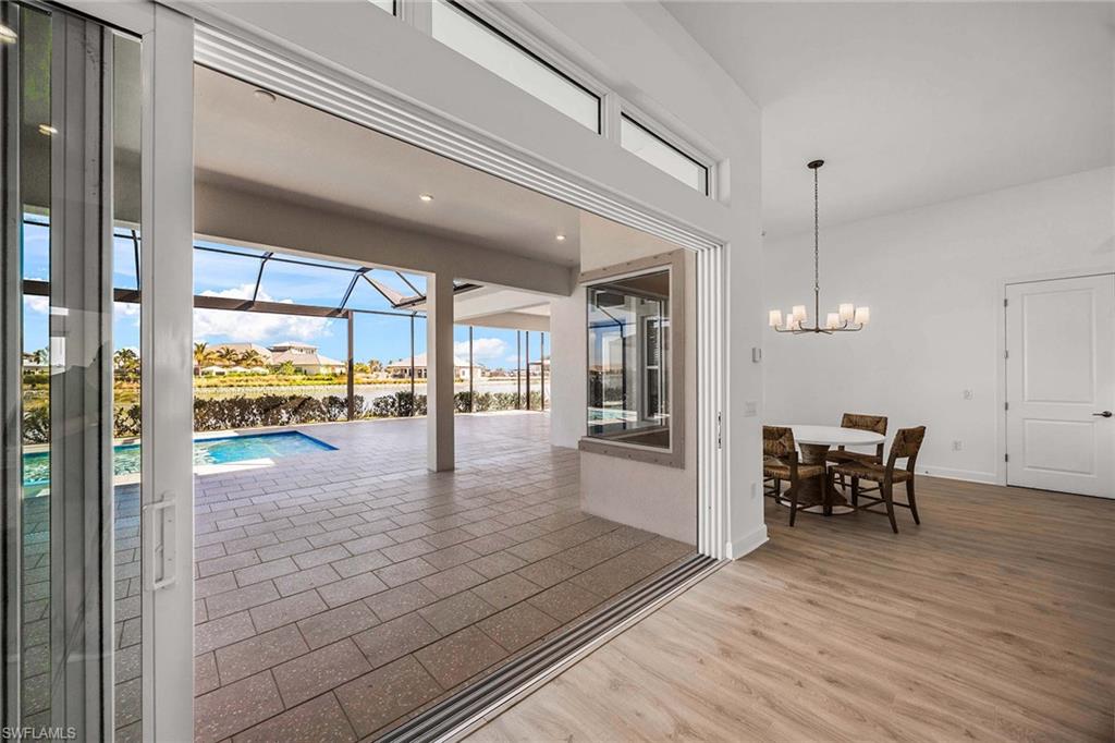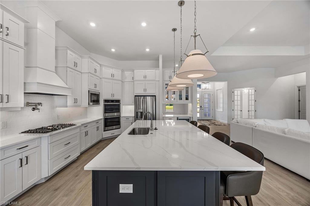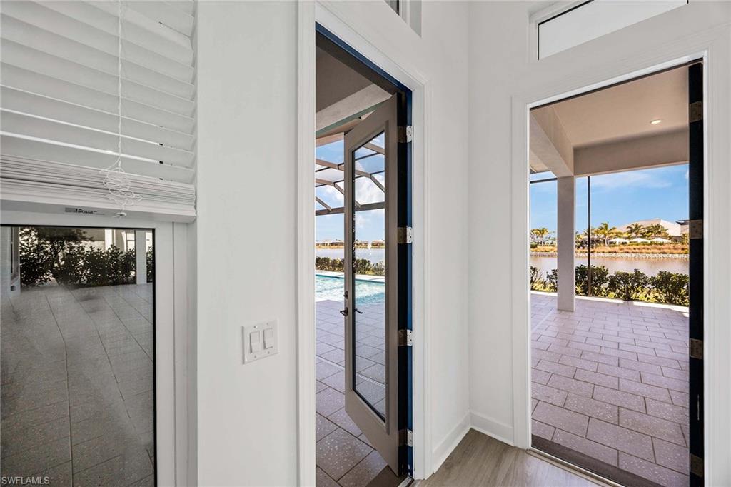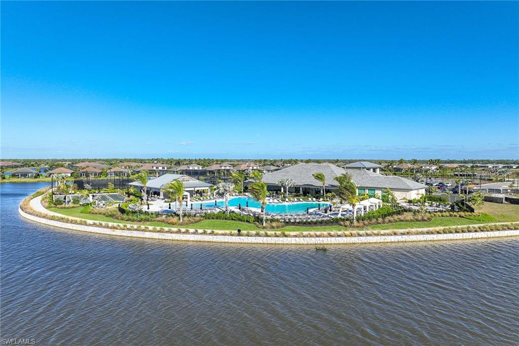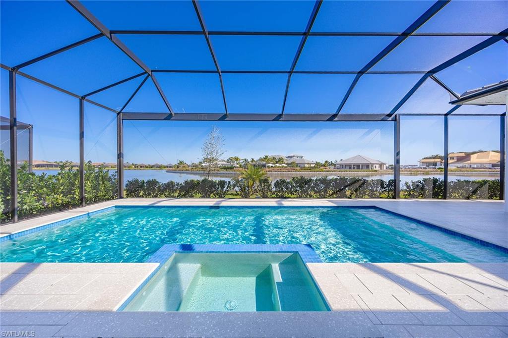 Waterfront luxury home with panoramic views! Experience wide-water views and exceptional coastal living in this luxurious four-bedroom, six-bath Beacon model located in the highly sought-after Esplanade by the Islands community. This never-lived-in, two-story residence is positioned on an oversized waterfront lot and shows like a professionally designed model home. Step inside to discover high-end finishes, an upgraded chef's kitchen with premium cabinetry and quartz countertops, and expansive hurricane-impact windows, sliders and doors that frame the breathtaking views. The great room features a stunning fireplace and seamless indoor-outdoor flow. Resort-style living continues outdoors with a custom-designed pool and spa, panoramic screen enclosure, and a fully equipped outdoor kitchen, ideal for entertaining. The second level offers additional bonus spaces, including a wet bar, ideal for guests and gatherings. This home also includes a Generac whole-house generator for peace of mind and year-round comfort. Residents of Esplanade by the Islands enjoy world-class amenities, including a resort-style pool, on-site restaurant, pickleball, tennis and a state-of-the-art fitness center, all just minutes from the renowned shops, dining and beaches of Fifth Avenue. Photos are virtually staged.
