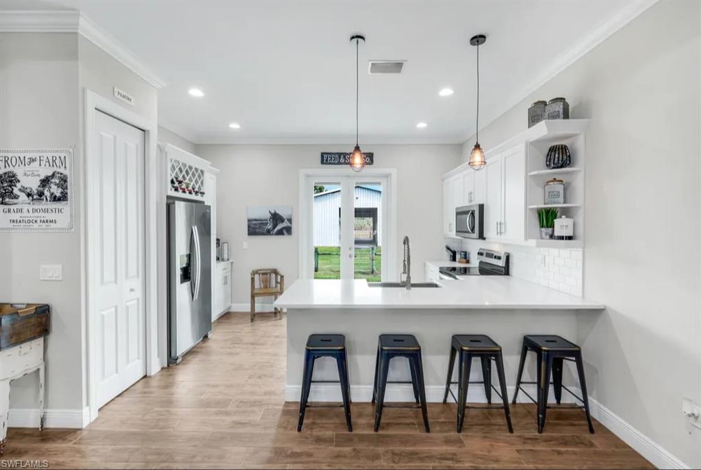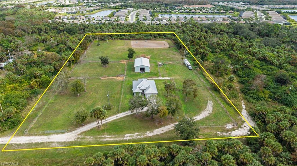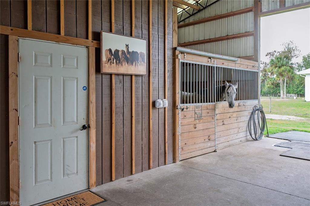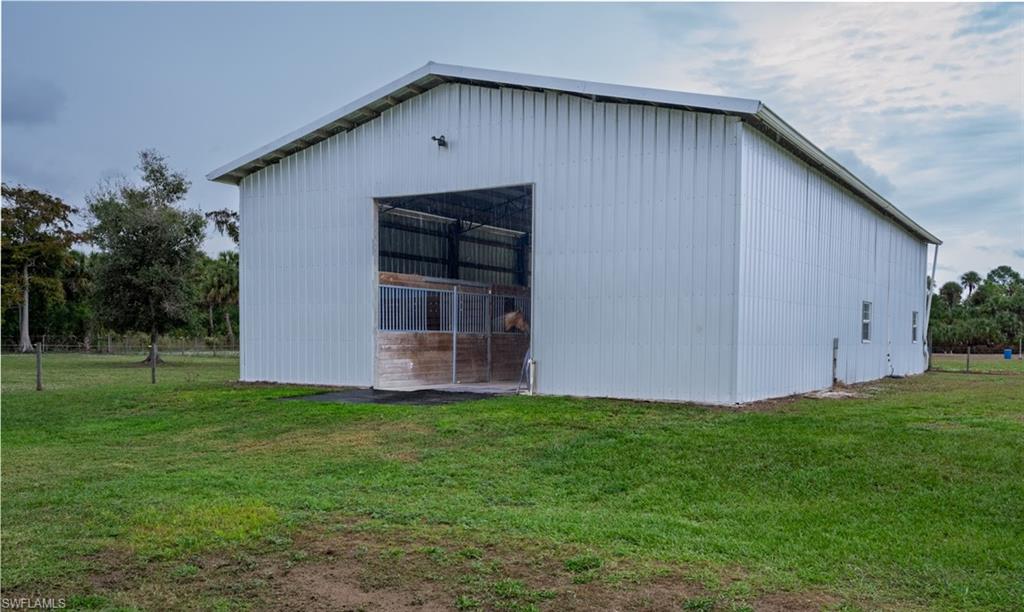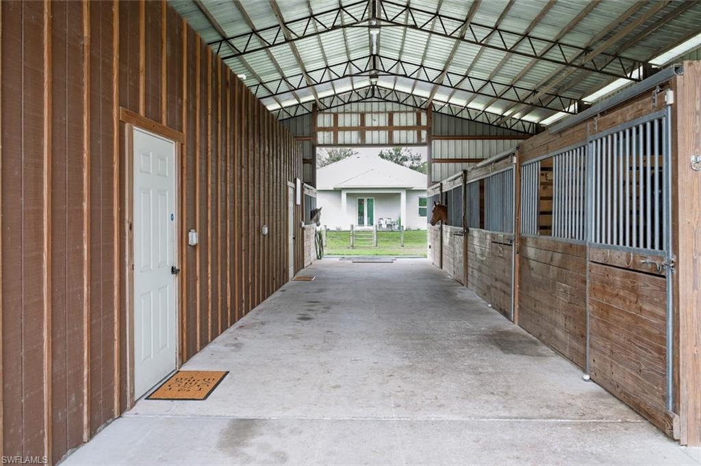 NORTH NAPLES, nearly **5 ACRES** IN TOWN!! PROPERTIES WITH THIS TOTAL PRIVACY **IN TOWN** DO NOT EXIST IN NAPLES ANYMORE, and there is NOTHING ELSE LIKE IT BEING OFFERED IN NORTH NAPLES. GORGEOUS TURNKEY FURNISHED HOME and HUGE 48x60 SHOP/BARN/OUTBUILDING. Live in total privacy with **NO NEIGHBORS IN SIGHT** yet have all the luxuries of town surrounding you? You've found it, and you won't find it anywhere else in this town. Behind you is a preserve separating you from the resort gated community of Valencia Trails, and in front of you is COUNTY PRESERVE that will never be touched. The result? Privacy that Naples can no longer offer. HOME is end of 2018 built, Concrete Block, ALL IMPACT GLASS DOORS AND WINDOWS, and LIFETIME STANDING SEAM METAL ROOF!!! This is a custom home - high ceilings with trays, minimum 10 foot and higher, custom crown molding/baseboards, wood plank tile flooring throughout, quartz countertops, farm sink, subway tile backsplash, shaker/soft close cabinets in kitchen, and river rock showers in spa-like bathrooms bring farmhouse style luxury and comfort. Enjoy serene views from your back French Doors, looking out to your barn and horse pastures. The property has in total 4 BEDROOMS PLUS DEN, 3 FULL BATHS, 2 CAR GARAGE. The Bonus Guest Apartment located in the barn is included in this count, having 1 bedroom, 1 bathroom, and its own kitchen and living area- perfect for In-laws, adult children, or guests. 48x60 BARN with concrete center aisle was built extra tall in case a future owner would want to convert it to RV storage or a shop! Horse stalls can easily be converted to parking space for someone that owns a business and needs to park machinery or trucks. In addition to the Barn Apartment for guests, in the barn there are 5 horse stalls, a storage room for Horse Feed or Tools, and a wash bay. There are 4 Separate Horse pastures, and a riding arena with groomed dirt. Property is Cleared, fenced, barn is gated and offers a separate driveway for your large equipment, horse trailers, trucks- no limitations to what you can store, park, and turn around here. Business owners, this is you! Live here and park your equipment here!