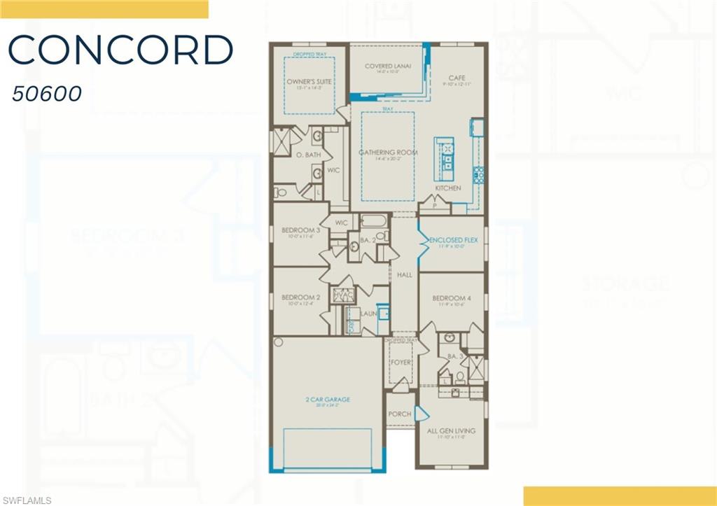 This Concord floorplan is a true multigenerational home offering 4 bedrooms, 3 bathrooms, and an enclosed flex room designed for versatility and comfort. At the front of the home, a private AllGen suite features its own entrance, living area, kitchenette, bedroom, and full bathroom—ideal for guests, extended family, or independent living arrangements. Thoughtful upgrades include a 4' garage extension, built-in kitchen appliances, an AllGen exterior door, zero-corner sliding glass doors, and laundry room cabinets with a sink and countertops. Tray ceilings in both the gathering room and owner’s suite add an elevated touch. Pulte’s AllGen design emphasizes both connection and privacy, blending expansive shared spaces with private suites to accommodate today’s modern multigenerational lifestyle. Terreno by DiVosta is a gated community offering a resort lifestyle with open floor plans, gourmet kitchens, and large outdoor living spaces. For those looking for resort lifestyle communities with private amenities and modern houses, or luxury homes for sale in Naples, FL, Terreno should be your top choice. Neighborhood features include 15,000 sq. ft. grand clubhouse with large community room for events, catering kitchen, state-of-the-art fitness center, exercise studio, 8 pickleball courts, 2 tennis courts, dog park, playground, firepit lounge, dog park, resort style pool, lap lanes, heated spa, full-service restaurant bar & grill, food truck drive-up, 18-hole public golf-course next door & more!