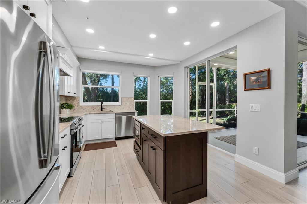 Stunning first floor end-unit carriage home with serene preserve view offered furnished (with exclusions). Agents see remarks. BRAND NEW A/C UNIT JUST INSTALLED! Open kitchen with soft-close cabinets, pantry with roll out shelving, Samsung stove with convection oven and custom hood, built in Samsung microwave in kitchen island and double door GE refrigerator. The bathrooms feature frameless showers and a tub with modern tiles and fixtures. Ceramic wood plank flooring throughout, new impact windows with brand new custom blinds, electric roll down impact shades on lanai. All plumbing updated and tankless hot water heater installed. Radon mitigation system in place. Pelican Landing is known for its unparalleled amenities, including a private 34-acre island for residents accessed via private water taxi, robust tennis and pickleball programs, fully equipped fitness center and miles of tree-lined walking paths. The Nest (optional membership) offers two 18-hole golf courses that wind through the neighborhood, plus exquisite dining and social activities.