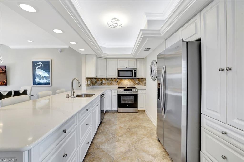 Rarely available top-floor corner residence at Villa Del Mare, showcasing sweeping views of Smokehouse Bay! This beautifully updated condo features tile flooring throughout, impact-resistant windows and doors, and a bright, open-concept design. The modern kitchen overlooks the living area and balcony, highlighted by quartz countertops and stainless-steel appliances. Offering 2 bedrooms, 2 full bathrooms, and a full-size washer and dryer, this spacious waterfront residence blends comfort with everyday convenience. The expansive balcony is ideal for relaxing and enjoying the bay views, and it includes a generous storage closet for added functionality. Just a 5-minute stroll to The Esplanade, you'll experience premier island living with shops, dining, and entertainment right at your fingertips. Villa Del Mar residents enjoy a large waterside pool, a common dock for boating, and this unit comes with covered parking space #10—perfectly positioned next to the elevator. Opportunities like this are rare—secure your piece of premium waterfront living today!
