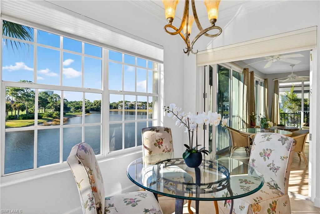 If a gorgeous, western lake and sunset views sounds perfect to you, welcome to this 2nd-floor coach home that lives like a single-family residence in Merano at The Colony. This home, with a private elevator, has recently installed category 5 UV protected windows creating an enclosed lanai providing almost 3,000 total square feet of living space. The bright and sunny kitchen allows for informal dining while taking in the water views while the formal dining area lends itself to easy entertaining with a wet bar adjacent to the space. The split floor plan allows for privacy with 2 guests suits and cozy den for quiet reading or movie night utilizing the TV/sound with a Sony sound system with five quality UTL speakers. The bonus room at the front of the home allows for a small office or extra storage. The enclosed lanai looks over the natural landscape teeming with wildlife enjoying the large pond. With it’s large, oversized 2-car garage and ability to grill outside the front of the home, this condo gives you all of the benefits of a single-family without the hassle. Additionally, the home is located in an ‘X’ flood plain. Merano neighborhood was updated this past year with new roofs, gutters, exterior lighting and fresh paint color. New landscaping is currently underway. Merano HOA fee remains the lowest for condo homes in the Colony. There's no milestone requirement for this community. Amenities for Colony residents include dining at the Colony’s private and newly renovated Bay Club with unparalleled views of Estero Bay and kayak park. Pelican Landing amenities included in the HOA- private beach park with boat shuttle access from the community, tennis center, pickle-ball, bocce, attended fitness center and kayak park. Optional golf and sports memberships may be available at the Colony Golf Club and The Nest Country Club. Nearby there is the large, popular Coconut Point Mall and fabulous restaurants. Merano is a secure, gated community minutes away from Naples and Fort Myers, about 3 hours by air from New York, Chicago, and Toronto, and 20 minutes from the Ft Myers airport.