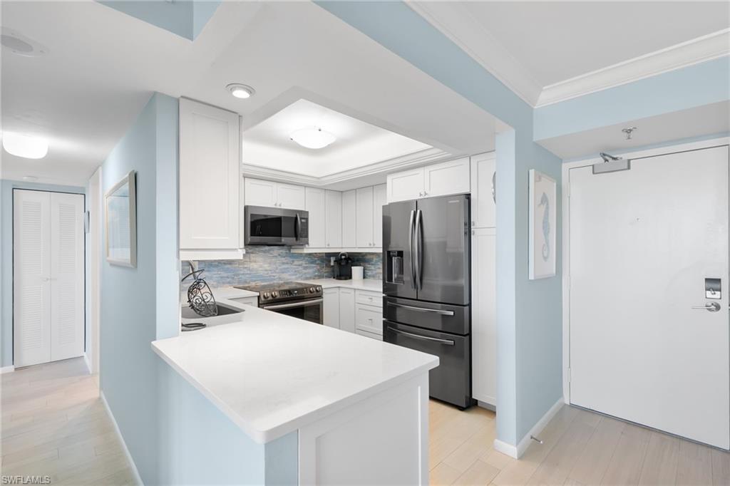 Stunning 16th-Floor Beachfront Condo with Panoramic Gulf & Island Views Enjoy breathtaking, uninterrupted views of the Gulf of Mexico, Tigertail Beach, Hideaway Beach, and Marco Island from this beautifully remodeled 16th-floor beachfront condominium. Fully furnished and offering 2 bedrooms, 2 baths and 1,010 square feet of stylish living space, this residence blends modern luxury with refined coastal charm. From the moment you enter, you’ll be captivated by the expansive vistas, natural light, and open layout. Both daytime scenes and nighttime island lights are equally spectacular, with every room designed to showcase the views. The interior features tile flooring, crown molding, and recessed lighting for a bright, polished look. The upgraded kitchen boasts a tray ceiling with indirect lighting, Samsung stainless-steel appliances, white shaker cabinetry, quartz countertops, and a striking blue tile backsplash. It opens seamlessly to the dining area, highlighted by a built-in sideboard and full-width mirror that reflects the endless scenery. The living room’s glass slider frames wide water and beach views and leads to the massive 30+ foot covered balcony, where you can relax to the sound of the waves and gentle gulf breezes. The owner’s suite features direct balcony access, stunning views, and an updated en-suite bath with a walk-in shower featuring a waterfall tile design. The guest bedroom also enjoys balcony access and sweeping views, with a full bath conveniently nearby. Additional features include hall storage closets and hurricane-impact sliders throughout. Located within the highly sought-after South Seas community, residents enjoy resort-style amenities including guard-gated entry, a heated pool and spa, fitness center, tennis and pickleball courts, bocce, shuffleboard, EV charging stations, bike storage, boat docks with slips, and private beach access. Ideally situated near Marco Island’s boutiques, restaurants, golf courses, yacht clubs, parks, museums, and the executive airport, this condo offers the ultimate beachfront lifestyle.