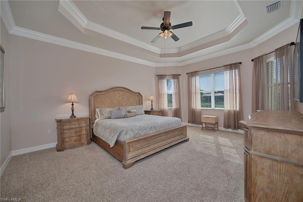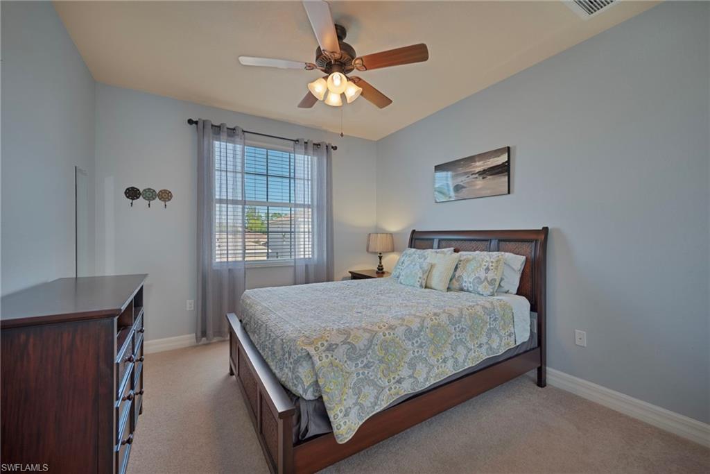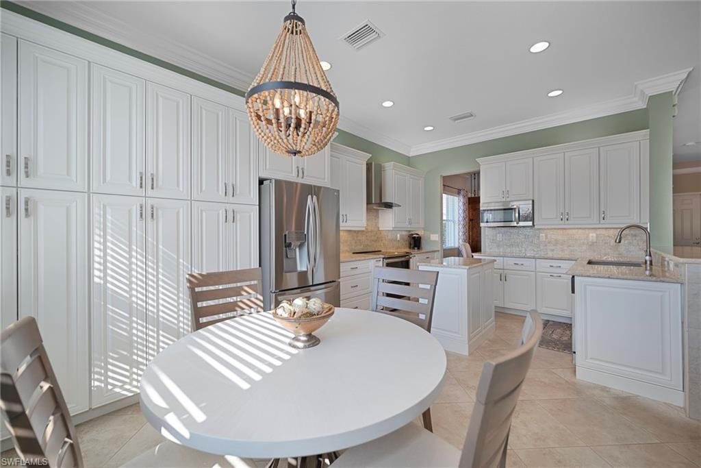 Designed for living well—and living together—this exceptional two-story residence offers 3,513 square feet of thoughtfully curated living space, where intelligent design, custom craftsmanship, and flexibility come together beautifully. Impeccably maintained with evident pride of ownership, this 5-bedroom, 5-bath home is located within the centrally positioned, gated community of Marbella Lakes and delivers a layout that truly shines, with multiple living areas thoughtfully spread across two levels—each given its own moment and purpose. The result is a home that allows everyone to spread out comfortably while still feeling connected. From the moment you enter, the home’s smart, intentional design is evident. The staircase is visible yet thoughtfully set back from the foyer, adding architectural interest without dominating the entry and allowing the main living spaces to unfold naturally beyond. Entertaining is effortless with two dining areas, including a formal dining room and a separate breakfast nook, while the spacious great room and large, beautifully appointed kitchen anchor the home. The kitchen is outfitted with a striking wall of cabinetry, generous counter space, a center island, and breakfast bar—offering an exceptional amount of storage and functionality. Adding to the home’s creative use of space, the dining room features a custom-built wine rack and built-in sundry storage tucked beneath the staircase, a clever and elevated detail designed with entertaining in mind. Upstairs, a spacious family room provides a versatile retreat—ideal for movie nights, study space, or relaxed lounging separate from the main living areas. The generously sized primary suite is a true sanctuary, showcasing a dramatic tray ceiling and an expansive spa-inspired bath complete with a frameless glass shower entry, dual sinks, soaking tub, and a dedicated makeup vanity. Each guest bedroom enjoys its own private bath, ensuring comfort, privacy, and ease for family and visitors alike. Perfectly suited for multi-generational living, the first-floor bedroom serves beautifully as a mother-in-law suite, guest retreat, or flexible living space—complete with its own full bath. Practical luxury continues with two laundry rooms, one on each level—both featuring laundry sinks—for everyday convenience. A 3-car garage provides ample room for vehicles, storage, and hobbies. Step outside to the southern-facing extended screened lanai, where tranquil lake views create a peaceful backdrop for year-round outdoor living—sun-filled days, and relaxed evenings alike. Residents of Marbella Lakes enjoy the privacy of a gated community with resort-style amenities, all just minutes from Gulf beaches, shopping, and dining. This is a home where space has been carefully considered, layers of living have been intentionally designed, and every square foot works smarter—a residence that truly reflects care, quality, and pride. Electric roll down on lanai and accordion shutters on the rest.