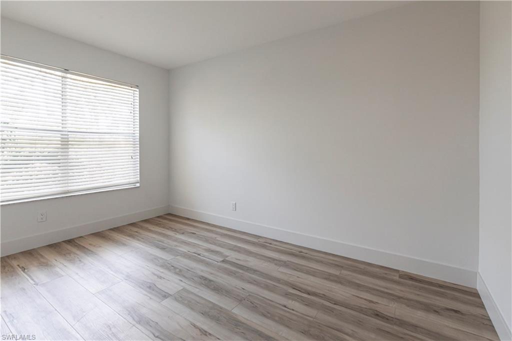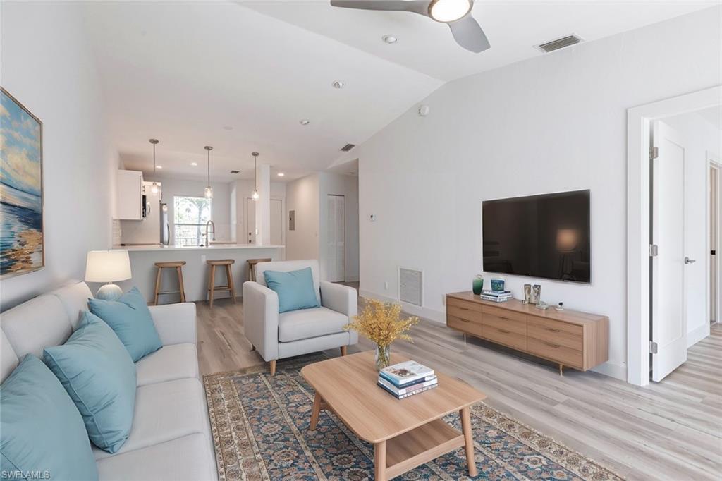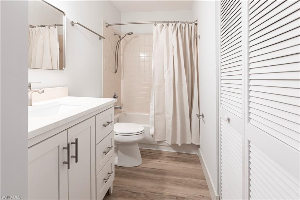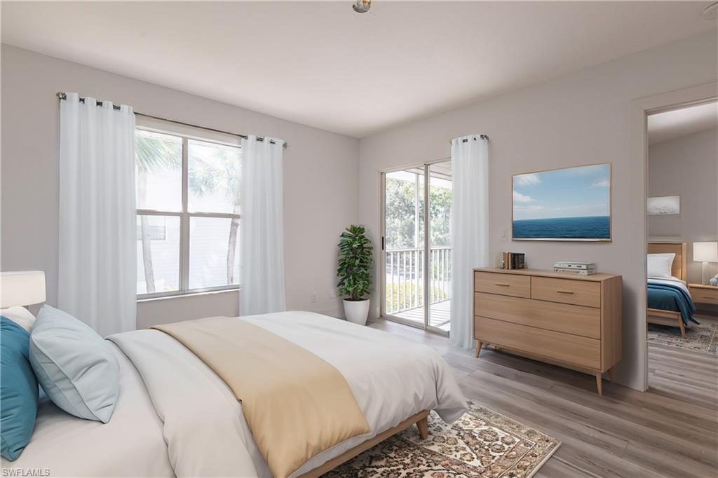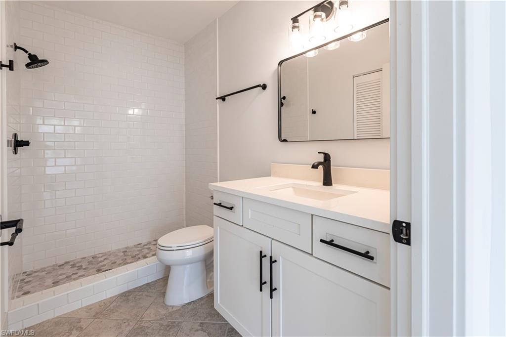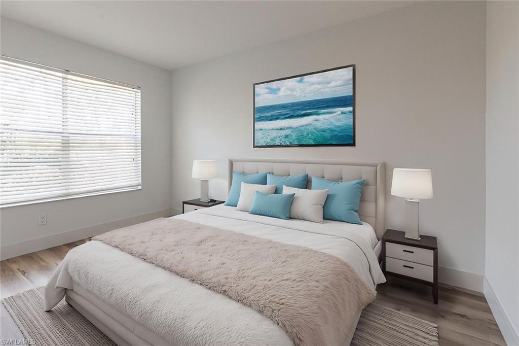 Best deal in Kings Lake for a remodeled unit! Tastefully remodeled second floor unit in beautifully landscaped Courtyard Village at Kings Lake community, just off Kings Lake Blvd. Luxury vinyl plank flooring throughout interior, tile flooring in master bathroom and lanai. Kitchen boasts shaker cabinets, quartz countertops, new stainless appliances and a convenient coffee bar complete with extra storage space. The master bedroom offers a private en-suite with walk-in shower, spacious walk-in closet and access to the screened-in lanai. Modern fixtures throughout kitchen and bathrooms. Walking distance to Kings Lake Square on Davis Blvd, offering grocery store, restaurants, coffee shop, pet supplies, salon and only a short drive to the fabulous Naples Fifth Ave entertainment district and Naples’ sugary white sand beach. Kings Lake offers a host of amenities, including two community pools, a spa, a cabana with restrooms, BBQ area, scenic walking paths, and courts for tennis and pickleball. Convenient covered parking out front and plenty of guest parking. W/D in unit. New roof installed in 2024. HOA financials in MLS attachments.