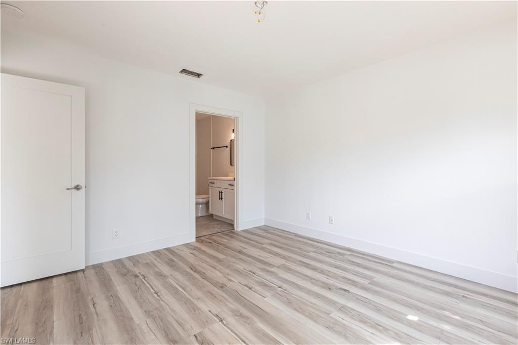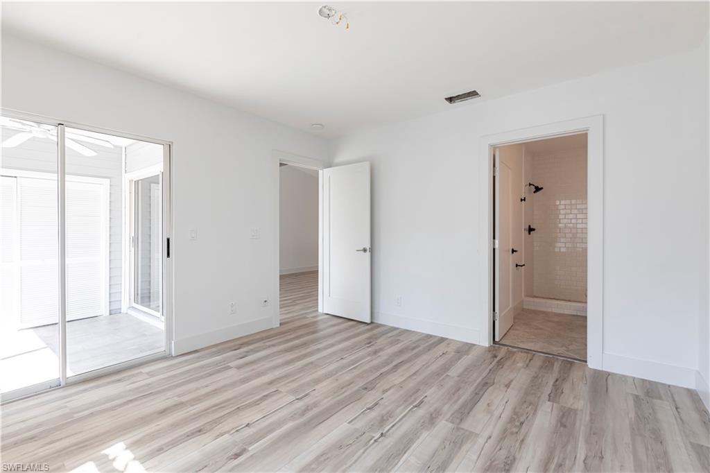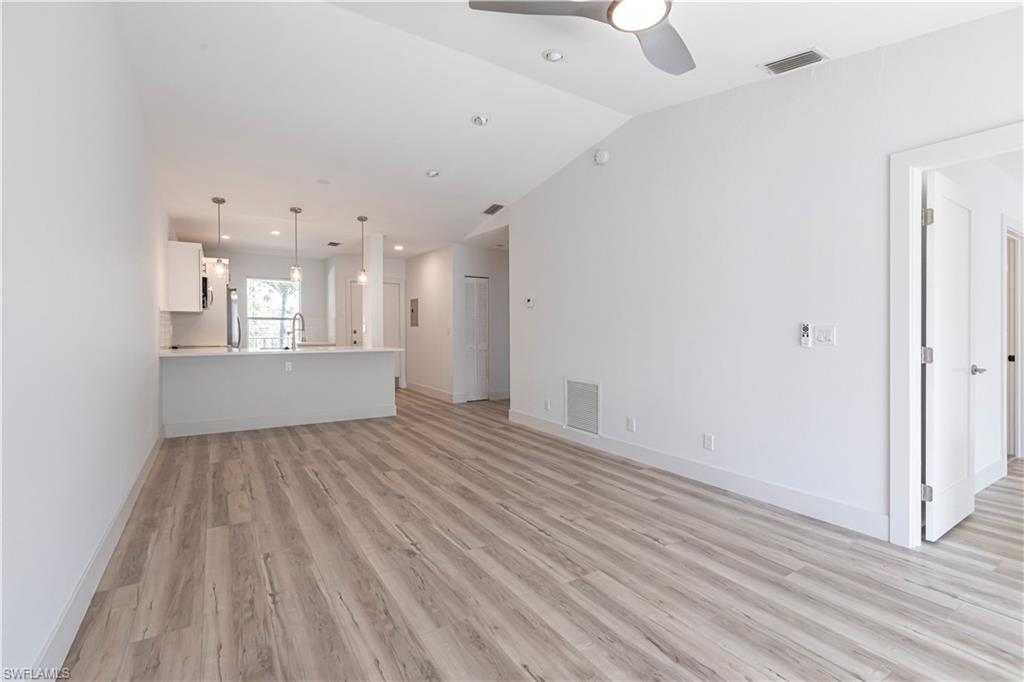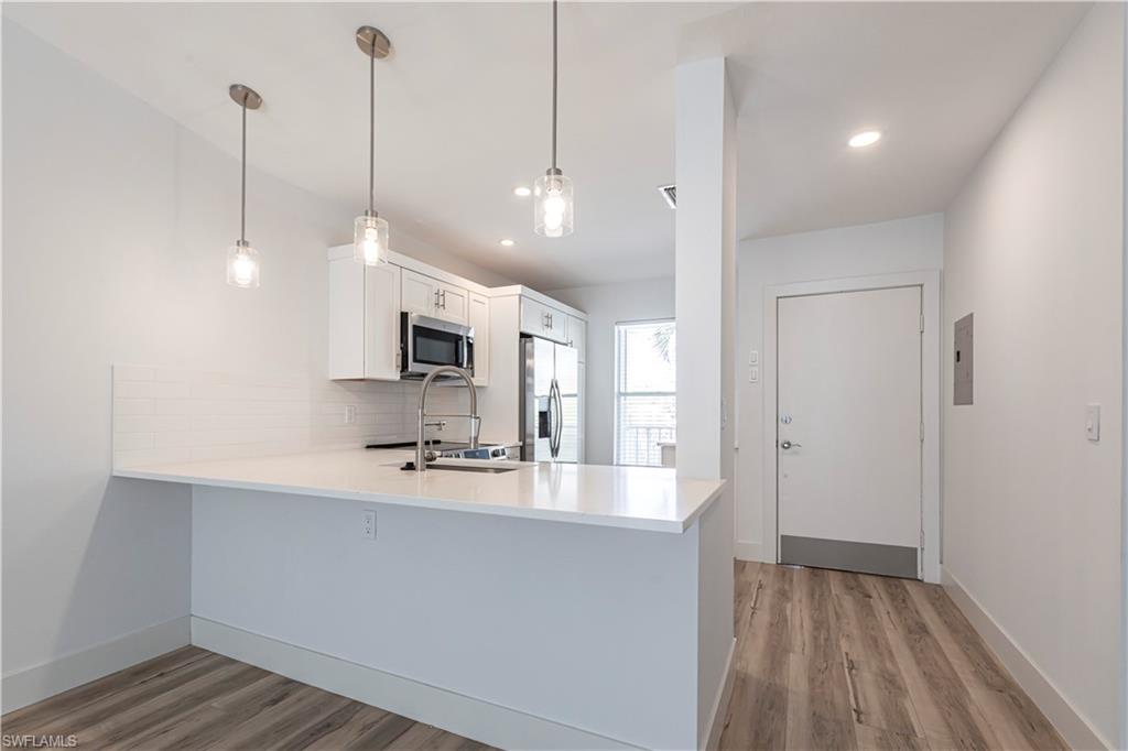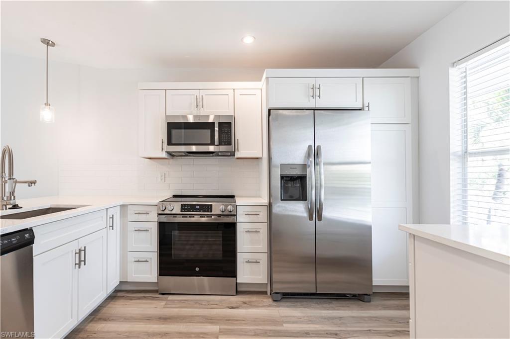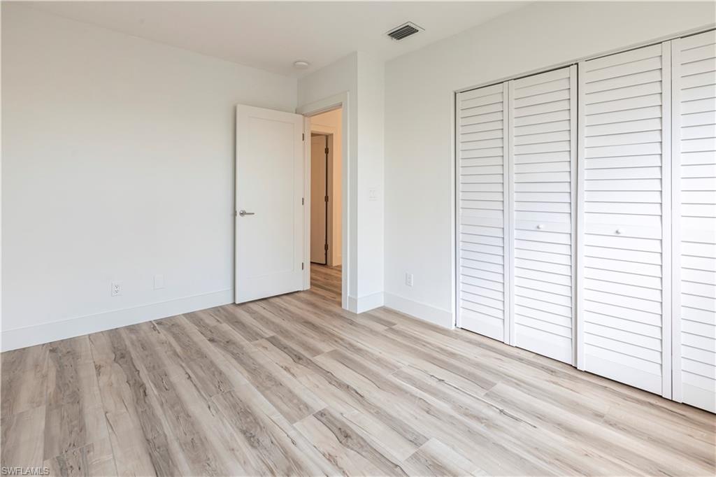 Best deal in Kings Lake for a remodeled unit! Tastefully remodeled second floor unit in beautifully landscaped Courtyard Village at Kings Lake community, just off Kings Lake Blvd. Luxury vinyl plank flooring throughout interior, tile flooring in master bathroom and lanai. Kitchen boasts shaker cabinets, quartz countertops, new stainless appliances and a convenient coffee bar complete with extra storage space. The master bedroom offers a private en-suite with walk-in shower, spacious walk-in closet and access to the screened-in lanai. Modern fixtures throughout kitchen and bathrooms. Walking distance to Kings Lake Square on Davis Blvd, offering grocery store, restaurants, coffee shop, pet supplies, salon and only a short drive to the fabulous Naples Fifth Ave entertainment district and Naples’ sugary white sand beach. Kings Lake offers a host of amenities, including two community pools, a spa, a cabana with restrooms, BBQ area, scenic walking paths, and courts for tennis and pickleball. Convenient covered parking out front and plenty of guest parking. W/D in unit. New roof installed in 2024. HOA financials in MLS attachments.