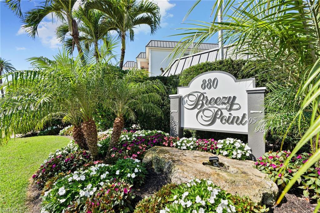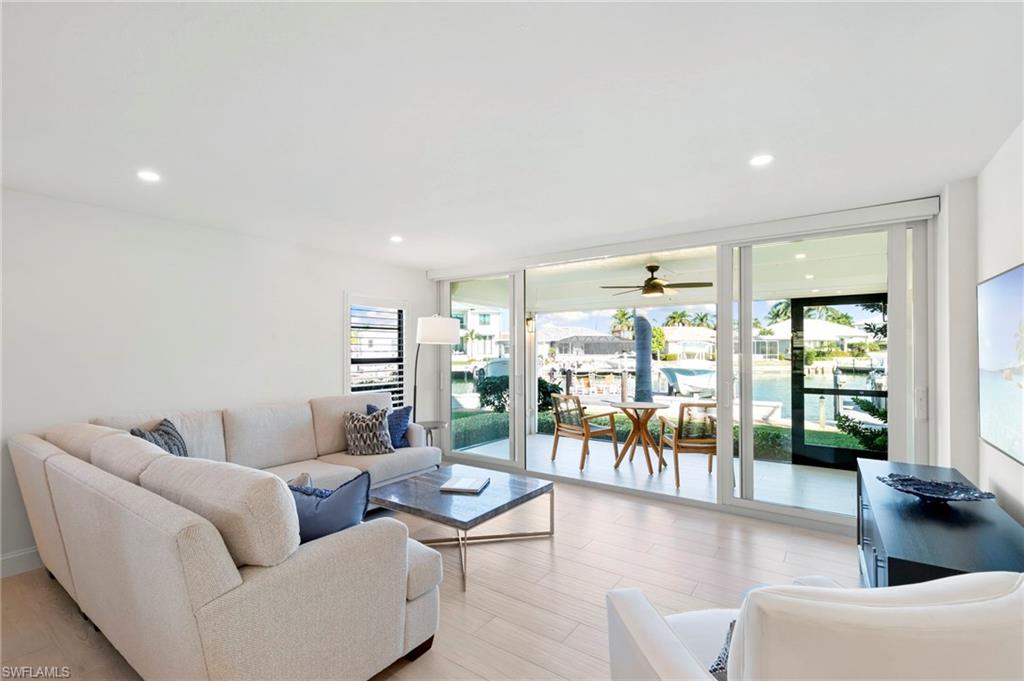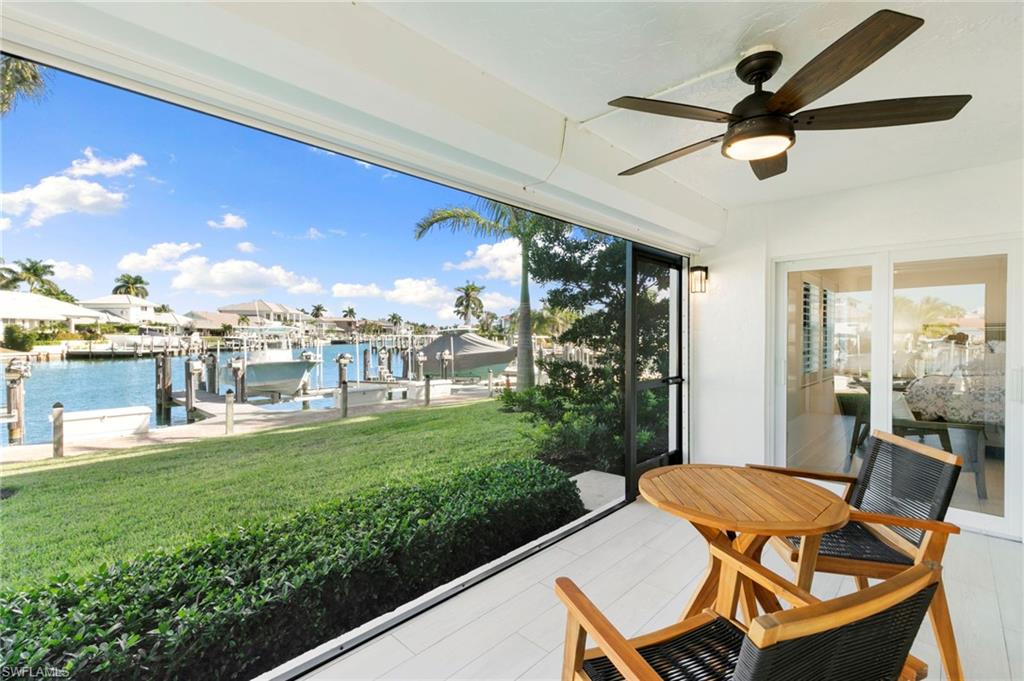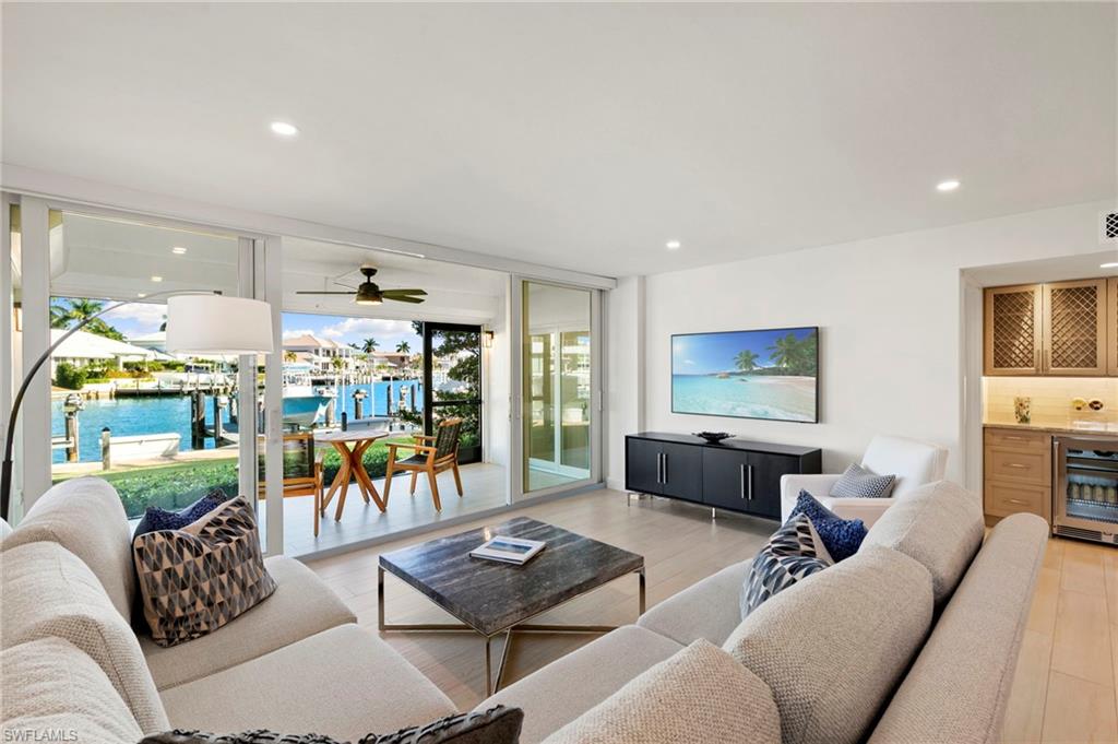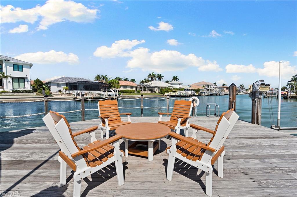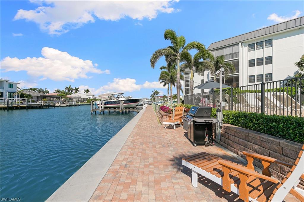 Beautifully updated, move-in ready 2 bed 2 bath condo in the exclusive Breezy Point community on Marco Island with wide water views. Offered furnished and includes a deeded boat slip with a 14,000 lb. remote-controlled lift (2021). Fantastic location, short distance to the beach, restaurants, and direct Gulf access within minutes. Inside, enjoy a stunning kitchen remodel with custom cabinetry, quartz countertops, a large island, tile backsplash, under-cabinet lighting, pantry organizers, and Bosch Benchmark appliances (2023). The home features luxury porcelain wood-look flooring, impact windows and sliders, and remote-controlled shutters for the new panoramic screened-in lanai. The primary bedroom suite includes a sitting area, crown molding, and a beautifully updated bathroom with an all-glass walk-in shower (dual fixtures), quartz dual vanity, and a large custom walk-in closet. The guest bedroom also features a custom closet and an updated guest bathroom. Additional upgrades include high ceilings with new LED lighting, solid-core doors and trim, side-by-side washer/dryer, plantation shutters, remote-controlled window screens, and a custom dry bar with quartz countertop and Perlick beverage cooler. Breezy Point offers excellent community amenities: new lanais, new roof, new seawall, lush landscaping, illuminated seawall walkways with boat docks for all units, and four social gathering docks. Enjoy the community pool, weekly happy hours at the updated community center, and convenient brick paver walkways to the pool, docks, and grill area. Includes one assigned parking space plus guest parking. Perfect for boating enthusiasts, beach lovers, and anyone seeking the ideal Marco Island lifestyle.