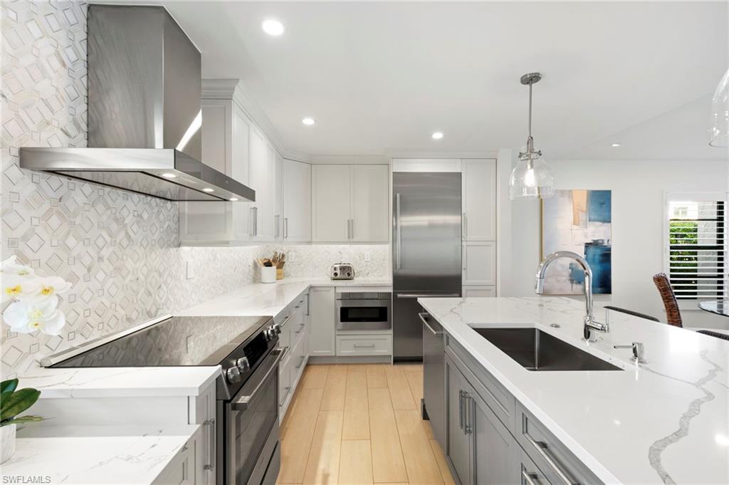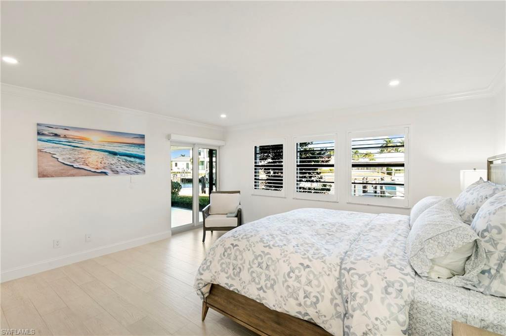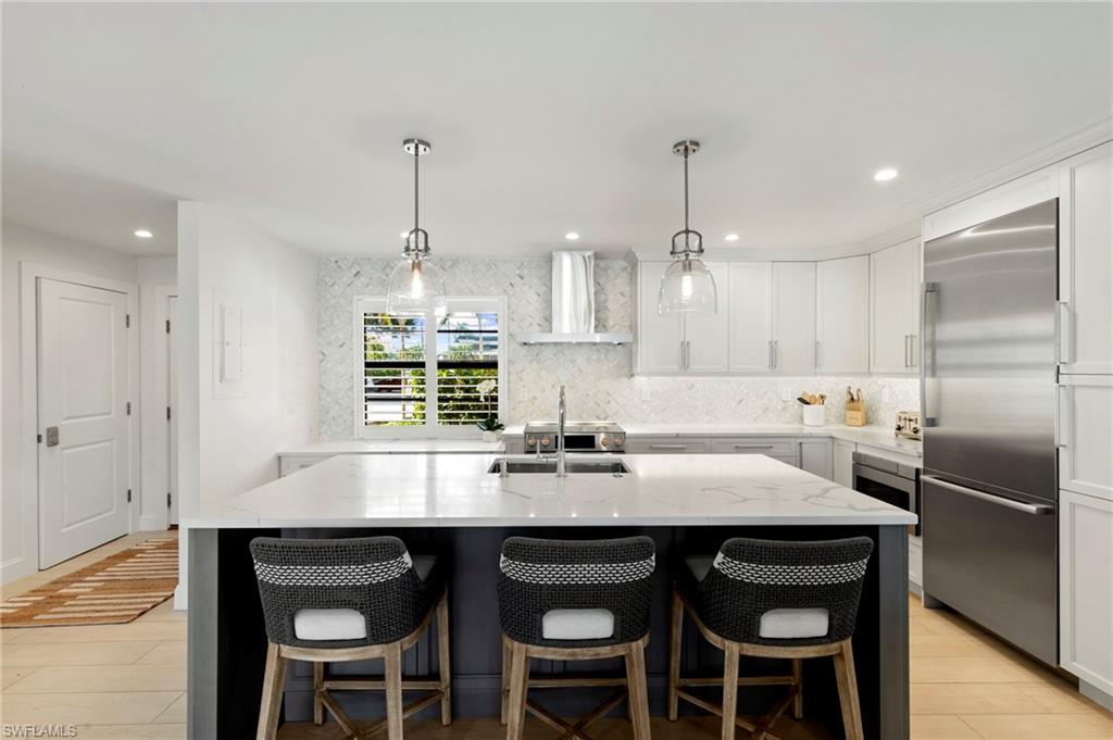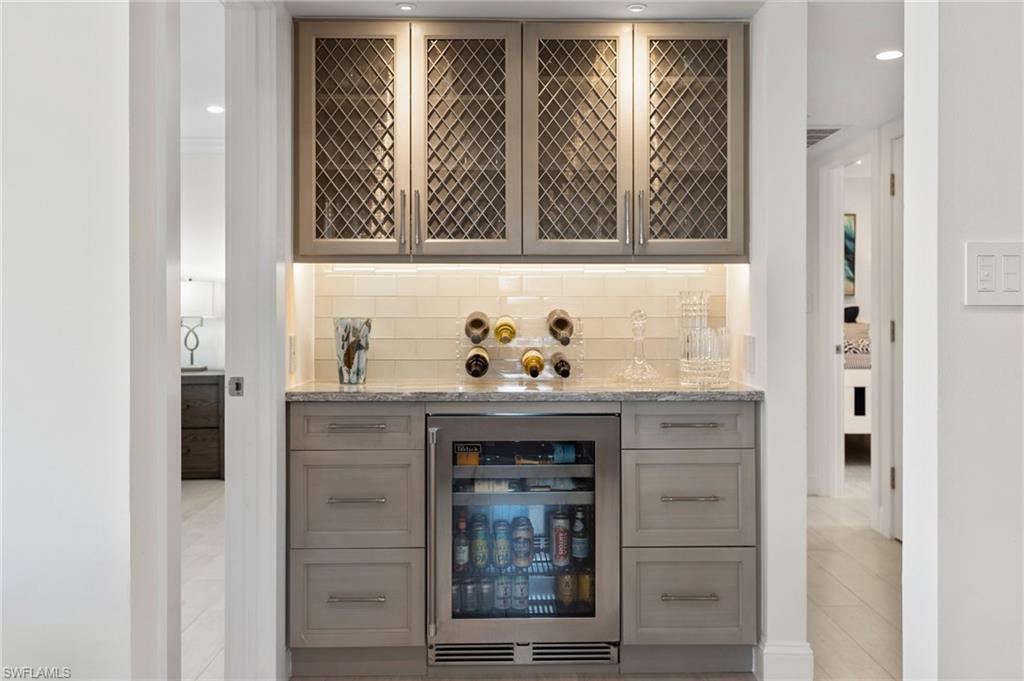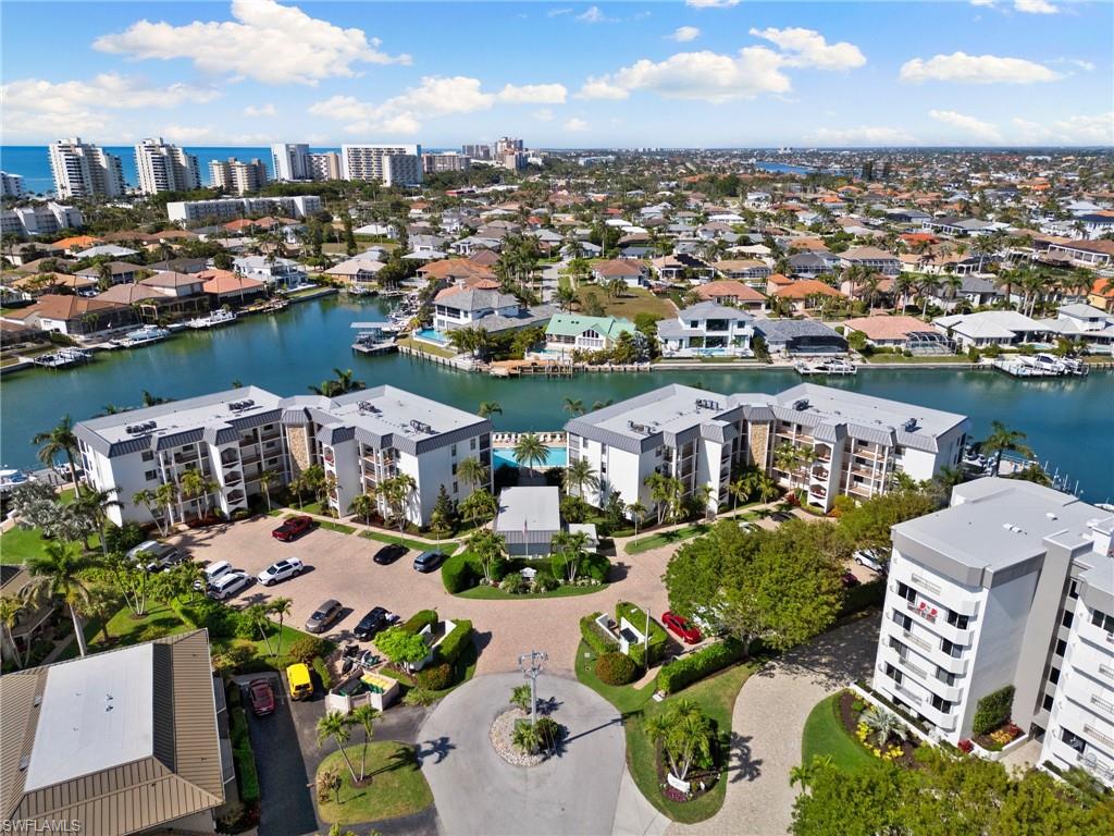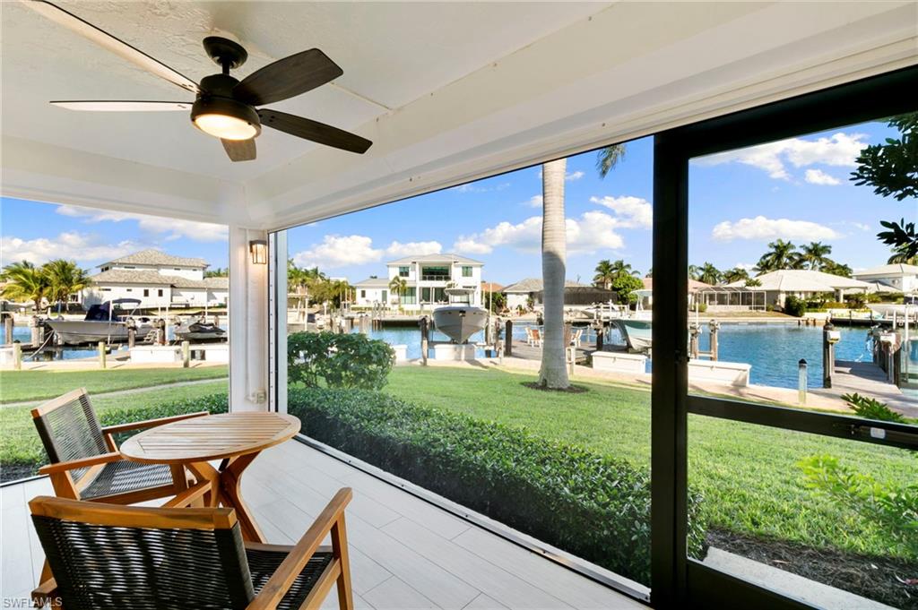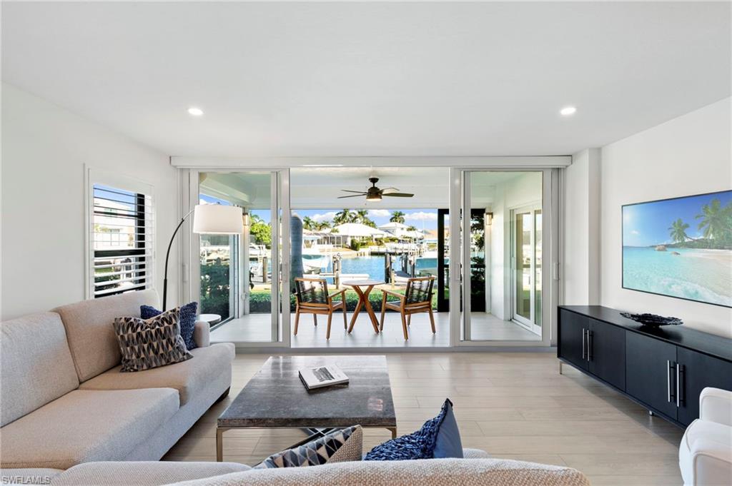 Beautifully updated, move-in ready 2 bed 2 bath condo in the exclusive Breezy Point community on Marco Island with wide water views. Offered furnished and includes a deeded boat slip with a 14,000 lb. remote-controlled lift (2021). Fantastic location, short distance to the beach, restaurants, and direct Gulf access within minutes. Inside, enjoy a stunning kitchen remodel with custom cabinetry, quartz countertops, a large island, tile backsplash, under-cabinet lighting, pantry organizers, and Bosch Benchmark appliances (2023). The home features luxury porcelain wood-look flooring, impact windows and sliders, and remote-controlled shutters for the new panoramic screened-in lanai. The primary bedroom suite includes a sitting area, crown molding, and a beautifully updated bathroom with an all-glass walk-in shower (dual fixtures), quartz dual vanity, and a large custom walk-in closet. The guest bedroom also features a custom closet and an updated guest bathroom. Additional upgrades include high ceilings with new LED lighting, solid-core doors and trim, side-by-side washer/dryer, plantation shutters, remote-controlled window screens, and a custom dry bar with quartz countertop and Perlick beverage cooler. Breezy Point offers excellent community amenities: new lanais, new roof, new seawall, lush landscaping, illuminated seawall walkways with boat docks for all units, and four social gathering docks. Enjoy the community pool, weekly happy hours at the updated community center, and convenient brick paver walkways to the pool, docks, and grill area. Includes one assigned parking space plus guest parking. Perfect for boating enthusiasts, beach lovers, and anyone seeking the ideal Marco Island lifestyle.