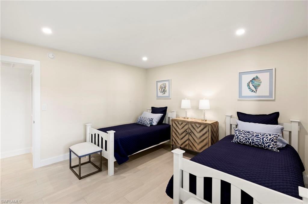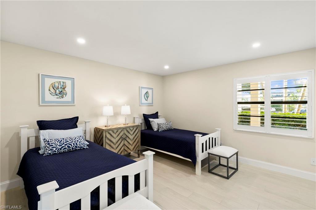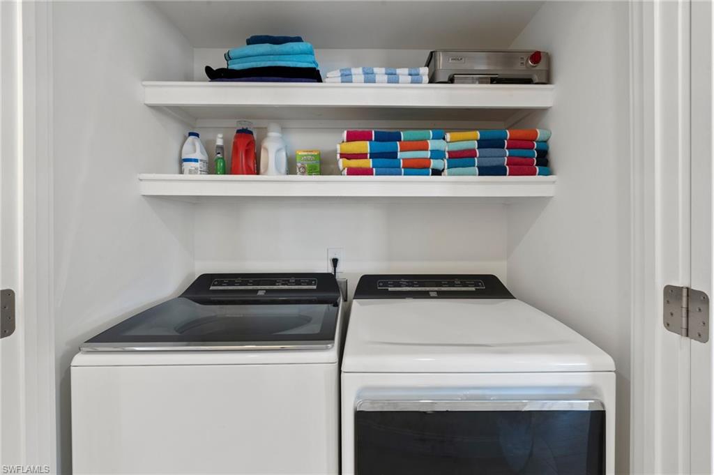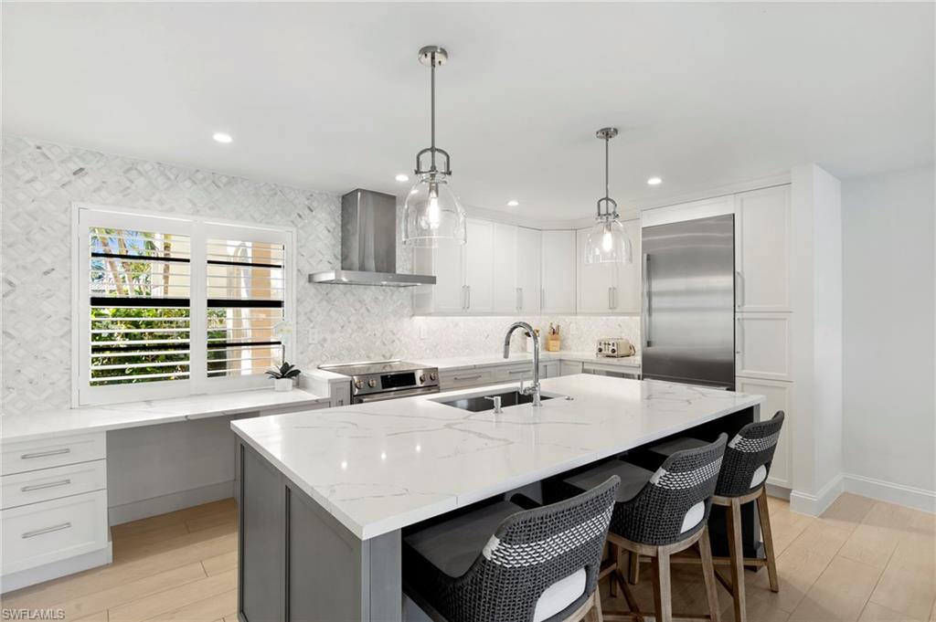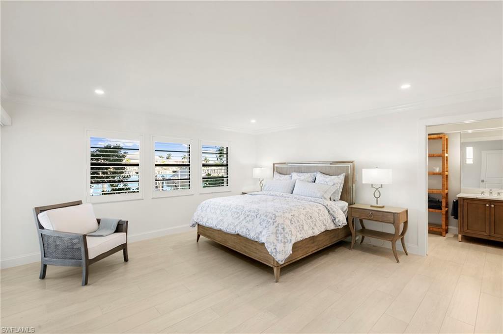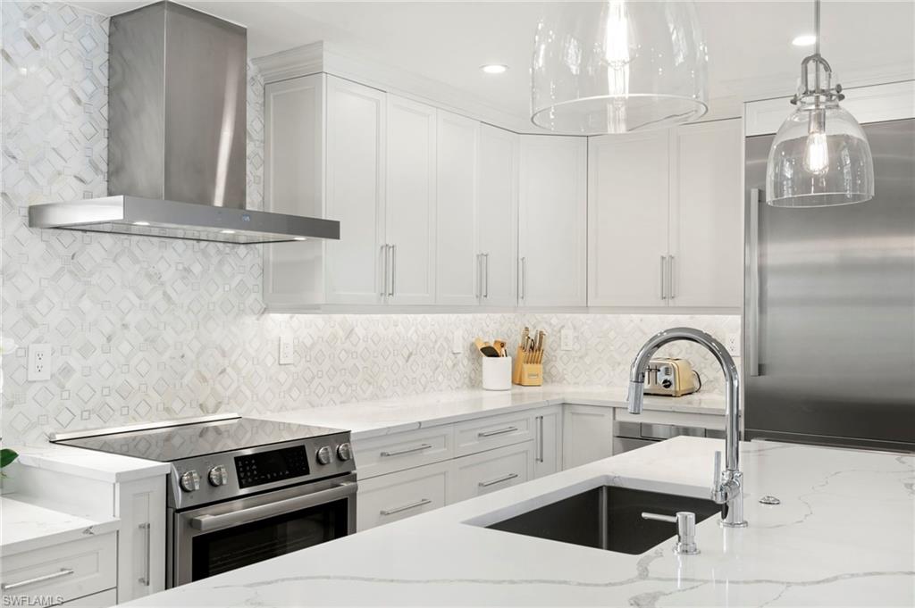 Beautifully updated, move-in ready 2 bed 2 bath condo in the exclusive Breezy Point community on Marco Island with wide water views. Offered furnished and includes a deeded boat slip with a 14,000 lb. remote-controlled lift (2021). Fantastic location, short distance to the beach, restaurants, and direct Gulf access within minutes. Inside, enjoy a stunning kitchen remodel with custom cabinetry, quartz countertops, a large island, tile backsplash, under-cabinet lighting, pantry organizers, and Bosch Benchmark appliances (2023). The home features luxury porcelain wood-look flooring, impact windows and sliders, and remote-controlled shutters for the new panoramic screened-in lanai. The primary bedroom suite includes a sitting area, crown molding, and a beautifully updated bathroom with an all-glass walk-in shower (dual fixtures), quartz dual vanity, and a large custom walk-in closet. The guest bedroom also features a custom closet and an updated guest bathroom. Additional upgrades include high ceilings with new LED lighting, solid-core doors and trim, side-by-side washer/dryer, plantation shutters, remote-controlled window screens, and a custom dry bar with quartz countertop and Perlick beverage cooler. Breezy Point offers excellent community amenities: new lanais, new roof, new seawall, lush landscaping, illuminated seawall walkways with boat docks for all units, and four social gathering docks. Enjoy the community pool, weekly happy hours at the updated community center, and convenient brick paver walkways to the pool, docks, and grill area. Includes one assigned parking space plus guest parking. Perfect for boating enthusiasts, beach lovers, and anyone seeking the ideal Marco Island lifestyle.