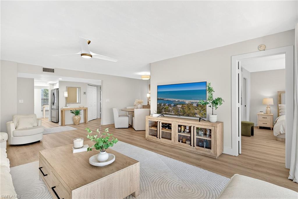 Step into coastal elegance with this stunning 2025 RENOVATED FIRST-FLOOR CONDO offering serene lakefront living in one of Naples’ most desirable areas. Thoughtfully designed and beautifully upgraded, this residence blends modern sophistication with relaxed Florida comfort. Inside, the OPEN-CONCEPT LAYOUT is enhanced by brand-new designer finishes, a fresh contemporary color palette, and abundant natural light. The reimagined kitchen features quartz countertops, custom cabinetry, and new stainless steel appliances, flowing seamlessly into the main living area where TRANQUIL LAKE VIEWS create an inviting backdrop. Wake up each day to the water and wildlife from the spacious primary suite, complete with a newly redesigned ensuite bath. The guest bedroom and bath offer equal comfort and style—perfect for visitors. Enjoy peaceful mornings or sunset evenings on the SCREENED LANAI overlooking the lake, your own private retreat just steps from the water. A RARE PRIVATE GARAGE provides exceptional convenience and storage, while the first-floor location offers effortless access with no stairs. The community enhances the lifestyle with a large, RESORT-STYLE POOL, ideal for lounging, swimming, or socializing in the Florida sunshine. Located minutes from Naples’ pristine beaches, top-tier dining, shopping, and golf courses, this home is truly MOVE-IN READY—a beautifully updated, low-maintenance escape with exceptional views and amenities. Make this your personal residence, your vacation oasis, or rental property today! Welcome home, TURN-KEY OPTIONAL.