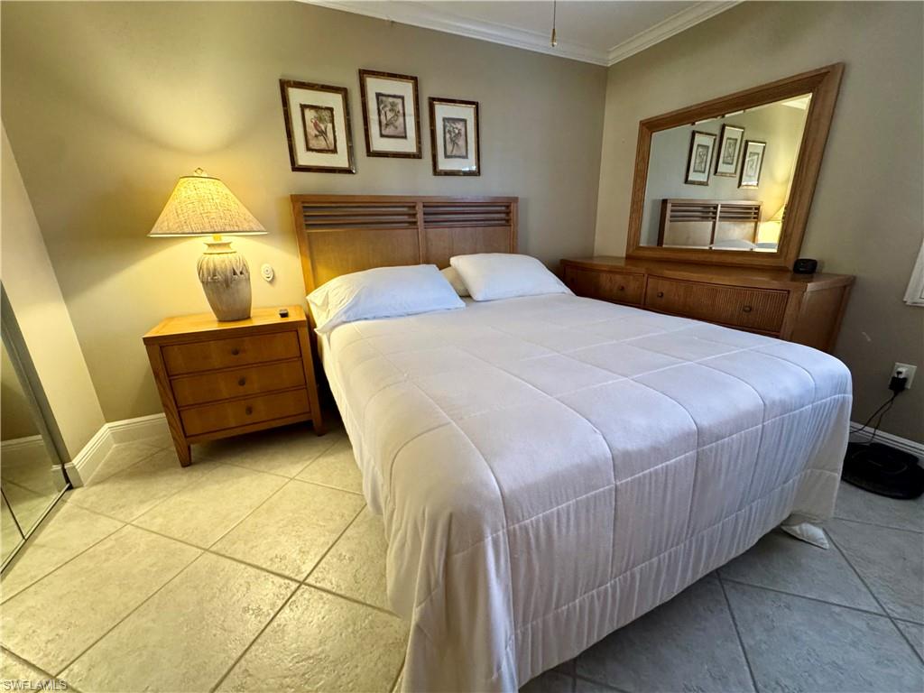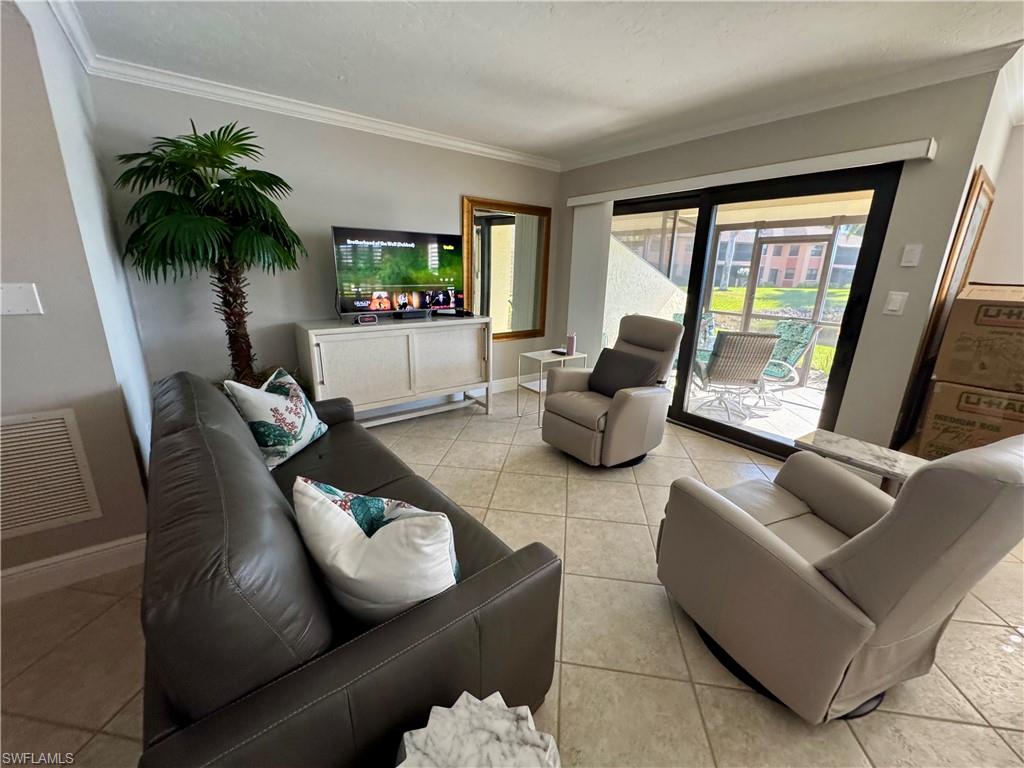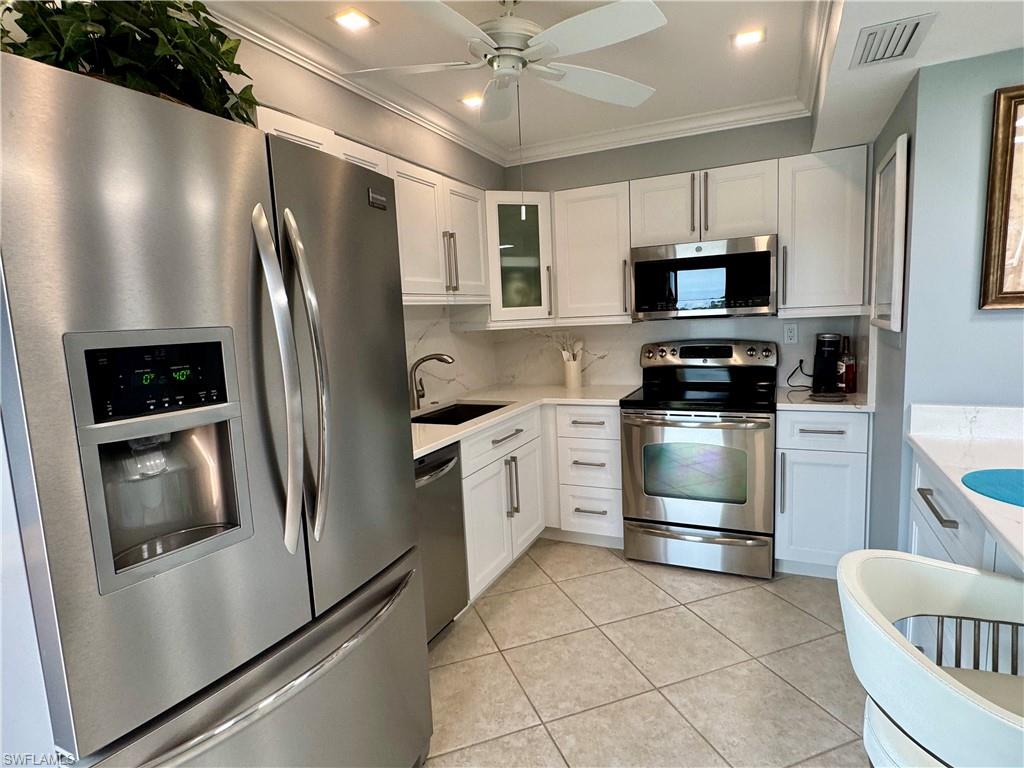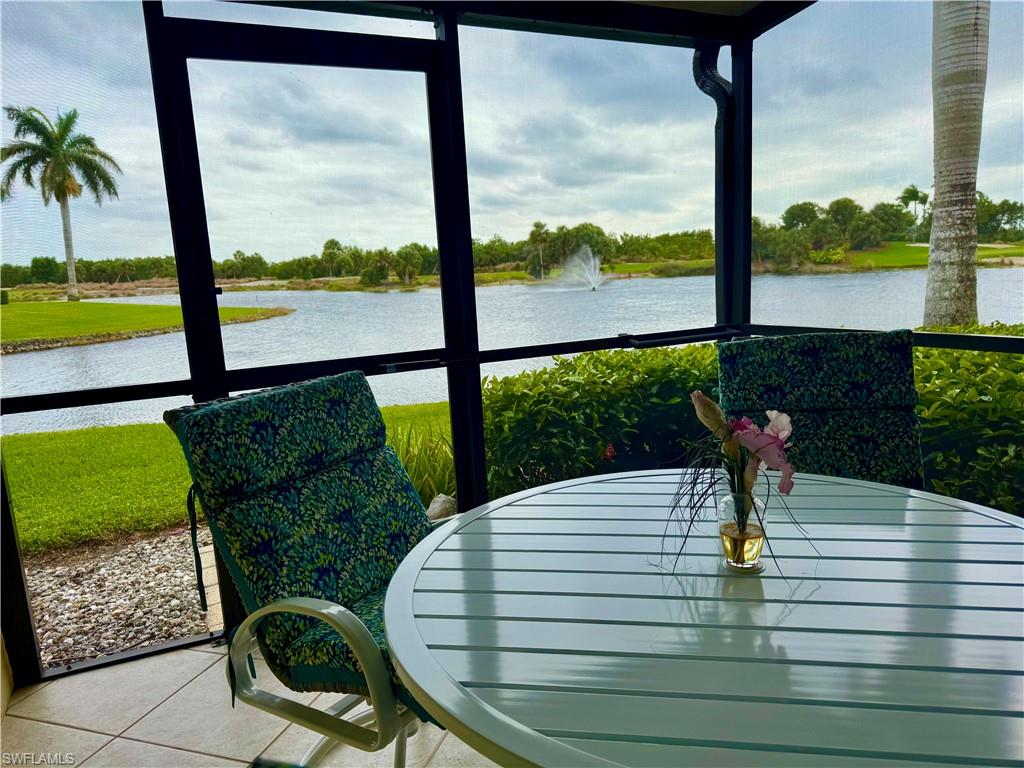 Welcome to one of the finest views in Tropic Schooner. This beautifully updated first-floor condo offers exceptional privacy and a stunning panorama of the wide lake, peaceful water feature, and the golf course beyond. The screened-in lanai is perfectly positioned for daily wildlife viewing, and the living room’s patio sliders create effortless indoor–outdoor living. Inside, the home features tile flooring throughout and a remodeled, modern kitchen in 2025 with quartz countertops, pull-out cabinets, a spacious breakfast bar, and an open layout that flows seamlessly into the dining and living areas. The dining room is framed by two large windows showcasing the lake, filling the space with natural light. The floor plan includes two comfortable bedrooms, two full updated baths, and convenient in-unit laundry. AC 2021, H2O Heater 2023. Lighting, doors & ceiling fans 2024. Impact glass adds durability and peace of mind. Parking is conveniently located, and the community pool is only steps away—close enough for easy enjoyment while remaining quiet and private. Tropic Schooner provides a well-rounded lifestyle with two pools, pickleball and tennis courts, bocce, shuffleboard, a clubhouse, and a car-wash station. All of this is ideally situated just 3 miles from Marco Island and 12 miles from Downtown Naples/5th Ave. This is a wonderful opportunity to enjoy Southwest Florida living in a well-maintained, amenity-rich community—all at a valued price.