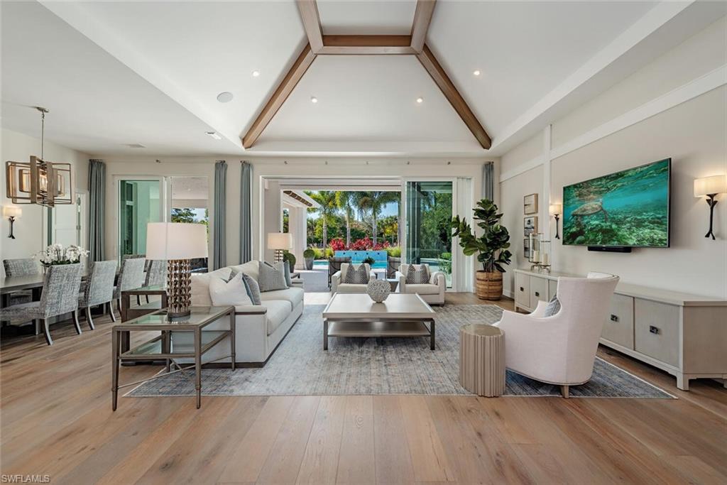 Stunning showcase home in The Enclave of Distinction, designed by renowned Naples firm Stofft Cooney Architects and brilliantly finished by Molly Hoover Interior Design. Set within a boutique gated community of just 27 residences, known for its paver streets, lush landscaping, sidewalks, and warm sense of privacy, this former model home offers 4,121 square feet of beautifully curated living space. The residence features 4 en-suite bedrooms, a den, a powder room, mud room, a second-floor family room, and a 3-car air-conditioned garage. Upon entering, a 15’ lofted ceiling with custom beam millwork, wide-plank white oak floors, and a full wall of sliding glass doors create a stunning welcome that flows seamlessly into the home’s outdoor oasis. The expansive 716-square-foot outdoor living area, complete with motorized bug screens and an outdoor kitchen, overlooks a custom-designed pool with sun shelf, sunken spa, and waterfall feature, all framed by updated tropical landscaping. Western exposure provides beautiful afternoon light and spectacular sunsets. The open chef’s kitchen includes Viking appliances with gas cooktop, custom wood cabinetry, wine cooler and a large walk-in pantry. The first-floor primary suite offers a luxurious retreat including a spacious bedroom with 12-foot ceilings and paneled feature wall, a spa-like 5-fixture primary bath with a freestanding soaking tub and three closets including two walk-ins with custom closets built-ins. Additional highlights include, designer lighting, custom trim details, draperies, impact glass throughout, a 24kW whole-home generator, a whole home water softener, reverse osmosis filter system in the kitchen. Home is located in the low risk X-500 flood zone where lenders do not require flood insurance. Technology upgrades include smart home automation with Alexa voice control for Sonos audio and Lutron lighting, two HVAC systems with dampers providing four zones of cooling, motorized shades, WiFi-enabled pool equipment and garage door control and a Vitax home security system. Recent outdoor enhancements include all new shellstone patio pavers that were also expanded around the pool, a pool handrail, an updated outdoor kitchen backsplash, improved landscaping and new landscape lighting. --- The Enclave of Distinction offers a refined Naples lifestyle with gated security, walkable sidewalks, and proximity to premier destinations including Seed to Table, Gulf beaches, Mercato, and Southwest Florida International Airport. Built by Distinctive Communities, the neighborhood is celebrated for exceptional craftsmanship, natural gas availability, and intimate community design. The community also features two lakes with lighted fountains and a charming gazebo overlooking the water, offering serene gathering spaces for residents. Perfectly positioned between Mediterra and Talis Park, this enclave benefits from impressive architectural consistency and a tranquil setting paired with low HOA fees.