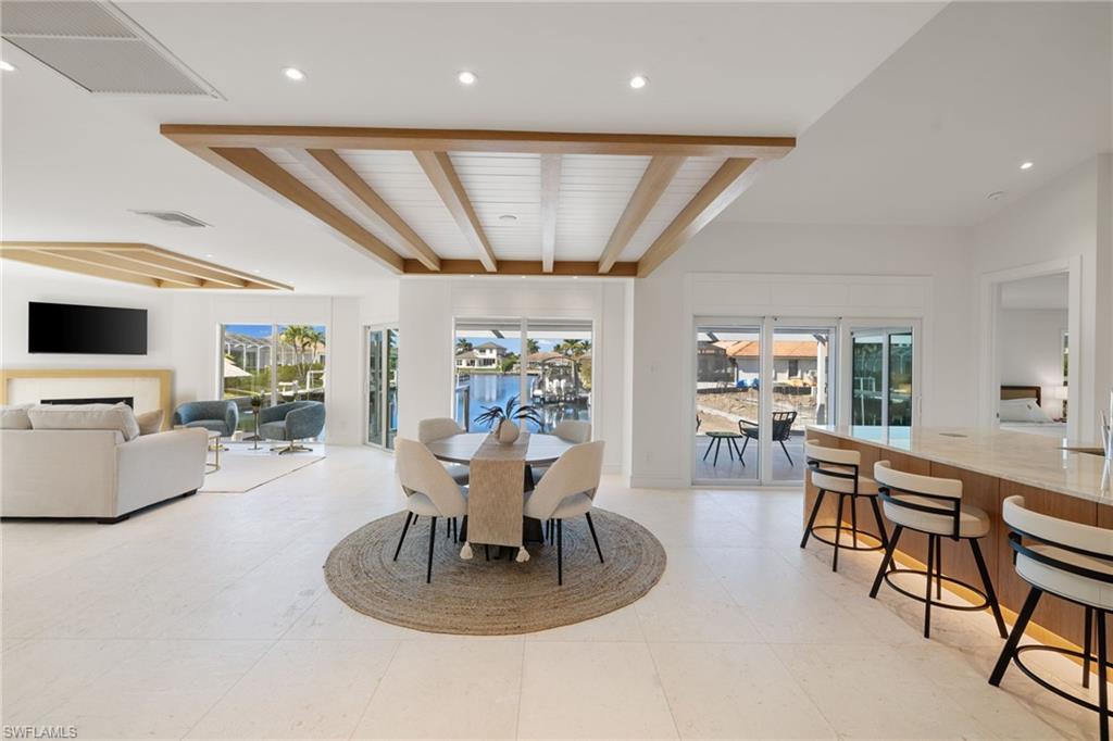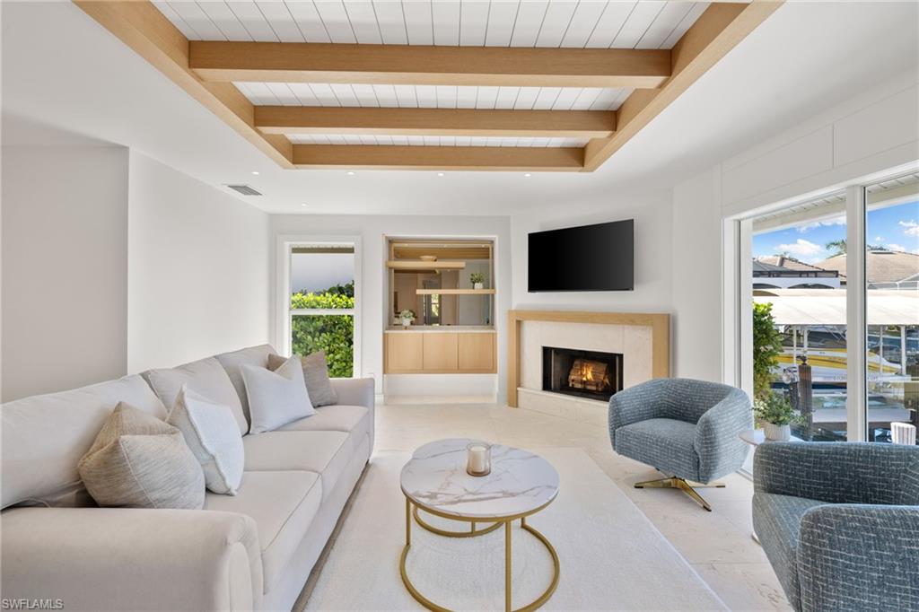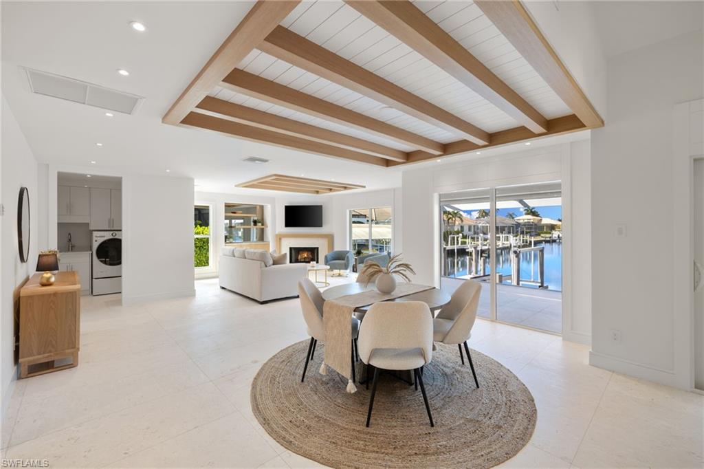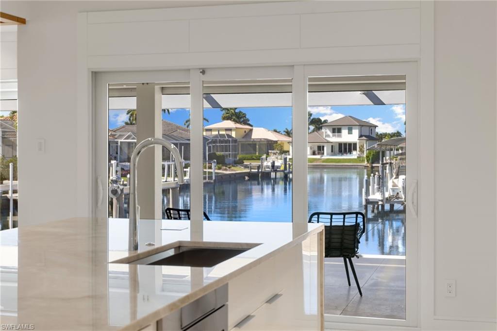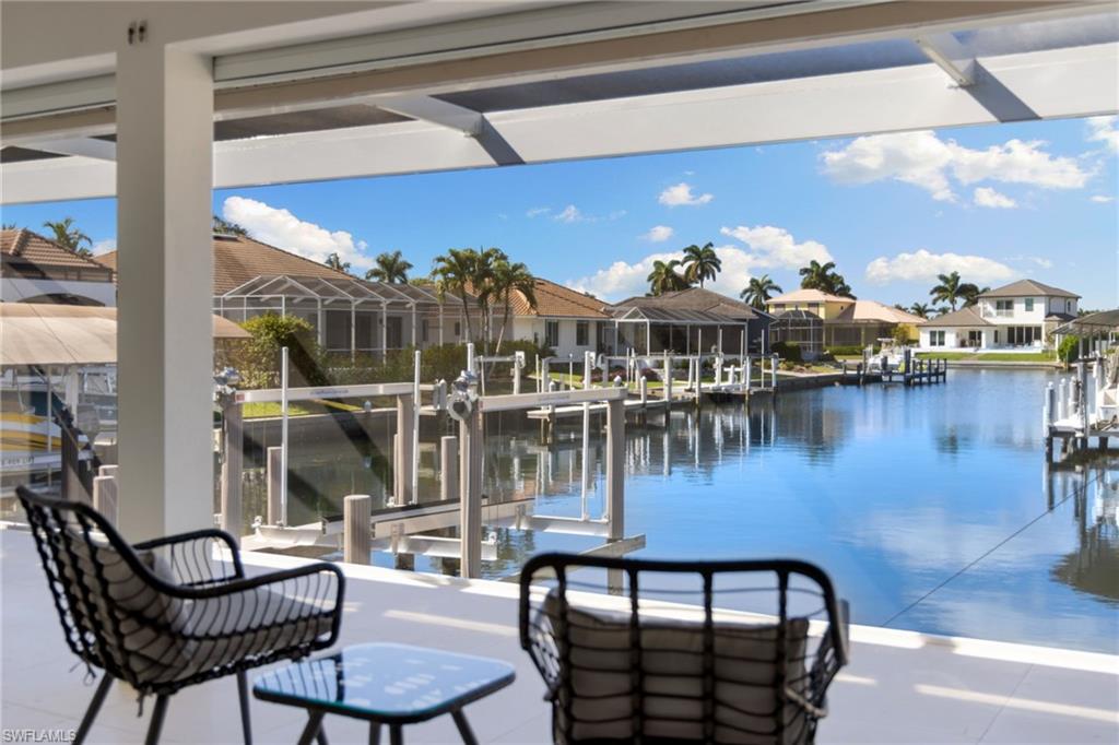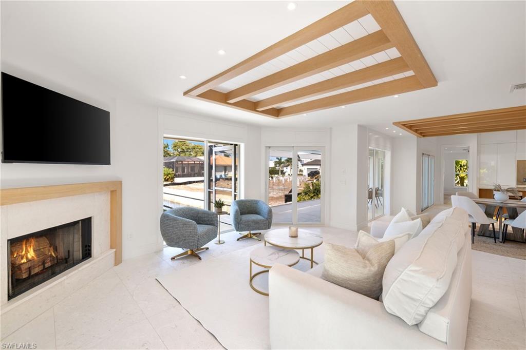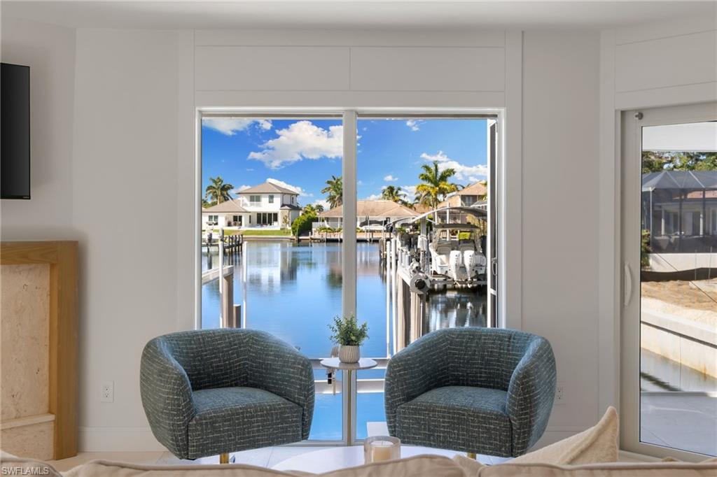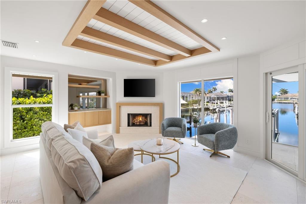 Completely renovated in 2024, this gulf-access residence at 72 N Barfield blends fresh modern design with effortless Marco Island boating. Set on an oversized 0.34-acre corner lot, the single-level home offers 3 bedrooms, 2 baths and approximately 1,727 square feet of light-filled living space. An open great room with creamy marble floors, wood-beam ceilings and a sleek fireplace draws your eye to wide canal views through walls of impact-rated glass. The magazine-worthy kitchen showcases custom cabinetry, a dramatic Taj Mahal quartzite waterfall island, integrated appliances and generous bar seating that keeps everyone connected. The serene primary suite lives like a private retreat with a custom walk-in closet and spa bath featuring an expansive walk-in shower, floating vanity and designer finishes. Two guest rooms share an equally refined bath for visiting family and friends. Outdoors, sliders open to newly completed living and dining areas with both screened and open-air spaces that step down to a new dock and lift—just a short boat ride to open water. Recent permitted work includes full interior and exterior remodels, decking/screen enclosure, site improvements, dock and a newer flat tile roof, delivering a truly turnkey waterfront home with peace of mind.
