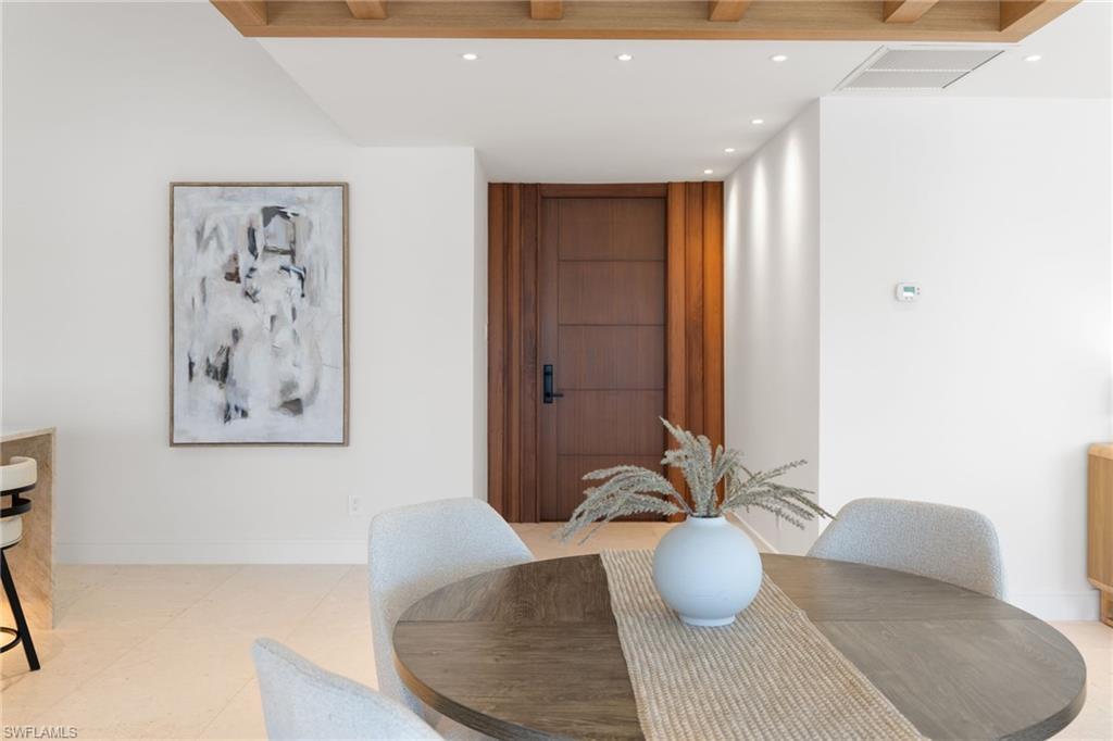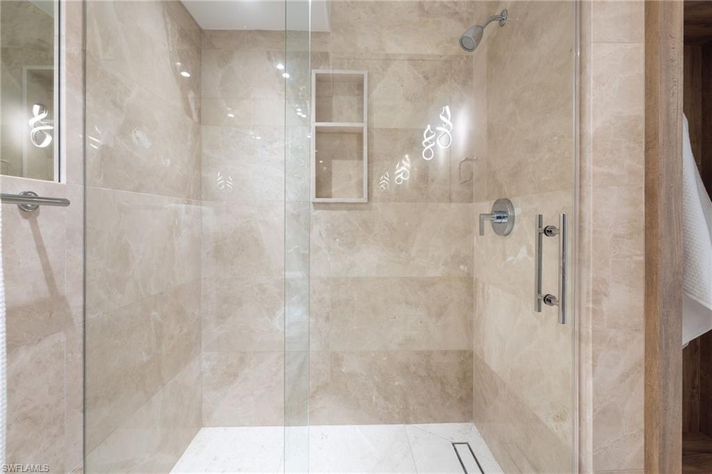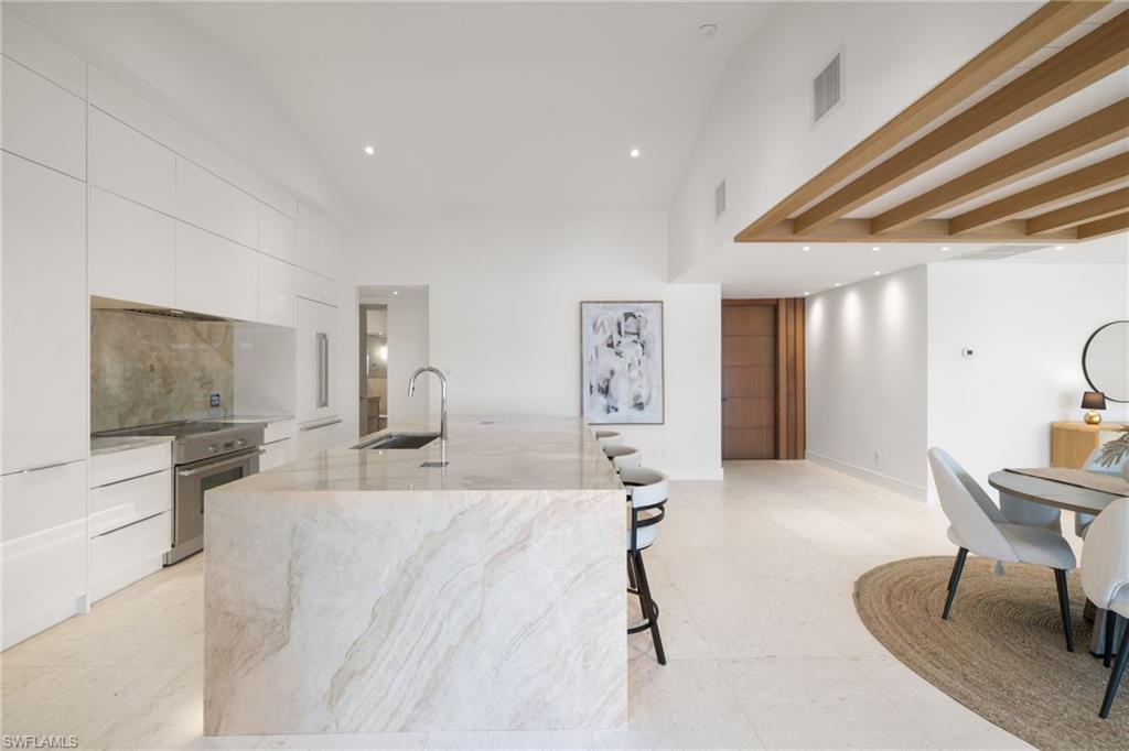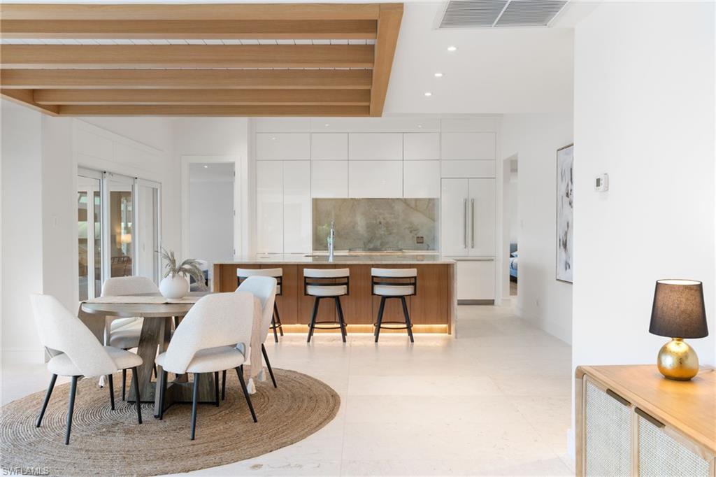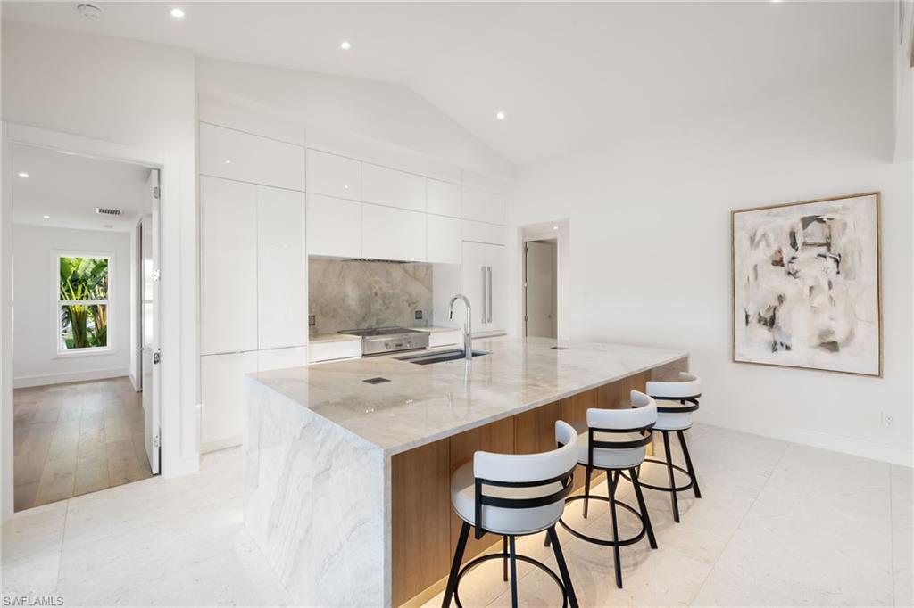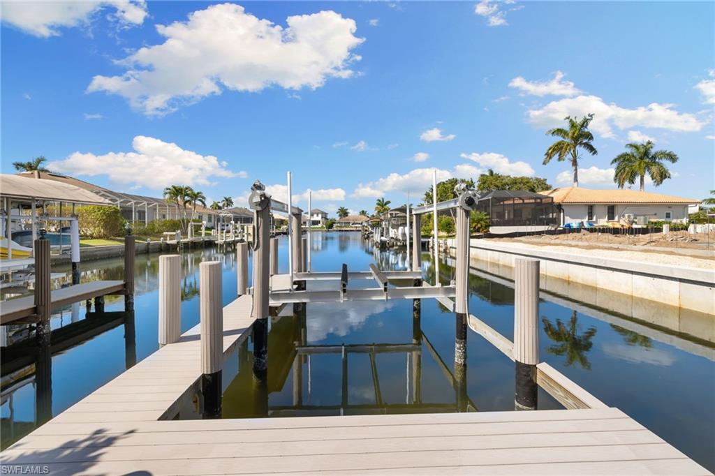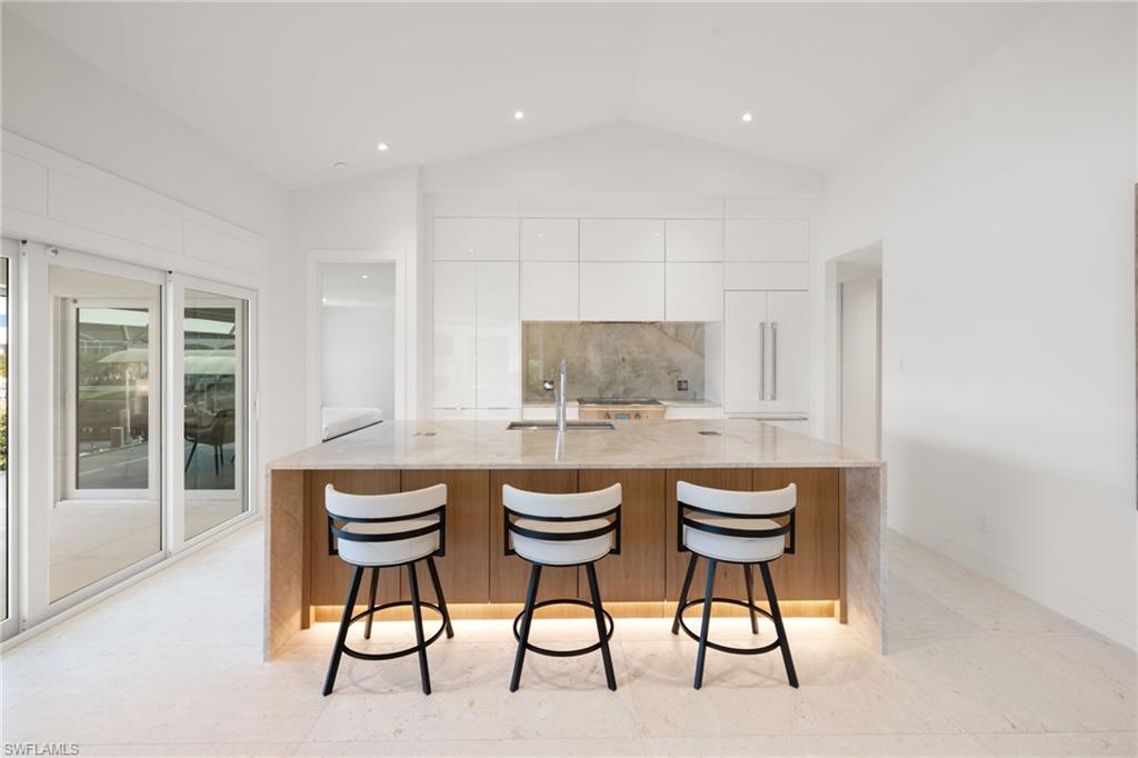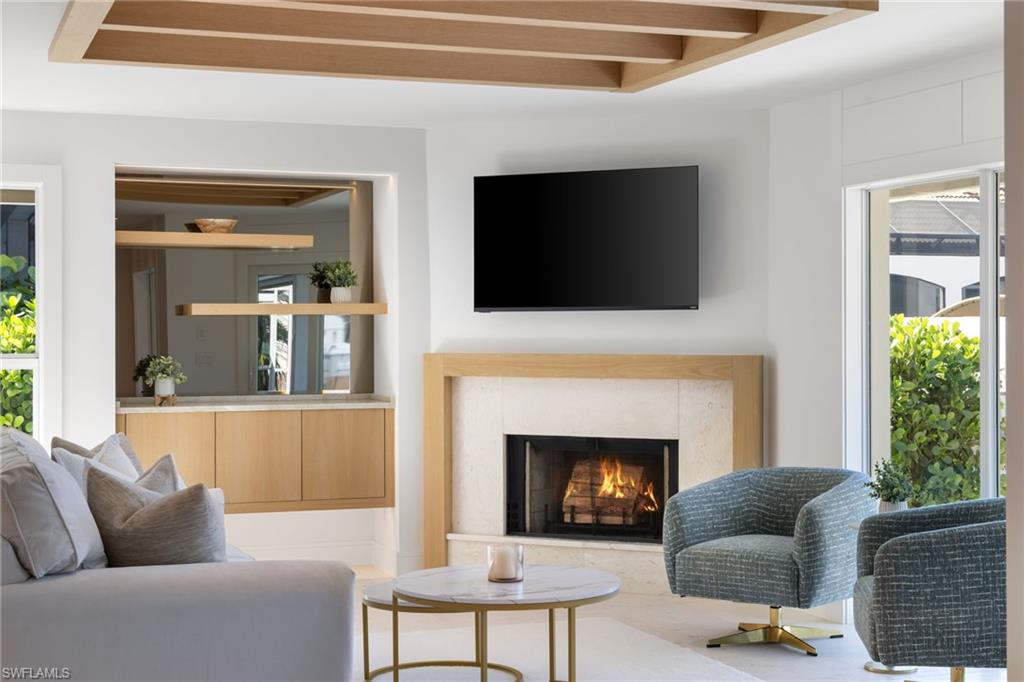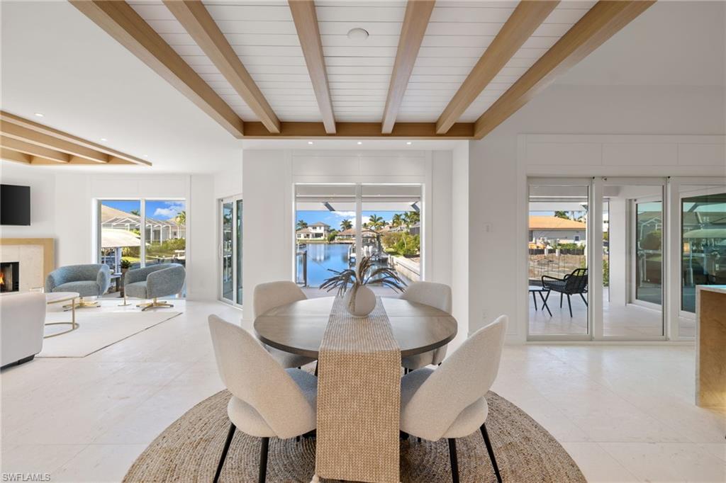 Completely renovated in 2024, this gulf-access residence at 72 N Barfield blends fresh modern design with effortless Marco Island boating. Set on an oversized 0.34-acre corner lot, the single-level home offers 3 bedrooms, 2 baths and approximately 1,727 square feet of light-filled living space. An open great room with creamy marble floors, wood-beam ceilings and a sleek fireplace draws your eye to wide canal views through walls of impact-rated glass. The magazine-worthy kitchen showcases custom cabinetry, a dramatic Taj Mahal quartzite waterfall island, integrated appliances and generous bar seating that keeps everyone connected. The serene primary suite lives like a private retreat with a custom walk-in closet and spa bath featuring an expansive walk-in shower, floating vanity and designer finishes. Two guest rooms share an equally refined bath for visiting family and friends. Outdoors, sliders open to newly completed living and dining areas with both screened and open-air spaces that step down to a new dock and lift—just a short boat ride to open water. Recent permitted work includes full interior and exterior remodels, decking/screen enclosure, site improvements, dock and a newer flat tile roof, delivering a truly turnkey waterfront home with peace of mind.