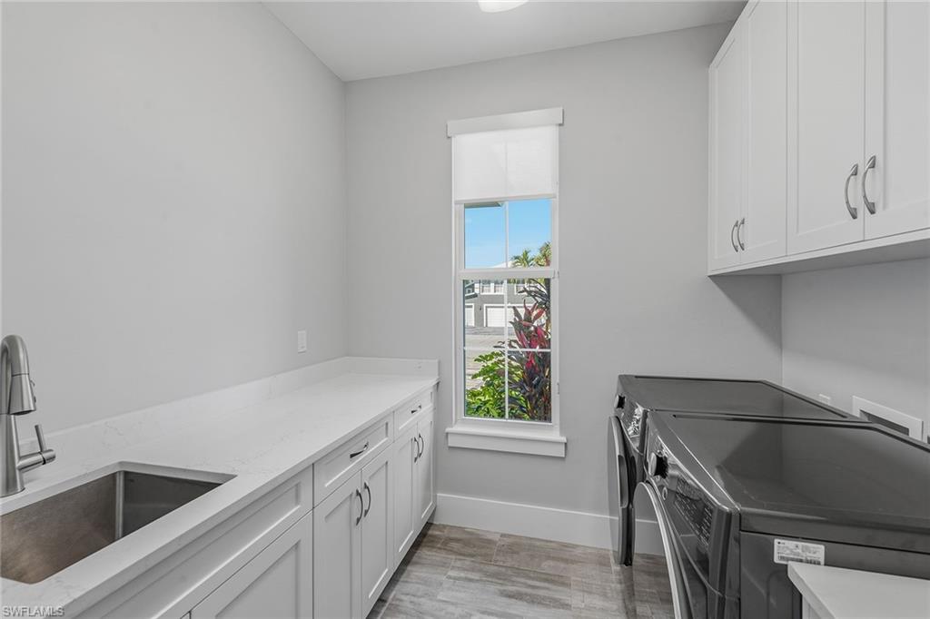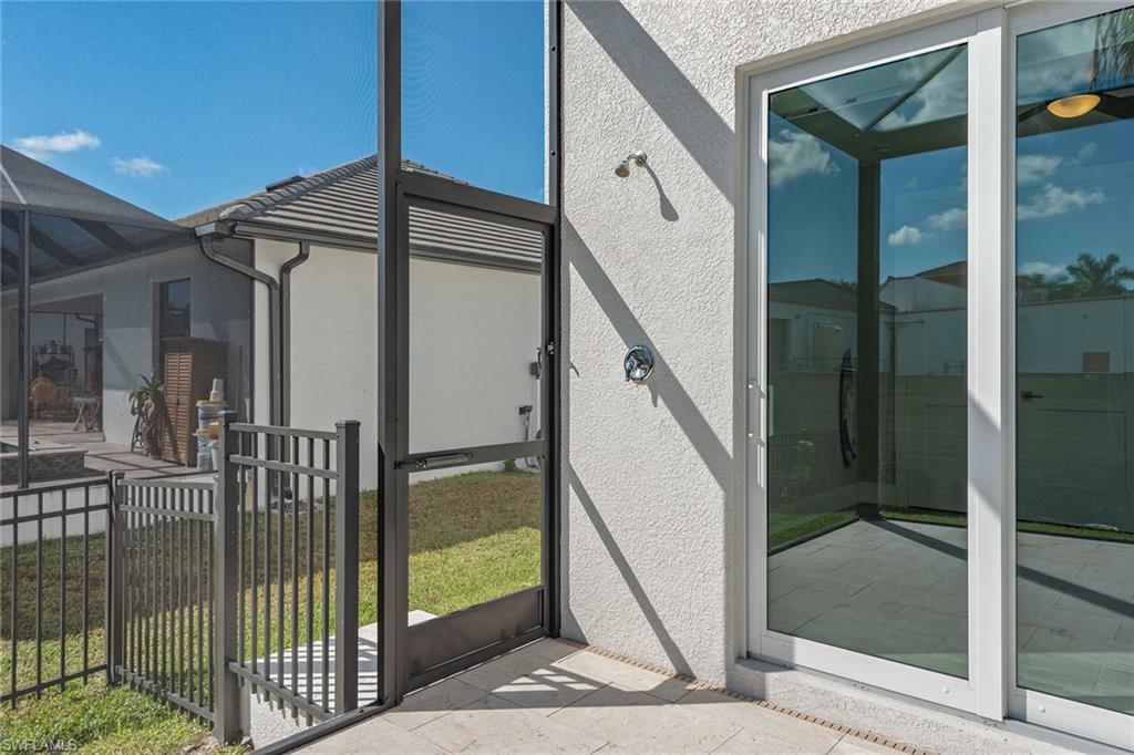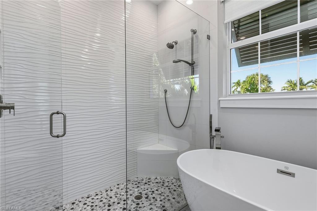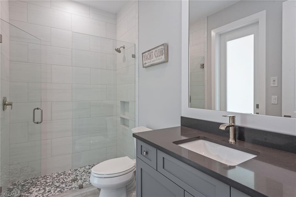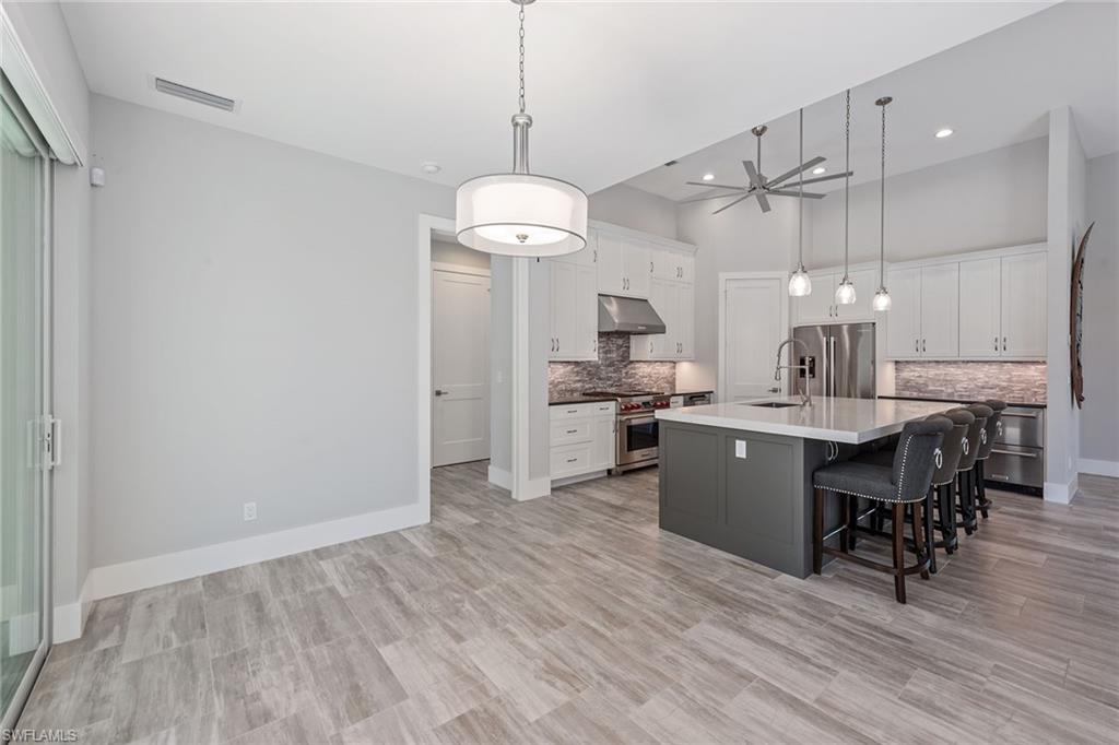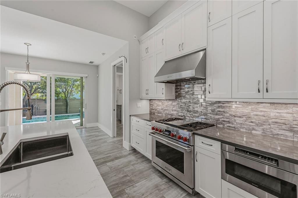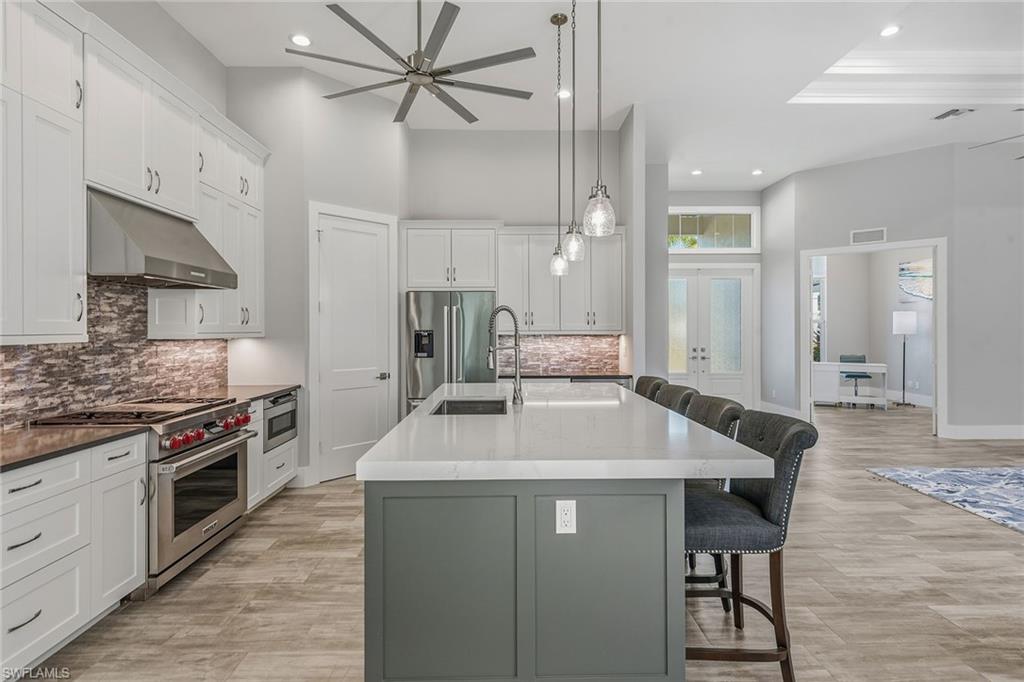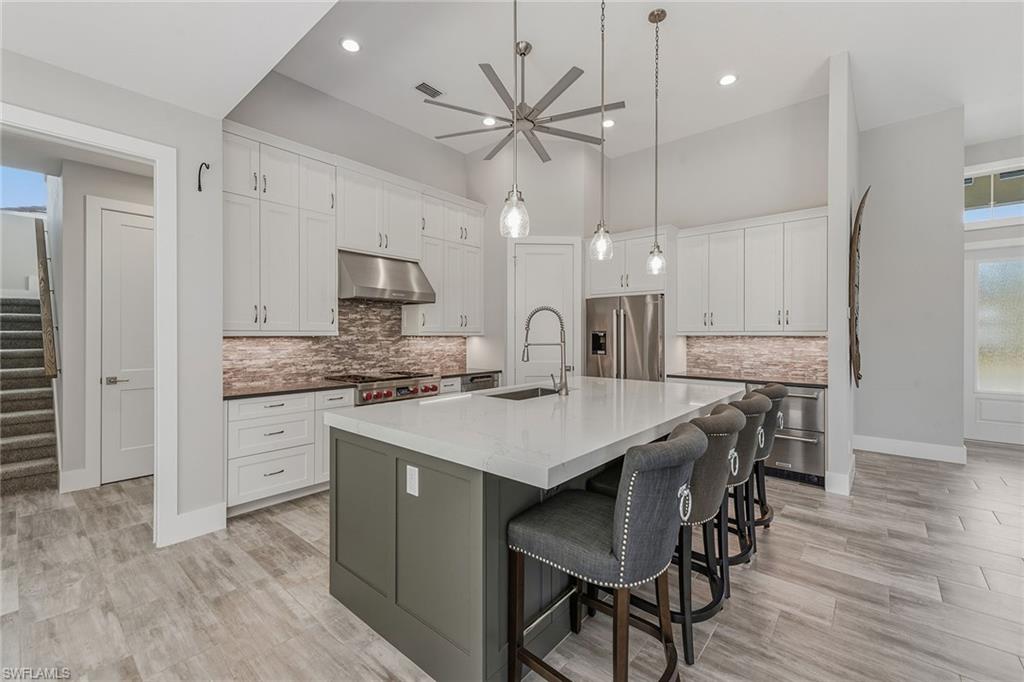 Custom built in 2024 by FCI, this stunning two-story residence offers the rare opportunity to enjoy a nearly new, meticulously crafted home on Marco Island with premium upgrades throughout, including a Wolf gas cooktop, whole-home generator, and an exceptional heated pool with spa designed for effortless indoor-outdoor living. From the moment you arrive, the home’s fresh, modern construction and thoughtful design create an immediate sense of luxury, comfort, and quality. Impact-resistant doors and windows, custom finishes, and a fully fenced backyard elevate this coastal retreat into a move-in-ready haven. Inside, the open layout features recessed lighting, modern ceiling fans, tile flooring, and custom window treatments that enhance the home’s clean, contemporary aesthetic. The gourmet kitchen is beautifully appointed with white cabinetry, under-cabinet lighting, quartz countertops with tile backsplash and a generous four-seater island that anchors the space. Premium appliances include Wolf four-burner gas cooktop with matching hood, under-counter microwave and refrigerated drawers. A walk-in pantry offers excellent storage, while the adjacent dining area features lanai access, creating seamless flow for entertaining. The living room overlooks the pool and spa and is highlighted by a tray ceiling and a three-panel glass slider that expands the living space outdoors. The luxurious primary suite offers a private retreat with a tray ceiling, French doors to the lanai, and two walk-in closets with wood shelving. The spa-inspired primary bath features a quartz dual-sink vanity, a separate soaking tub, and an oversized walk-in shower tiled floor to ceiling with multiple shower heads, a bench and frameless glass enclosure. Two guest bedrooms on the main level share a beautifully finished adjacent bath with a walk-in shower that also serves as a convenient pool bath. Upstairs, the expansive loft/bonus room provides exceptional flexibility with its own kitchenette featuring quartz counters and refrigerator drawers, a private screened lanai, a walk-in closet and an en-suite bath with a walk-in shower. A dedicated den with French-door entry is ideal for a home office or study, while the well-designed powder bath sits conveniently off the hallway. Outdoor living is at the heart of this home, showcased by a panoramic-screen lanai, Travertine deck and a stunning heated pool with spa, sun shelf and water feature. The covered outdoor living area includes a full outdoor kitchen with grill, sink and granite counters, ideal for year-round entertaining. The fully fenced backyard adds privacy and peace of mind. Additional features include quartz counters in laundry room and an oversized two-car garage with epoxy flooring.