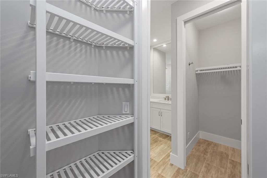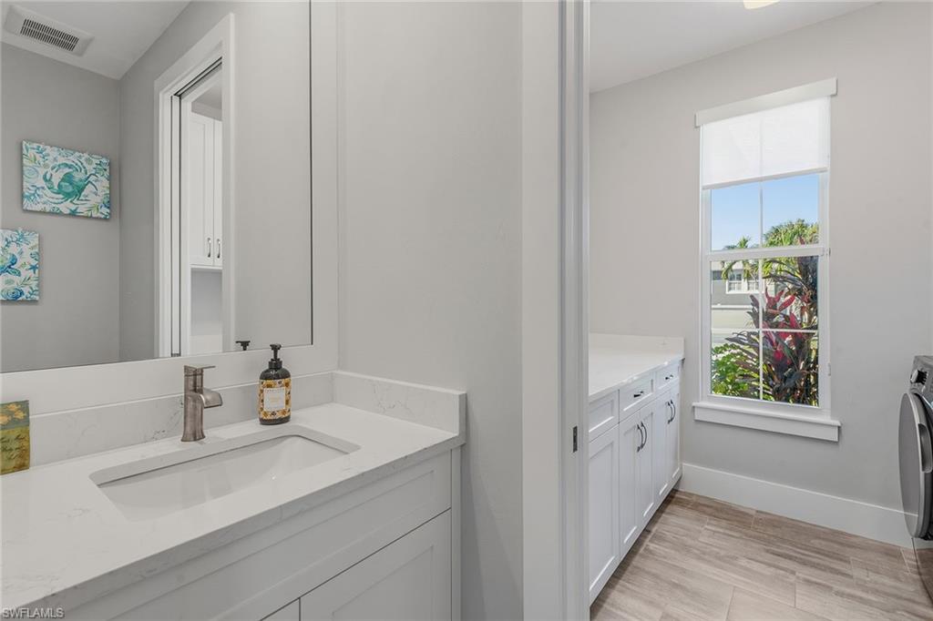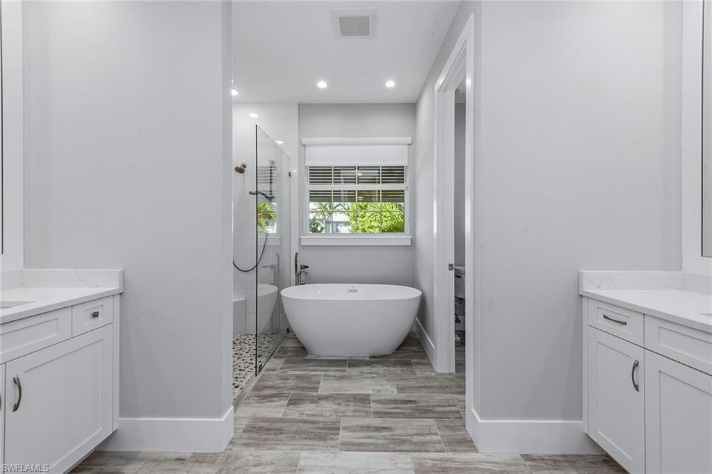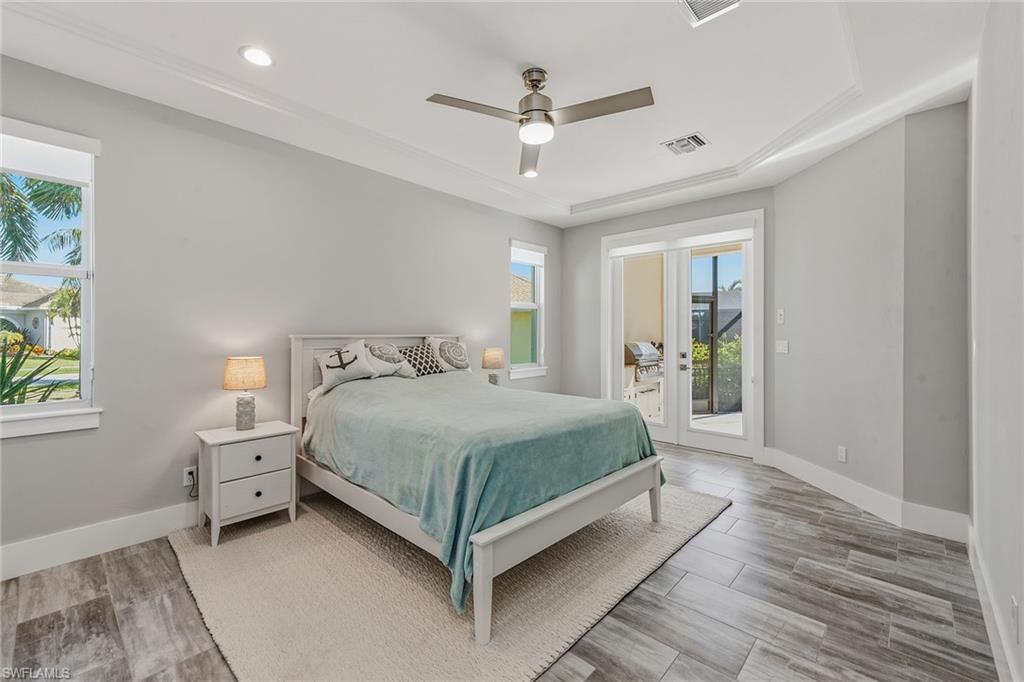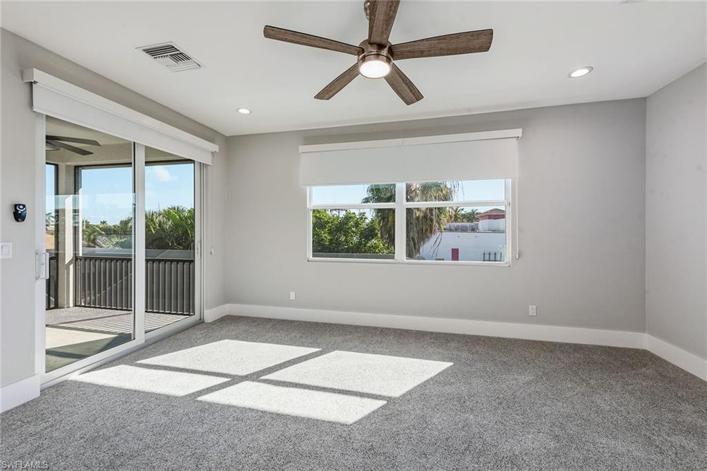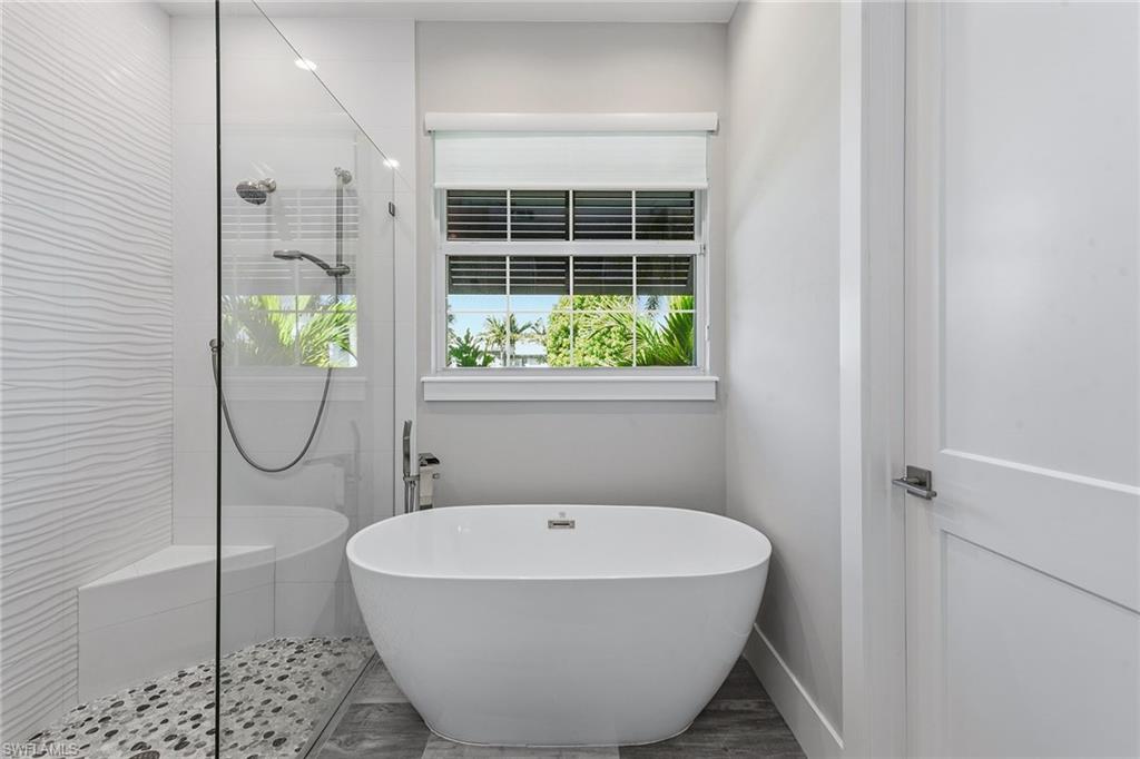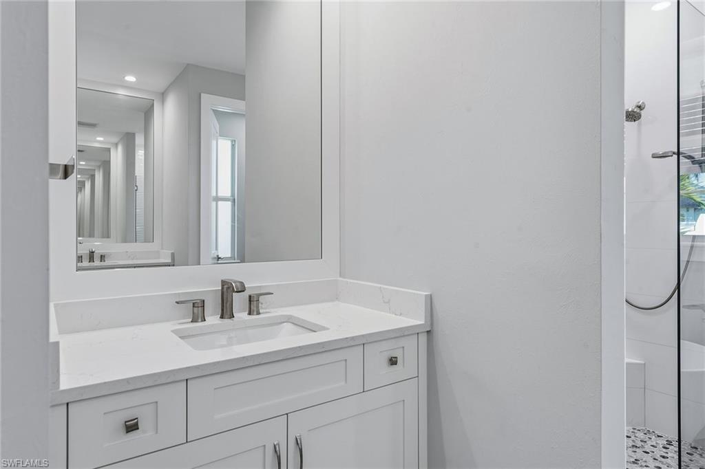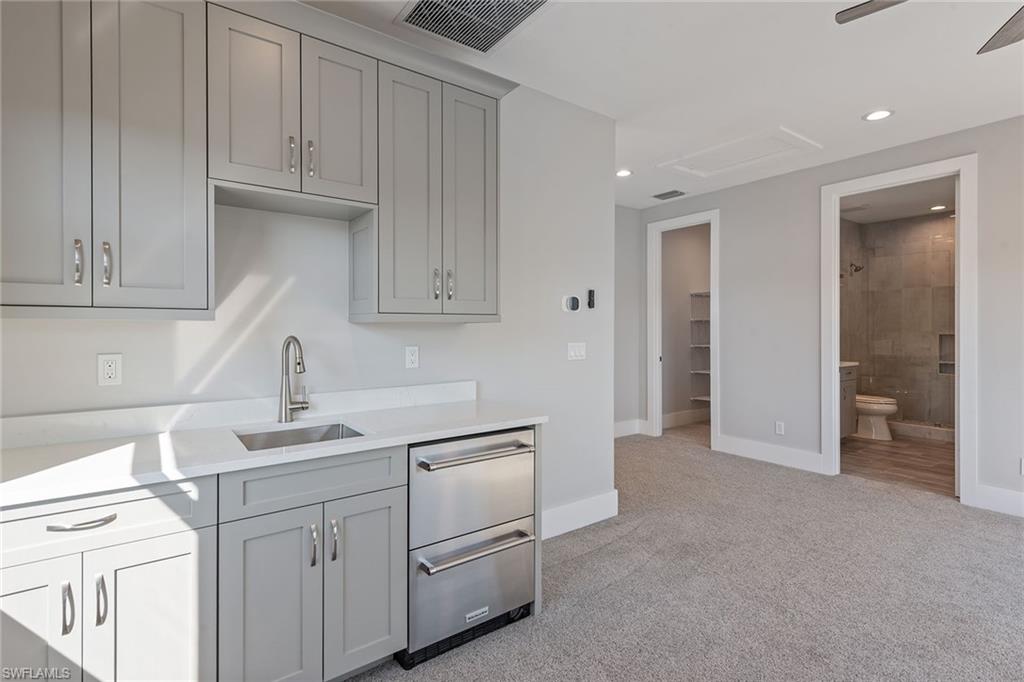 Custom built in 2024 by FCI, this stunning two-story residence offers the rare opportunity to enjoy a nearly new, meticulously crafted home on Marco Island with premium upgrades throughout, including a Wolf gas cooktop, whole-home generator, and an exceptional heated pool with spa designed for effortless indoor-outdoor living. From the moment you arrive, the home’s fresh, modern construction and thoughtful design create an immediate sense of luxury, comfort, and quality. Impact-resistant doors and windows, custom finishes, and a fully fenced backyard elevate this coastal retreat into a move-in-ready haven. Inside, the open layout features recessed lighting, modern ceiling fans, tile flooring, and custom window treatments that enhance the home’s clean, contemporary aesthetic. The gourmet kitchen is beautifully appointed with white cabinetry, under-cabinet lighting, quartz countertops with tile backsplash and a generous four-seater island that anchors the space. Premium appliances include Wolf four-burner gas cooktop with matching hood, under-counter microwave and refrigerated drawers. A walk-in pantry offers excellent storage, while the adjacent dining area features lanai access, creating seamless flow for entertaining. The living room overlooks the pool and spa and is highlighted by a tray ceiling and a three-panel glass slider that expands the living space outdoors. The luxurious primary suite offers a private retreat with a tray ceiling, French doors to the lanai, and two walk-in closets with wood shelving. The spa-inspired primary bath features a quartz dual-sink vanity, a separate soaking tub, and an oversized walk-in shower tiled floor to ceiling with multiple shower heads, a bench and frameless glass enclosure. Two guest bedrooms on the main level share a beautifully finished adjacent bath with a walk-in shower that also serves as a convenient pool bath. Upstairs, the expansive loft/bonus room provides exceptional flexibility with its own kitchenette featuring quartz counters and refrigerator drawers, a private screened lanai, a walk-in closet and an en-suite bath with a walk-in shower. A dedicated den with French-door entry is ideal for a home office or study, while the well-designed powder bath sits conveniently off the hallway. Outdoor living is at the heart of this home, showcased by a panoramic-screen lanai, Travertine deck and a stunning heated pool with spa, sun shelf and water feature. The covered outdoor living area includes a full outdoor kitchen with grill, sink and granite counters, ideal for year-round entertaining. The fully fenced backyard adds privacy and peace of mind. Additional features include quartz counters in laundry room and an oversized two-car garage with epoxy flooring.