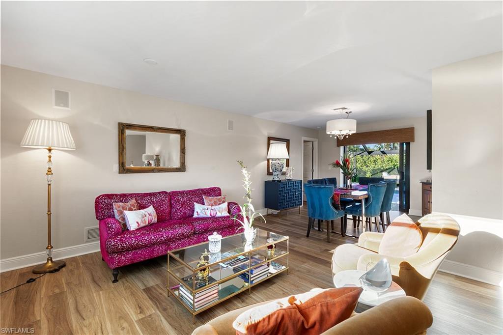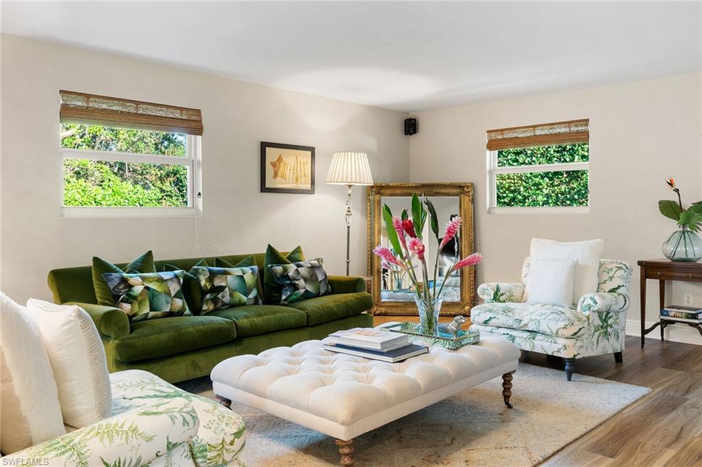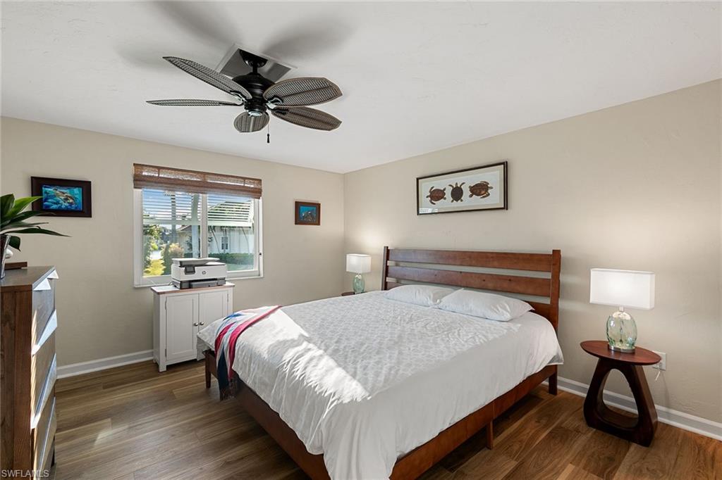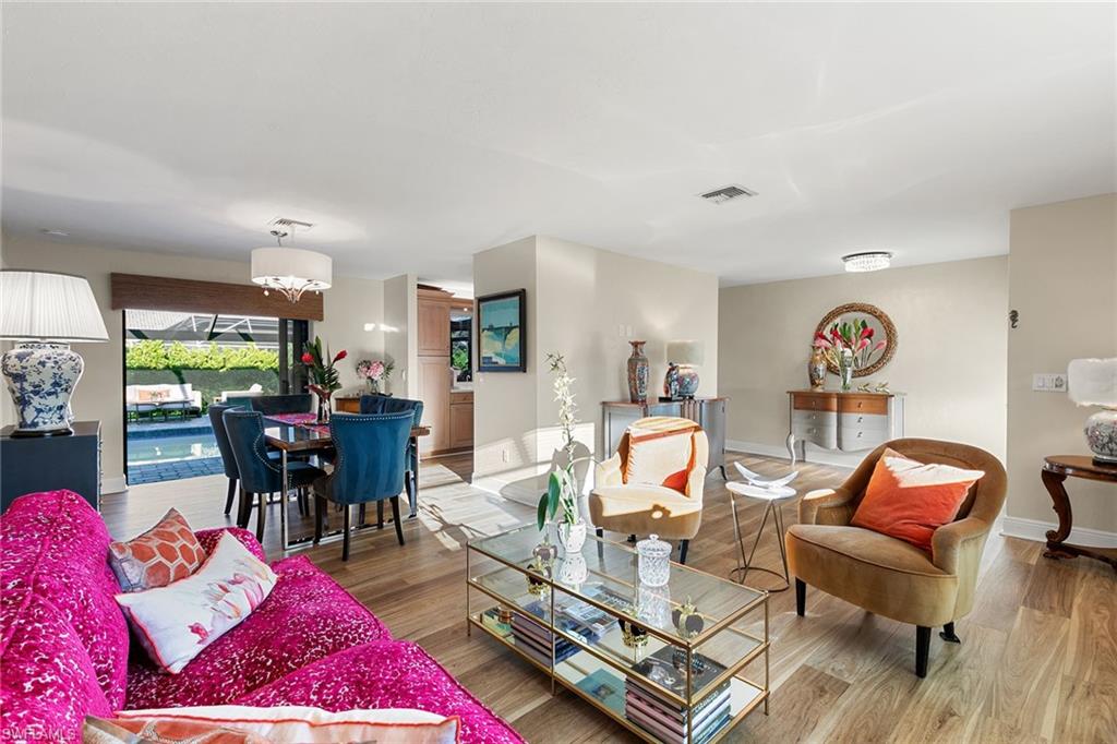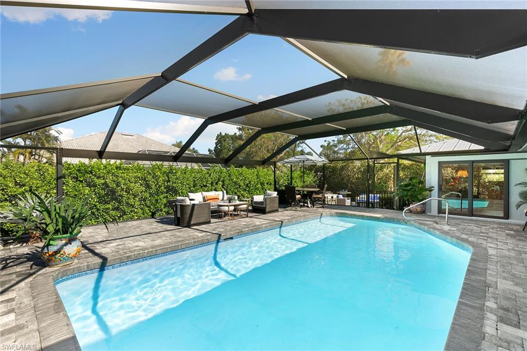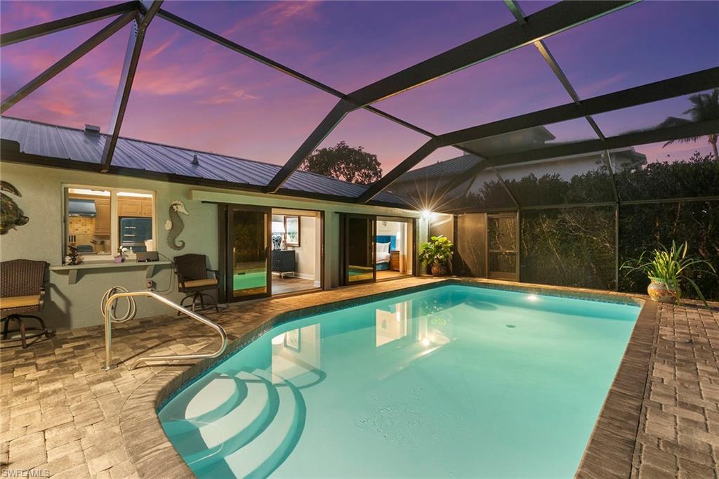This beautifully updated island residence offers fabulous outdoor living space and is conveniently near renowned beaches, shopping and dining in the desirable Tigertail neighborhood of Marco Island. The thoughtful floor plan features a primary bedroom for privacy at one end of the home, with two additional bedrooms in a separate wing for guest comfort. There are two full baths, as well as distinct living and family rooms. Custom blinds have been installed throughout the property. The kitchen has been modernized with Big Chill appliances. The home boasts concrete block construction and includes numerous upgrades including a new air conditioner (2019), metal roof (2020), hurricane-impact glass windows and doors (2021), and a hurricane-rated garage door (2022). Elegant honey oak luxury vinyl plank flooring provides a coastal aesthetic with a contemporary finish. The expansive outdoor area is designed for entertaining, featuring a newly added, large rear paved patio and a state-of-the-art Buzz Off system. The updated pool area includes a resurfaced oversized pool and full panoramic screens. Lush tropical landscaping surrounds the property, and the yard is enclosed with a wrought iron fence, ideal for children and pets. There is also the potential for an additional quarter-acre expansion. Experience a seamless transition to the Island lifestyle in this exceptional property, a rare opportunity and a must-see.