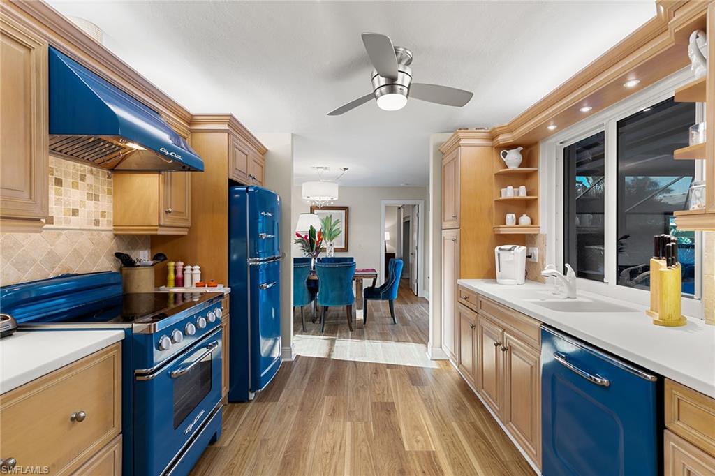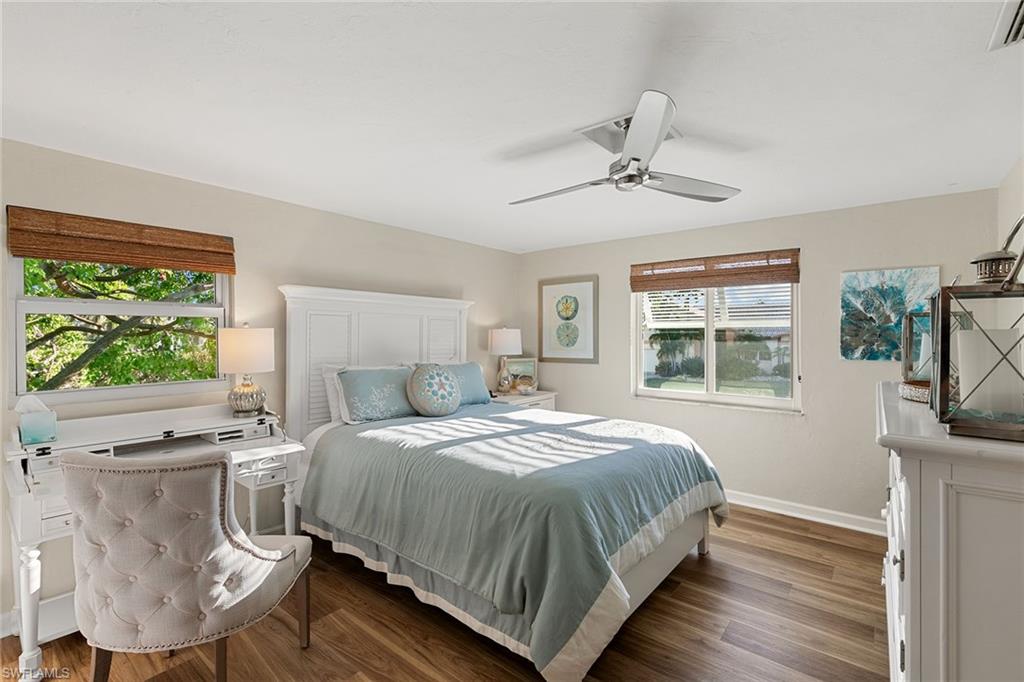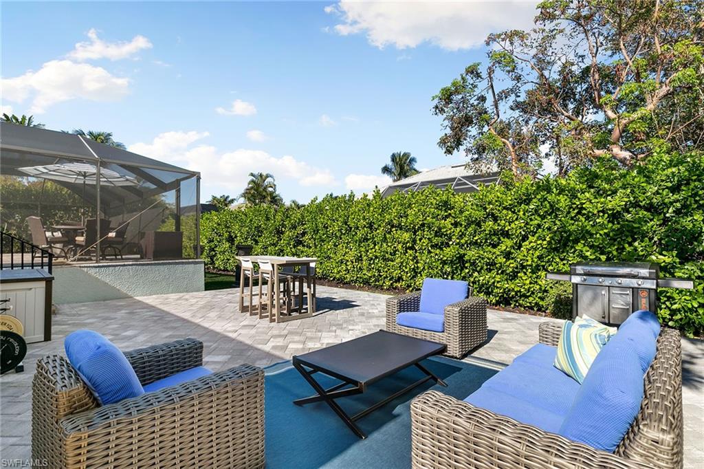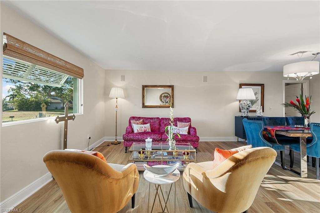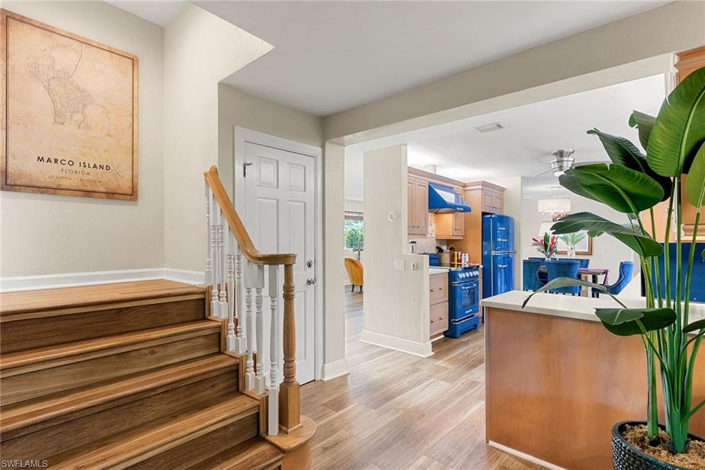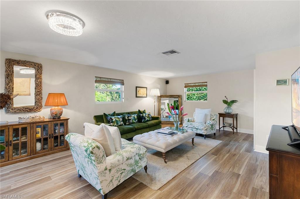 This beautifully updated island residence offers fabulous outdoor living space and is conveniently near renowned beaches, shopping and dining in the desirable Tigertail neighborhood of Marco Island. The thoughtful floor plan features a primary bedroom for privacy at one end of the home, with two additional bedrooms in a separate wing for guest comfort. There are two full baths, as well as distinct living and family rooms. Custom blinds have been installed throughout the property. The kitchen has been modernized with Big Chill appliances. The home boasts concrete block construction and includes numerous upgrades including a new air conditioner (2019), metal roof (2020), hurricane-impact glass windows and doors (2021), and a hurricane-rated garage door (2022). Elegant honey oak luxury vinyl plank flooring provides a coastal aesthetic with a contemporary finish. The expansive outdoor area is designed for entertaining, featuring a newly added, large rear paved patio and a state-of-the-art Buzz Off system. The updated pool area includes a resurfaced oversized pool and full panoramic screens. Lush tropical landscaping surrounds the property, and the yard is enclosed with a wrought iron fence, ideal for children and pets. There is also the potential for an additional quarter-acre expansion. Experience a seamless transition to the Island lifestyle in this exceptional property, a rare opportunity and a must-see.