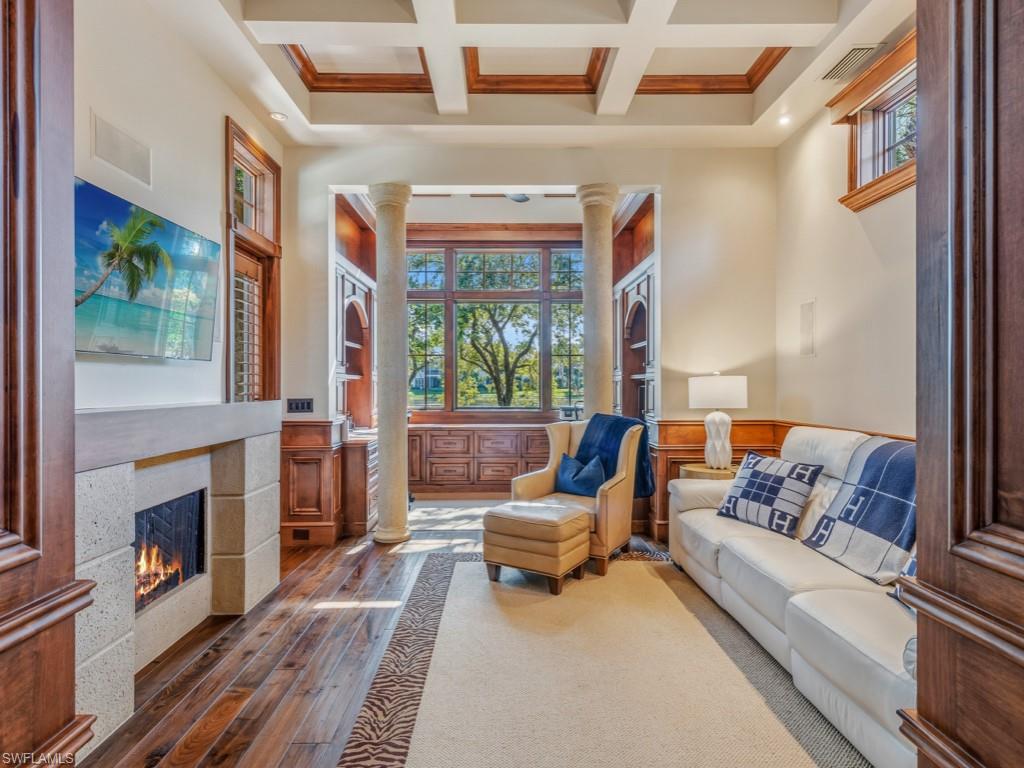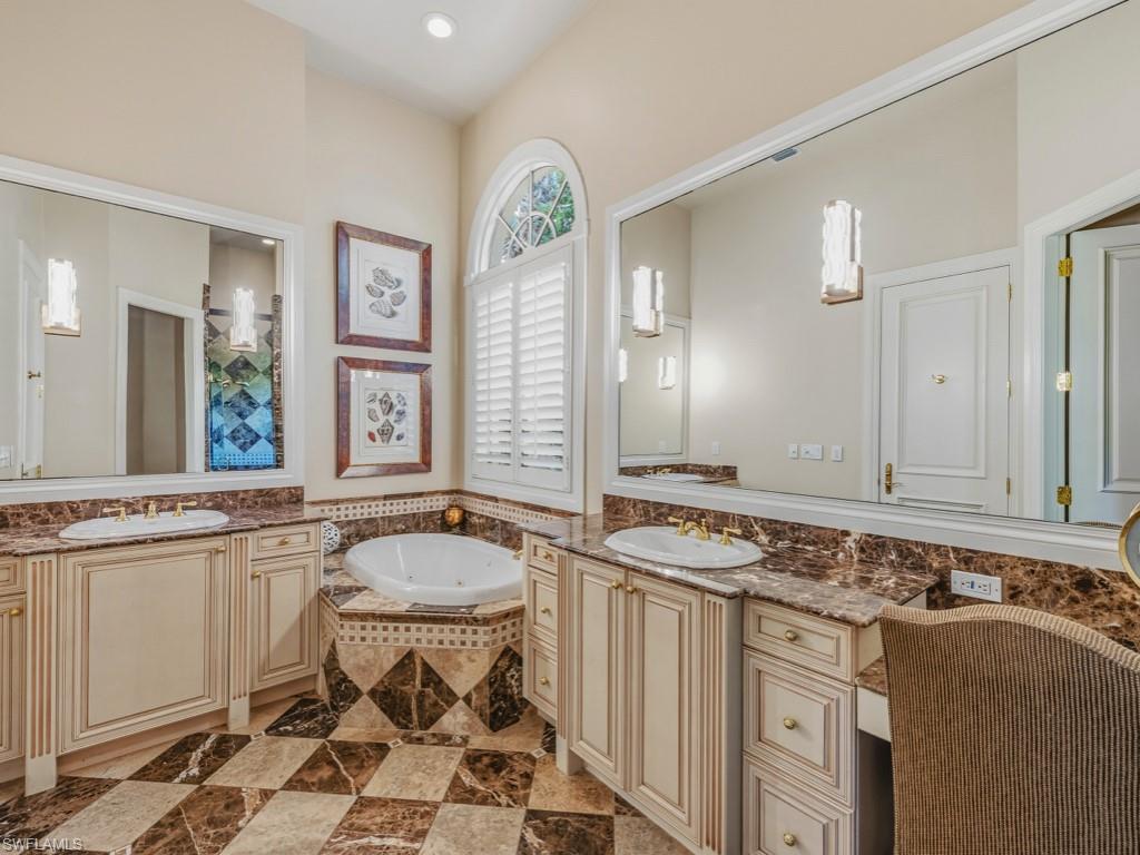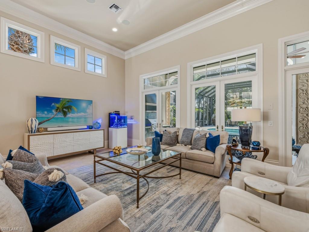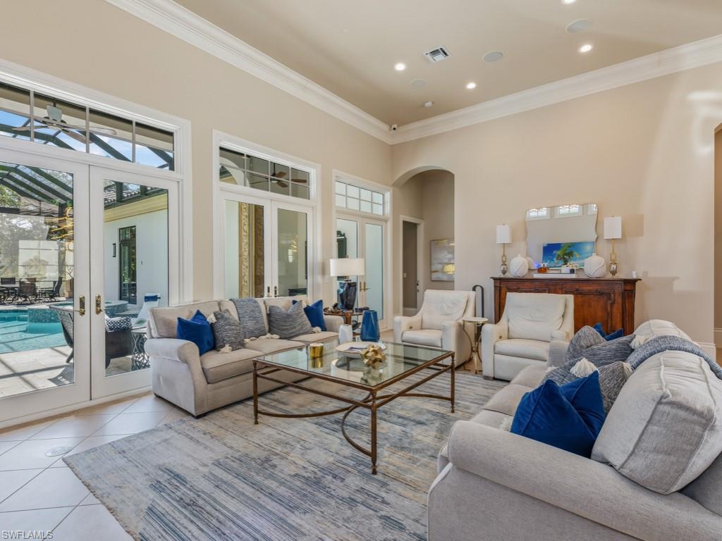 Located in the prestigious Mediterra golf & country club community of Naples, which features a newly renovated private beach club! ~ Welcome to a masterfully upgraded home where timeless architecture meets modern luxury living. Framed by refreshed landscaping and new exterior paint, this home unfolds into sun-filled interiors with soaring ceilings, wide-plank hardwood floors, redesigned lighting, and a freshly painted palette that elevates every room. The kitchen and living spaces blend seamlessly into generous gathering areas. At the same time, the primary suite offers a bonus, secluded den or office, and a lounge with new designer carpeting and refined finishes. The guest bath has been completely transformed with marble flooring and boutique-level tilework. Outdoors, the lifestyle is pure Naples lifestyle perfection with a refinished resort-style pool, travertine deck, updated saltwater system, new LED lighting, titanium heater, refreshed lanai surfaces, and an upgraded outdoor kitchen with new granite and tile surrounding the premium built-in gas grill—perfectly appointed for relaxing or entertaining. Major improvements provide true peace of mind, including a newer roof, a Trane A/C system with UV sanitation, redesigned ductwork, a tankless water system, a whole-home generator, new gutters, full termite and woodpecker protection, and updated courtyard doors, windows, and weatherproofing. Every detail has been thoughtfully enhanced inside and out, creating a home that lives like a newly built custom residence. Mediterra is a prestigious luxury golf & country club community featuring two championship Tom Fazio golf courses for avid golfers, a private beach club with a restaurant & bar, multiple tennis courts, pickleball & bocce, a fitness center, pristine bike & jogging trails, and luxurious dining at the private country club restaurant. The Mediterra Beach Club offers an escape to a 10,000 sq. ft two-story private oceanfront paradise on the Gulf of Mexico. Featuring a restaurant & bar that serves members via indoor & outdoor dining, this private facility boasts a heated swimming pool, a sundeck, and cabana beach service for chairs, umbrellas & refreshments.