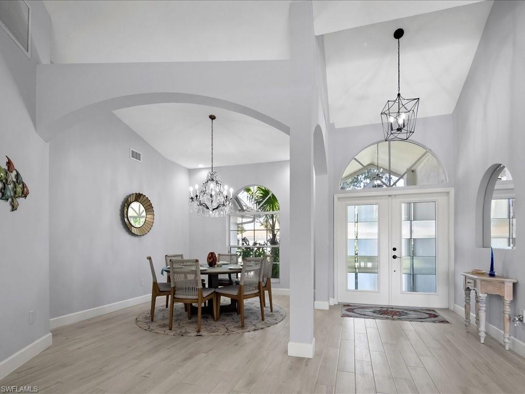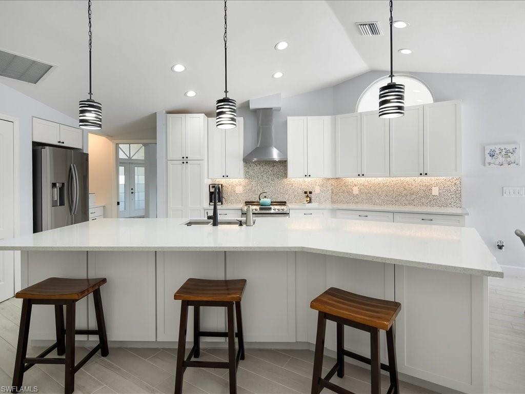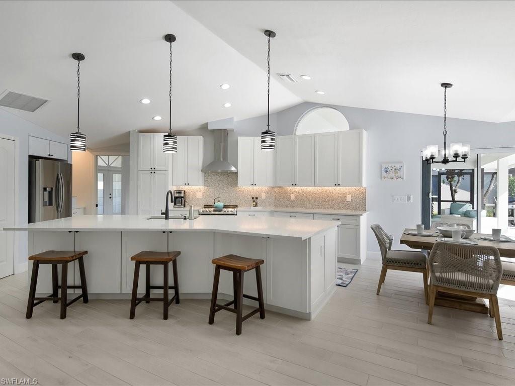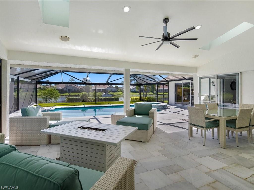 Thoughtfully remodeled (2022+) with modern finishes and an intuitive, airy layout, this turnkey residence sets a new standard for elevated comfort and recreation, situated in Longshore Lake, a coveted North Naples community offering resort-style amenities and close proximity to the Gulf’s sugar-sand beaches. Extensive updates include a new roof, exterior paint, driveway pavers, front door, garage door and opener, fresh interior paint, new window coverings, updated lighting fixtures, and fully renovated bathrooms and kitchen. Newer mechanicals—including the AC and hot water heater—provide added peace of mind. The interior offers 3 generously sized bedrooms, 2.5 baths, soaring ceilings, porcelain plank tile throughout, and multiple indoor and outdoor living areas, creating an inviting environment perfect for both everyday living and effortless entertaining. A formal living room welcomes guests with elegance, while the expansive great room—with its cozy fireplace and views of the sparkling pool—anchors the heart of the home. The fully renovated kitchen is a standout, offering new cabinetry, stone/quartz counters, an eye-catching tile backsplash, an eat-in island with hidden storage, induction range, wine cooler, pantry, and an informal dining space. Indoor–outdoor living takes center stage with pocketing sliders that open wide from the formal living room, great room, primary suite, and guest bedroom, creating a seamless connection to the sprawling screened lanai. This outdoor oasis has been completely transformed with an all-new picture-window pool cage, fresh outdoor pavers, a resurfaced pool, all-new pool tile, a brand-new spa, and a convenient pool bath. Skylights illuminate the generous undercover entertaining area, while the adjoining turf recreation zone—ideal for a putting green or play space—adds a touch of fun and functionality. French doors lead to the primary suite boasting a breathtaking spa-like bath with a free-standing soaking tub framed by dual vanities. Longshore Lake elevates the experience even further with reciprocal memberships to many of Naples’ most prestigious clubs, spanning golf, tennis, fitness, and even spa amenities. Your North Naples retreat awaits—luxuriously updated, perfectly located, and designed for the lifestyle you’ve been dreaming of.