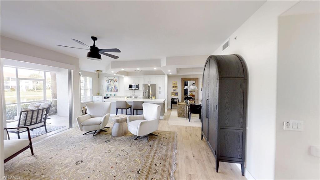 Meticulously maintained Ibis floorplan with spectacular long water views and a private first-floor entrance. This pristine 2-bedroom plus den, 2-bath condo lives like a coach home, with a paver-brick driveway, courtyard entry, and attached garage. Walls of glass sliders along the back of the residence fill the home with natural light and frame the tranquil lake setting. Inside, imported wood-look plank tile runs throughout, complemented by upgraded doors, trim, hinges, hardware, and taller baseboards for a clean, updated look. The redesigned kitchen features an oversized island, extended cabinetry, quartz countertops, and quartz backsplash, a Kohler Pro faucet, and stainless-steel appliances, including an upgraded Electrolux refrigerator. Additional details include LED recessed lighting with small-aperture cans, custom valances and shades, new ceiling fans, and designer Philip Starck pendant lighting in the dining area. The primary suite offers water views and access to the lanai, with PGT impact sliders and custom window treatments for peace of mind and comfort. The spa-like primary bath was reimagined with raised custom cabinetry, an elegant tiled shower with seamless glass, a soaking tub surrounded by rich, imported floor-to-ceiling tile, and new toilets, sinks, and faucets. The split floor plan features a private guest wing with easy access to the remodeled guest bath, ideal for visitors. Practical upgrades continue with PGT impact windows throughout, an epoxy-coated garage floor, and NewAge garage storage systems for organized, turnkey living. Residents can also relax at the nearby resort-style pool, spa, and cabana for effortless vacation-at-home living. Living in Pelican Marsh means a vibrant, amenity-rich lifestyle in one of Naples premier gated communities, just minutes from Mercato, Waterside Shops, Shoppes at Vanderbilt, Artis Naples, and the area’s white sand beaches. Enjoy 8 lighted Har-Tru tennis courts with pro shop and instruction, 6 lighted pickleball courts, 3 bocce courts with leagues and workshops, a state-of-the-art fitness center with trainers & spa services, walking and biking paths through 100+ acres of preserves, and an on-site restaurant offering weekly entertainment. The full-time social directors offer year-round events at the community center. Experience the best of Florida living in a nationally recognized master-planned community. Schedule your private showing today.