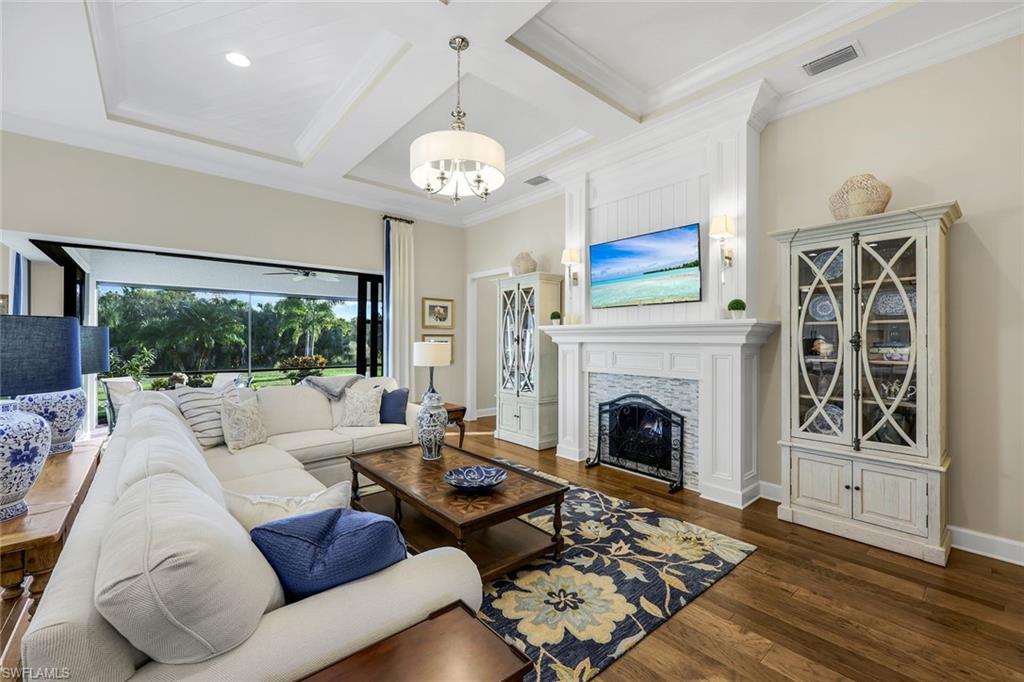 Stunning Pinnacle Model with Exceptional Upgrades Throughout Discover refined living in this beautifully appointed Pinnacle model, offering 3 bedrooms + den, 3 baths, and an oversized 3-car garage extended by 4 feet with an epoxy floor. Designed for both elegance and comfort, this home features an open-concept floor plan enriched with premium finishes at every turn. Step inside to find tray ceilings, crown molding, custom window treatments, and plantation shutters that elevate each space. Gorgeous wood flooring flows throughout the main living areas and bedrooms, with tile in the baths and laundry room. The den/home office showcases French doors and wood inlay ceiling details, which continue into the great room and lanai for a cohesive, upscale design. A beautiful fireplace adds warmth and ambiance, creating a welcoming focal point in the main living area. The gourmet kitchen is a true showpiece, boasting quartz countertops, upgraded KitchenAid appliances, and a wine bar—ideal for both everyday living and effortless entertaining. Zero-corner sliders open wide to the screened lanai and extended paver patio, offering seamless indoor-outdoor living perfect for gatherings or quiet relaxation. There is plenty of room to add your own custom pool if desired. Retreat to the serene primary suite, highlighted by a shiplap accent wall that adds charm and character to the space. The suite is complemented by a spacious, beautifully designed bathroom, offering the perfect blend of comfort and luxury. Additional features include impact windows and doors as well as a whole house generator for year-round peace of mind. Located within a highly amenitized community, residents enjoy an exceptional lifestyle with tennis, pickleball, bocce, and a vibrant food and beverage program, including a restaurant and outdoor bar. A fabulous resort-style pool anchors the social hub of the community. Every homeowner is a social member, with the added benefit of off-season golf access or the option to purchase a full golf membership. This home combines thoughtful upgrades, timeless style, and an extraordinary community lifestyle—crafted to impress even the most discerning buyer.