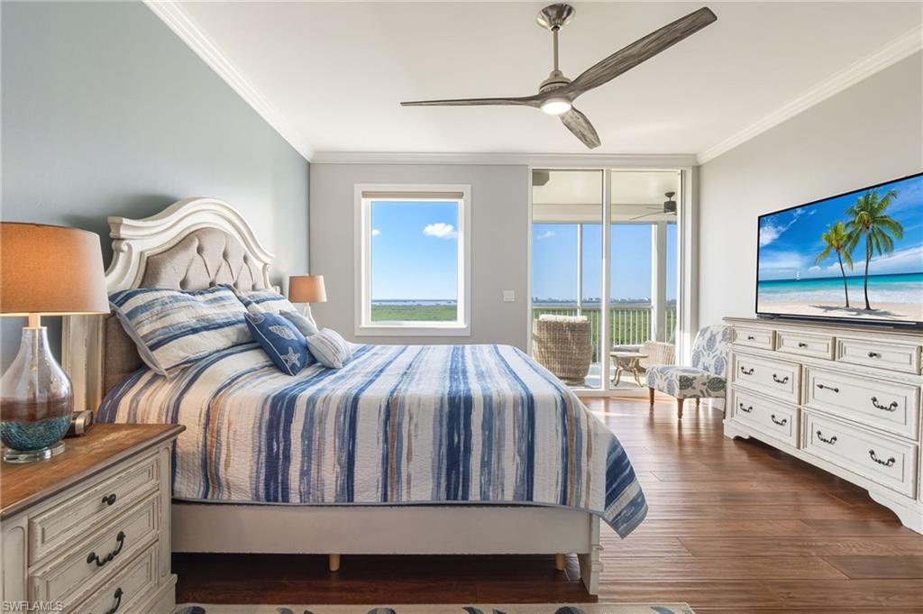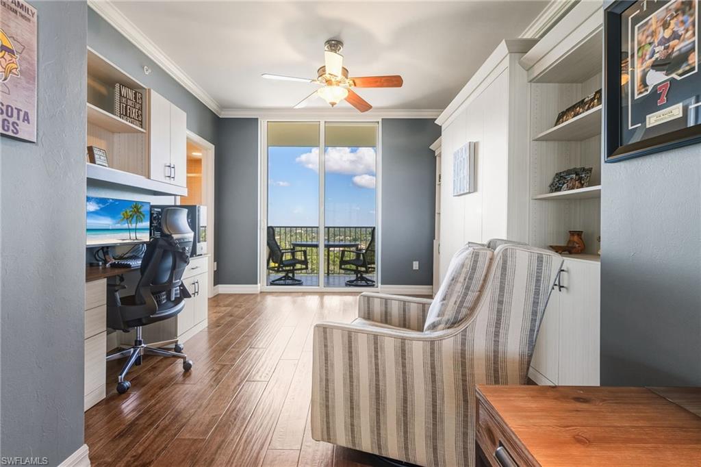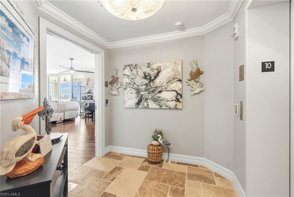 Experience elevated coastal living in this beautifully appointed 3-bedroom, 3-bath residence on the 10th floor of Jasmine Bay South at West Bay Club. Offering 2,150 square feet of refined comfort, this home showcases beautiful wood flooring throughout, tray ceilings, crown molding, recessed lighting, and custom window treatments. The gourmet kitchen features European-style wood cabinetry, granite countertops, and new high-end stainless-steel appliances. The dining area offers custom cabinetry for additional storage plus dual wine refrigerators below the bar area – perfect for entertaining. The third bedroom can be an office area or double as a 3rd bedroom with built-in Murphy bed on the south wall. The spacious great room opens to a private balcony with sweeping, unobstructed views of the golf course, Estero Bay, and the Gulf—an ideal backdrop for morning coffee or evening sunsets. A private elevator entry enhances the sense of exclusivity, while hurricane shutters provide added peace of mind. Jasmine Bay residents enjoy an array of luxury amenities, including an infinity-edge pool, hot tub, private cabanas, gas grills, guest suites, a clubroom, and a fitness center. West Bay Club further elevates the lifestyle with its newly built Beach Club on the Gulf of Mexico, complete with restaurant/bar and chair/towel service. Additional community amenities include the renovated Bay House with resort pool and Aqua Café, 8 clay tennis courts, a Technogym fitness center, pickleball complex, bocce, dog parks, a 1.5-mile nature trail, and the River Park with boat launch, kayak/canoe access, fishing pier, and more. Optional memberships are available for the private 18-hole Pete & P.B. Dye championship golf course and clubhouse. This exceptional residence offers luxury, lifestyle, and breathtaking views in one of Southwest Florida’s most sought-after communities.