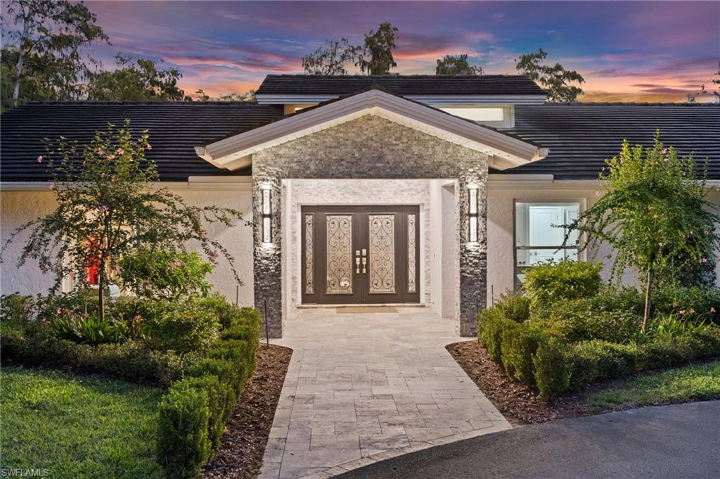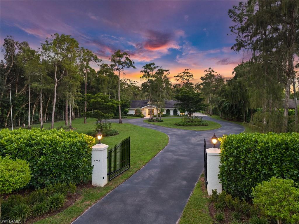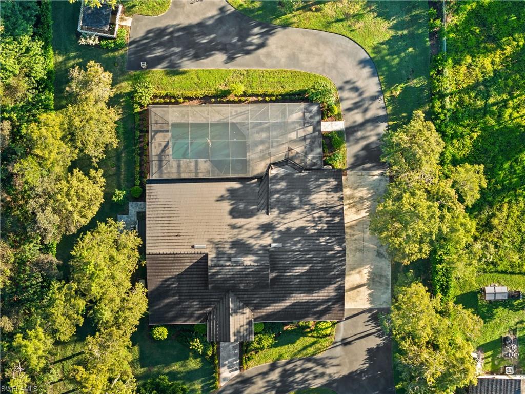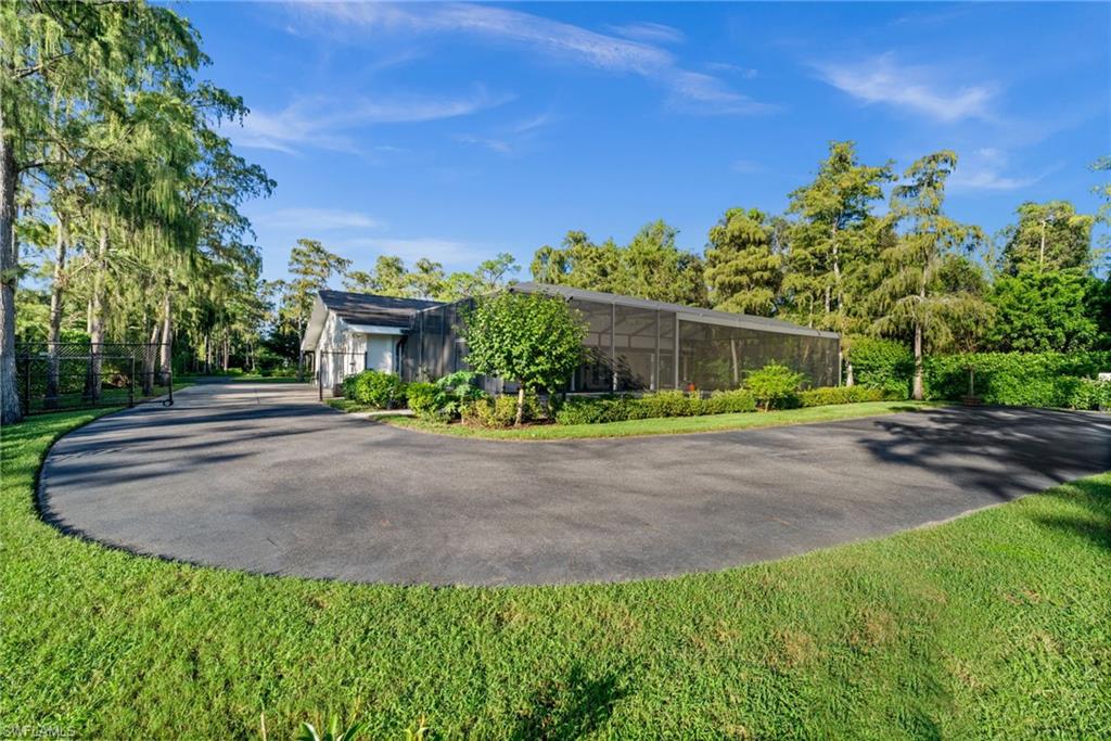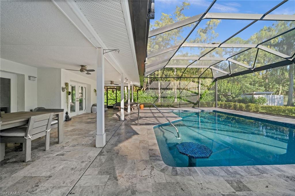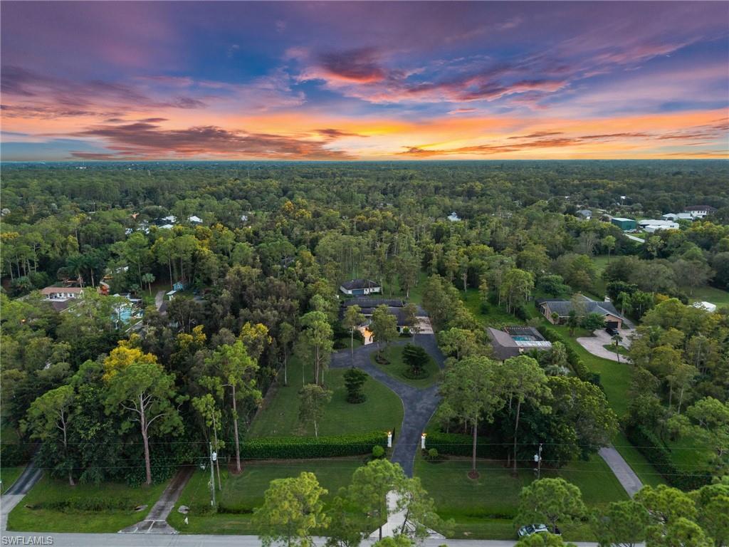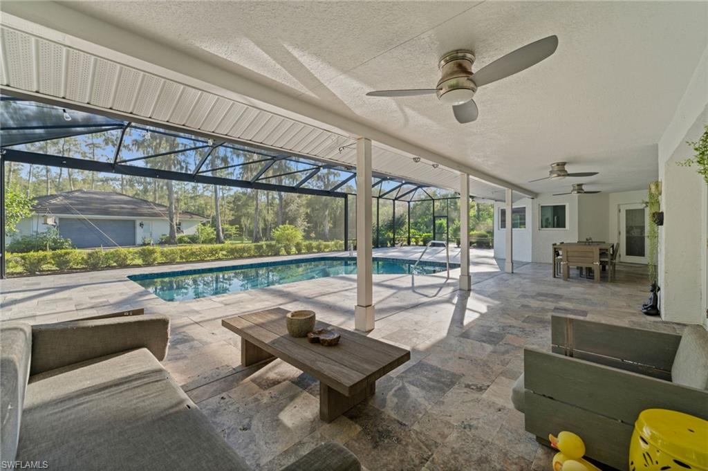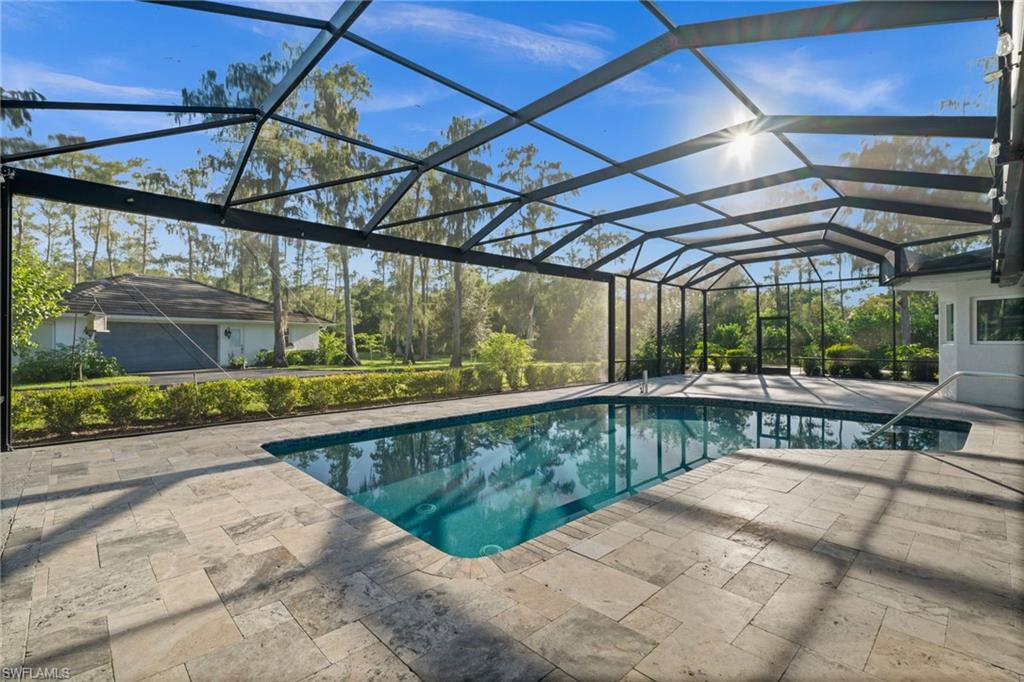 Step into this **fully upgraded and renovated** 4-bedroom, 4-bath, 3-car garage pool home, set on **2.27 acres** of beautifully wooded land! Located in the gated Logan Woods community of Naples, this residence is surrounded by an idyllic park-like setting both in front and behind, offering ultimate privacy and a serene immersion in nature. This move-in-ready home has been meticulously renovated down to the studs, showcasing a **2017 slate tile roof**, **impact glass windows**, sliders, and doors. Enjoy a fully redesigned kitchen and bathrooms, complemented by new wood plank look tile flooring throughout. The property features an automatic motorized entry gate, gas service via a buried propane tank, a whole house generator, and a reverse osmosis water system. Inside, experience soaring ceilings and a thoughtfully reengineered floor plan that includes dual living spaces, one featuring a wet bar with a wine fridge and a custom floor-to-ceiling fireplace mantel. The guest wing, accessible through elegant French doors, comprises two bedrooms and two full baths. The expanded kitchen boasts raised ceilings, enhancing the overall spaciousness. Step outside to the expansive **nearly 1,400 sq ft pool deck**, which features a newly rebuilt saltwater pool, complete with a spa area equipped with independent hot water jets and an in-pool bistro table with seating. New travertine marble flooring and a picture screen enclosure with upgraded no-see-um screening further enhance the outdoor experience, maximizing the stunning views of nature. Enjoy prime south exposure for ideal sun on the pool and breathtaking sunsets over the wooded vistas; the yard also includes an automatic sprinkler system and is fully fenced. The stunning renovated kitchen features custom white quartz countertops, a mix of white and espresso-colored soft-close cabinetry, all new stainless steel appliances including a gas range, and a generous island with seating. The spa-like primary bath offers white cabinetry, oversized shower with a frameless enclosure, multiple shower heads, stunning marbled tile, a modern freestanding tub, and a separate water closet. The **nearly 1,200 sq ft oversized 3-car garage outbuilding** has been cleverly divided into a 2-car garage and an air-conditioned storage room, which could easily be converted back to a 3-car garage. With multiple parking areas and long driveways, there's ample space for your boat, jet skis, and more. Logan Woods boasts no HOA fees and a fantastic location just 5 minutes from I-75, 10 minutes to Logan Landings, and 15 minutes to Mercato, surrounded by excellent restaurants and entertainment options. The property is fully fenced with fresh landscaping, providing a perfect blend of comfort and convenience.