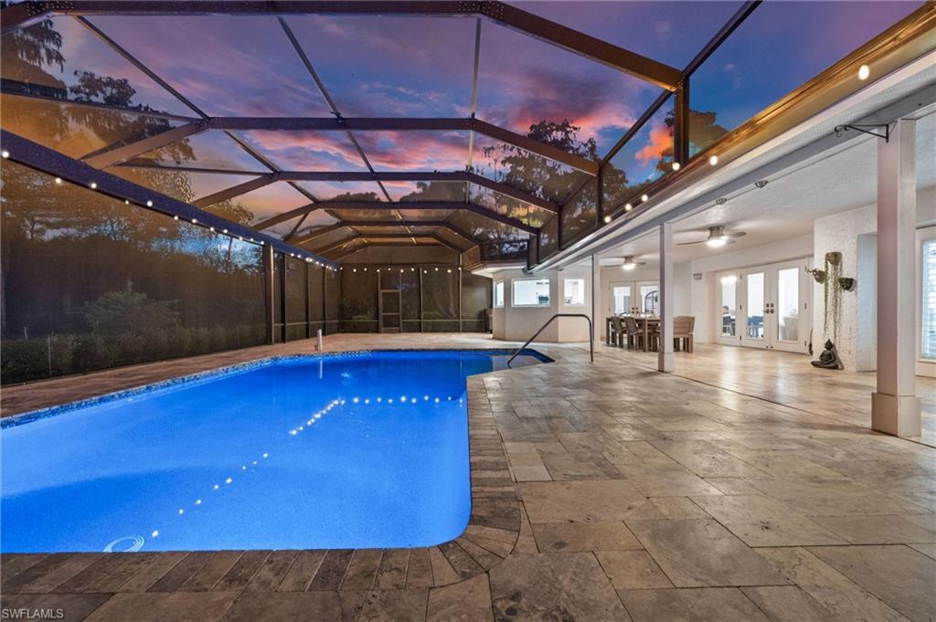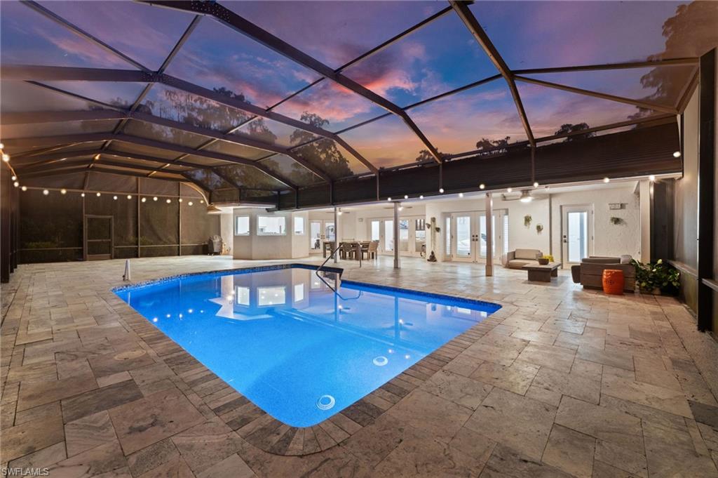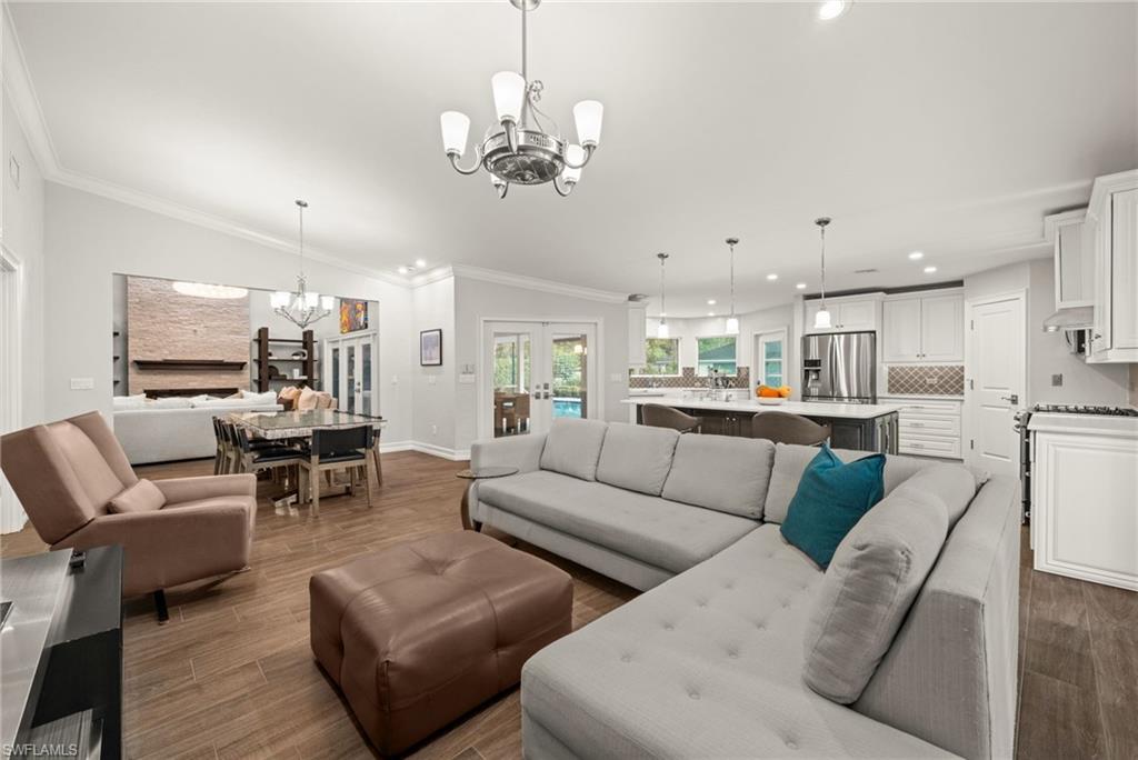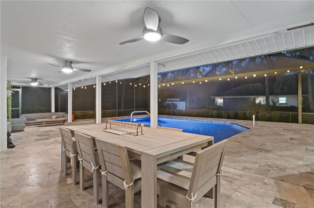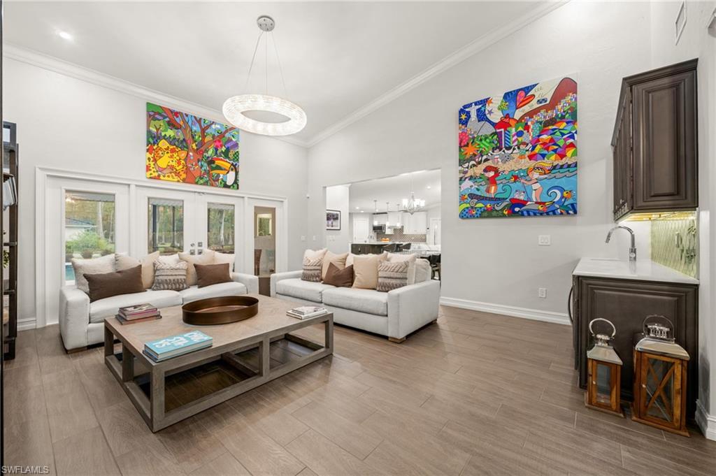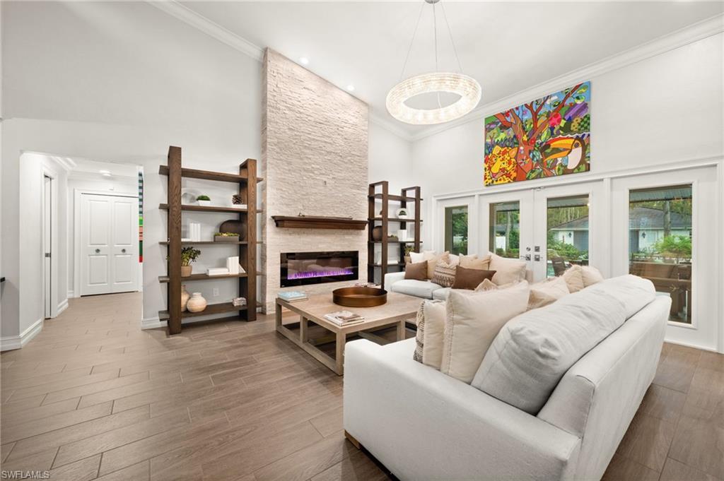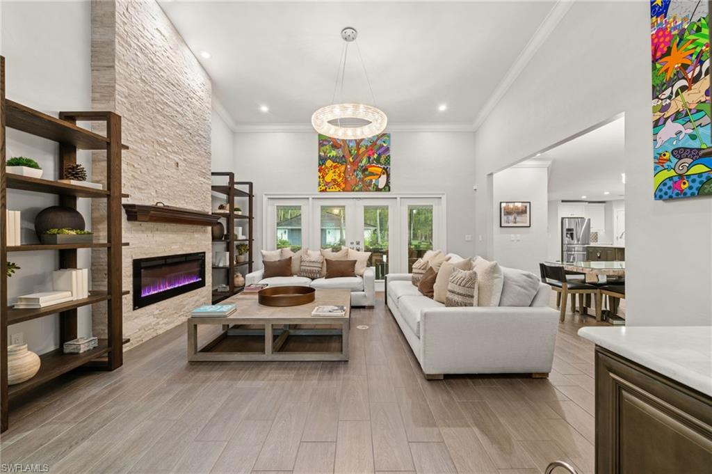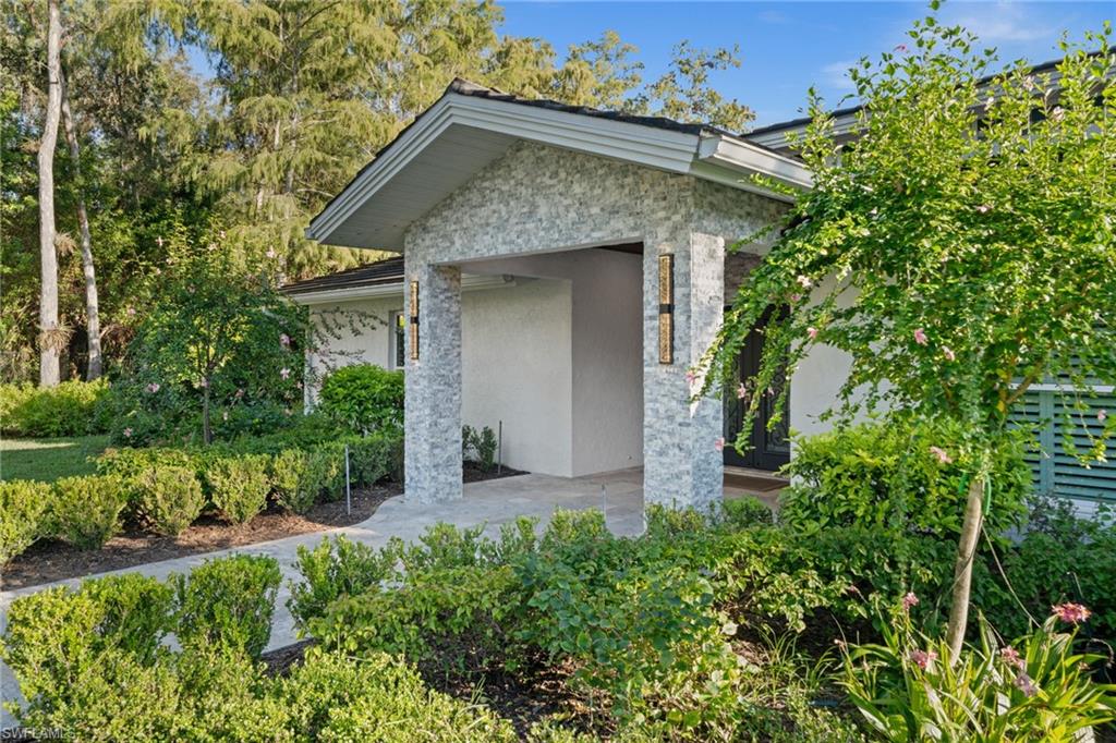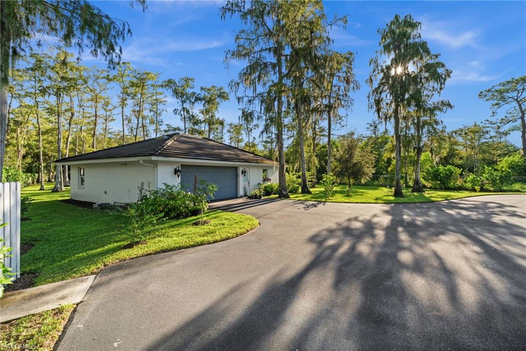 Step into this **fully upgraded and renovated** 4-bedroom, 4-bath, 3-car garage pool home, set on **2.27 acres** of beautifully wooded land! Located in the gated Logan Woods community of Naples, this residence is surrounded by an idyllic park-like setting both in front and behind, offering ultimate privacy and a serene immersion in nature. This move-in-ready home has been meticulously renovated down to the studs, showcasing a **2017 slate tile roof**, **impact glass windows**, sliders, and doors. Enjoy a fully redesigned kitchen and bathrooms, complemented by new wood plank look tile flooring throughout. The property features an automatic motorized entry gate, gas service via a buried propane tank, a whole house generator, and a reverse osmosis water system. Inside, experience soaring ceilings and a thoughtfully reengineered floor plan that includes dual living spaces, one featuring a wet bar with a wine fridge and a custom floor-to-ceiling fireplace mantel. The guest wing, accessible through elegant French doors, comprises two bedrooms and two full baths. The expanded kitchen boasts raised ceilings, enhancing the overall spaciousness. Step outside to the expansive **nearly 1,400 sq ft pool deck**, which features a newly rebuilt saltwater pool, complete with a spa area equipped with independent hot water jets and an in-pool bistro table with seating. New travertine marble flooring and a picture screen enclosure with upgraded no-see-um screening further enhance the outdoor experience, maximizing the stunning views of nature. Enjoy prime south exposure for ideal sun on the pool and breathtaking sunsets over the wooded vistas; the yard also includes an automatic sprinkler system and is fully fenced. The stunning renovated kitchen features custom white quartz countertops, a mix of white and espresso-colored soft-close cabinetry, all new stainless steel appliances including a gas range, and a generous island with seating. The spa-like primary bath offers white cabinetry, oversized shower with a frameless enclosure, multiple shower heads, stunning marbled tile, a modern freestanding tub, and a separate water closet. The **nearly 1,200 sq ft oversized 3-car garage outbuilding** has been cleverly divided into a 2-car garage and an air-conditioned storage room, which could easily be converted back to a 3-car garage. With multiple parking areas and long driveways, there's ample space for your boat, jet skis, and more. Logan Woods boasts no HOA fees and a fantastic location just 5 minutes from I-75, 10 minutes to Logan Landings, and 15 minutes to Mercato, surrounded by excellent restaurants and entertainment options. The property is fully fenced with fresh landscaping, providing a perfect blend of comfort and convenience.