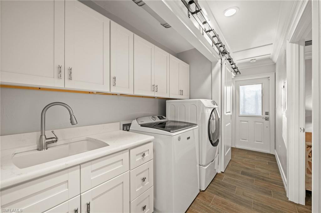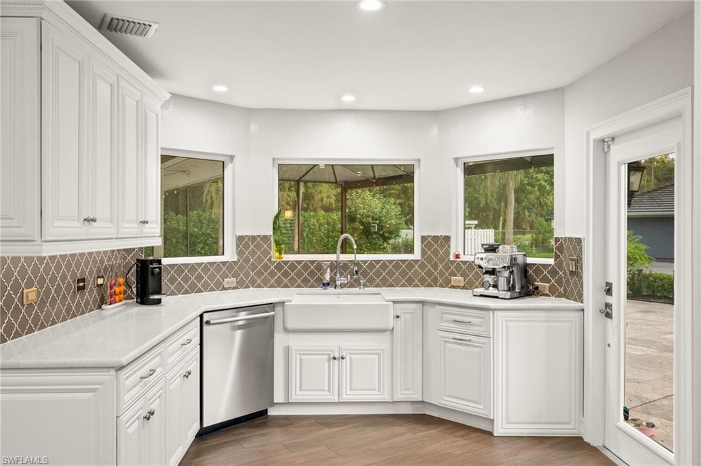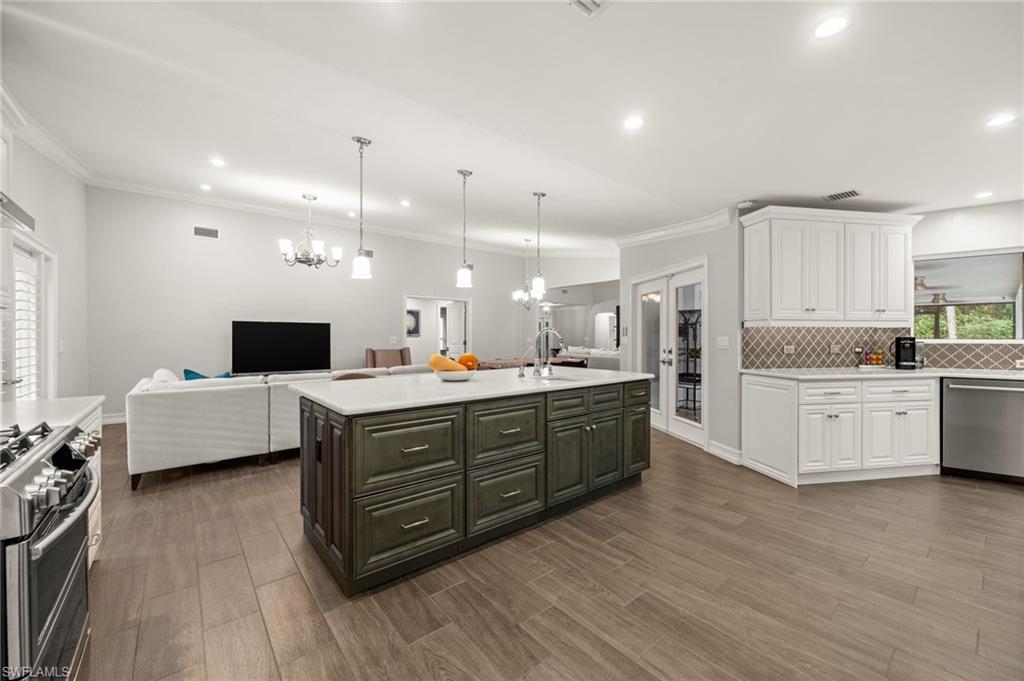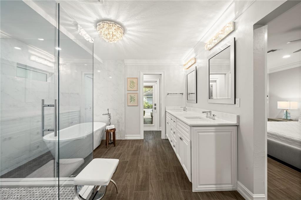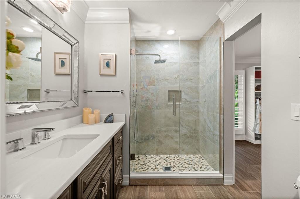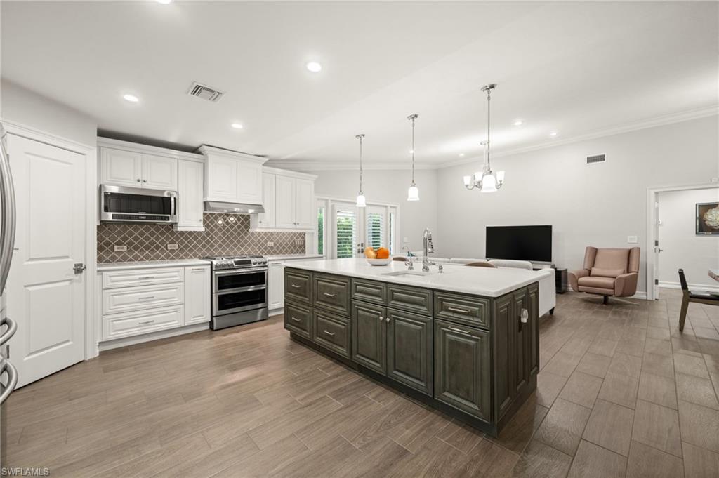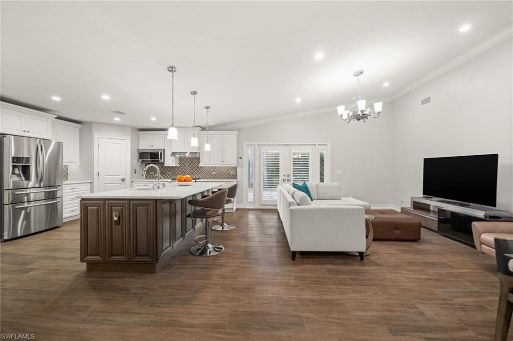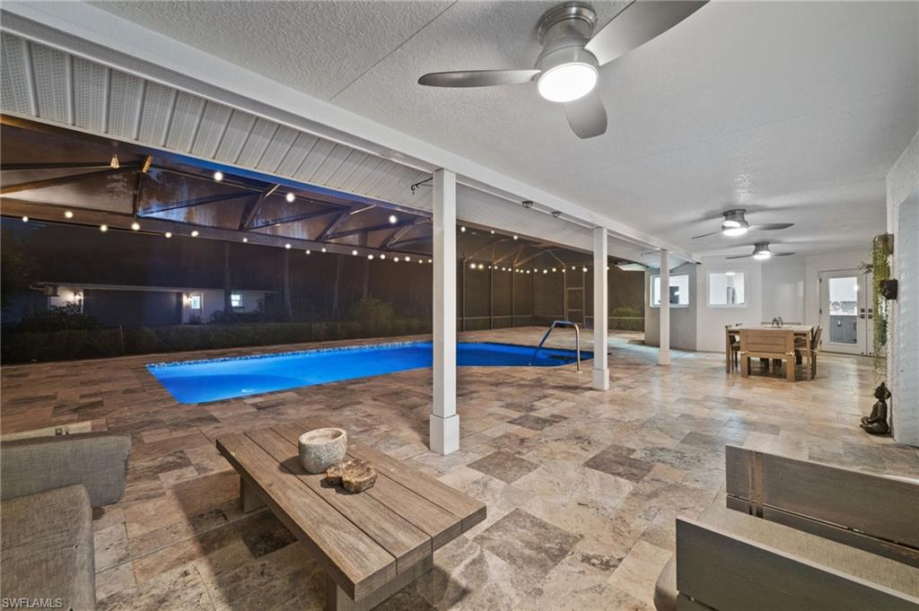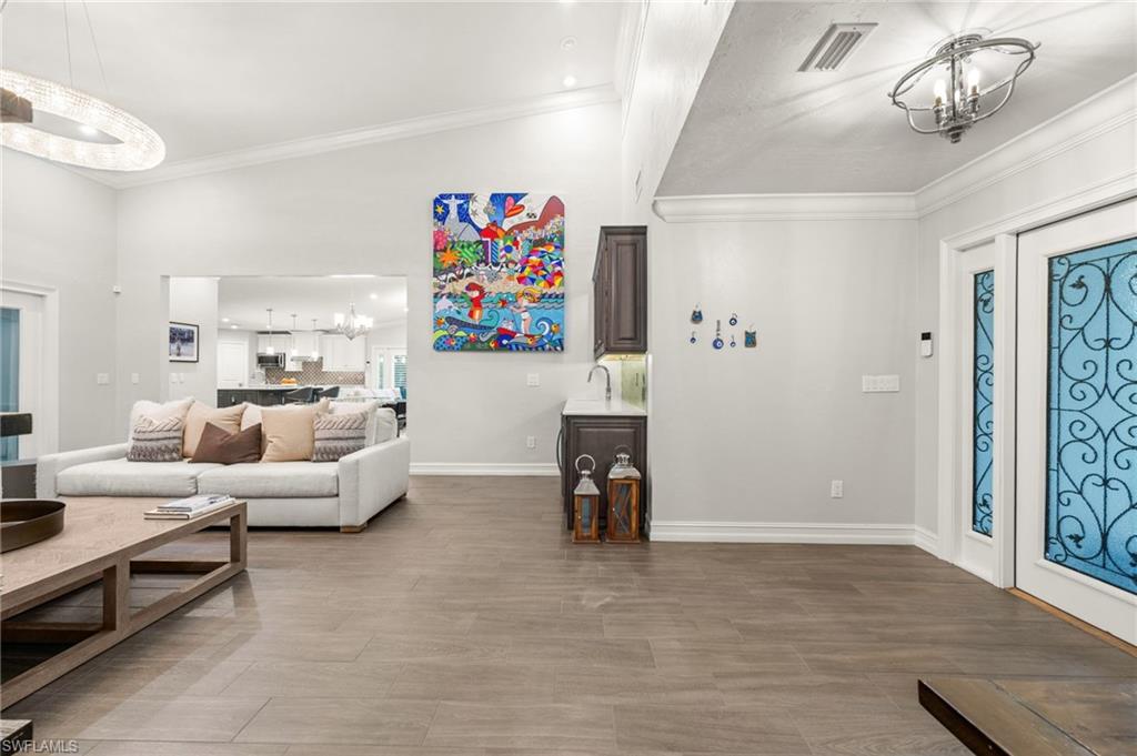 Step into this **fully upgraded and renovated** 4-bedroom, 4-bath, 3-car garage pool home, set on **2.27 acres** of beautifully wooded land! Located in the gated Logan Woods community of Naples, this residence is surrounded by an idyllic park-like setting both in front and behind, offering ultimate privacy and a serene immersion in nature. This move-in-ready home has been meticulously renovated down to the studs, showcasing a **2017 slate tile roof**, **impact glass windows**, sliders, and doors. Enjoy a fully redesigned kitchen and bathrooms, complemented by new wood plank look tile flooring throughout. The property features an automatic motorized entry gate, gas service via a buried propane tank, a whole house generator, and a reverse osmosis water system. Inside, experience soaring ceilings and a thoughtfully reengineered floor plan that includes dual living spaces, one featuring a wet bar with a wine fridge and a custom floor-to-ceiling fireplace mantel. The guest wing, accessible through elegant French doors, comprises two bedrooms and two full baths. The expanded kitchen boasts raised ceilings, enhancing the overall spaciousness. Step outside to the expansive **nearly 1,400 sq ft pool deck**, which features a newly rebuilt saltwater pool, complete with a spa area equipped with independent hot water jets and an in-pool bistro table with seating. New travertine marble flooring and a picture screen enclosure with upgraded no-see-um screening further enhance the outdoor experience, maximizing the stunning views of nature. Enjoy prime south exposure for ideal sun on the pool and breathtaking sunsets over the wooded vistas; the yard also includes an automatic sprinkler system and is fully fenced. The stunning renovated kitchen features custom white quartz countertops, a mix of white and espresso-colored soft-close cabinetry, all new stainless steel appliances including a gas range, and a generous island with seating. The spa-like primary bath offers white cabinetry, oversized shower with a frameless enclosure, multiple shower heads, stunning marbled tile, a modern freestanding tub, and a separate water closet. The **nearly 1,200 sq ft oversized 3-car garage outbuilding** has been cleverly divided into a 2-car garage and an air-conditioned storage room, which could easily be converted back to a 3-car garage. With multiple parking areas and long driveways, there's ample space for your boat, jet skis, and more. Logan Woods boasts no HOA fees and a fantastic location just 5 minutes from I-75, 10 minutes to Logan Landings, and 15 minutes to Mercato, surrounded by excellent restaurants and entertainment options. The property is fully fenced with fresh landscaping, providing a perfect blend of comfort and convenience.