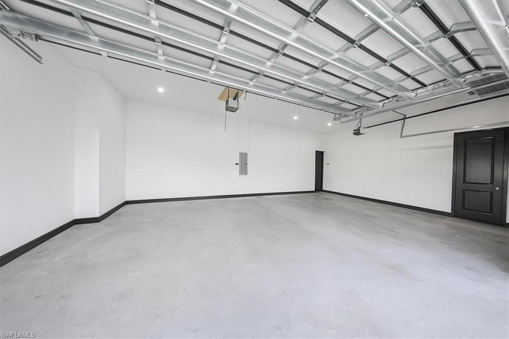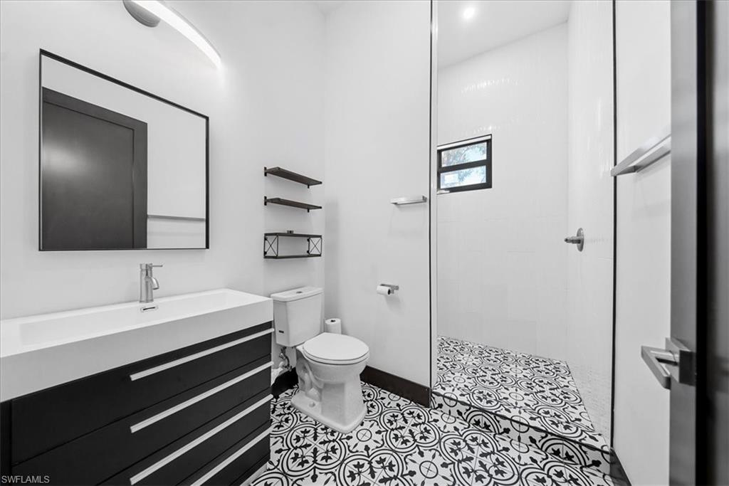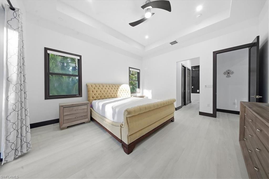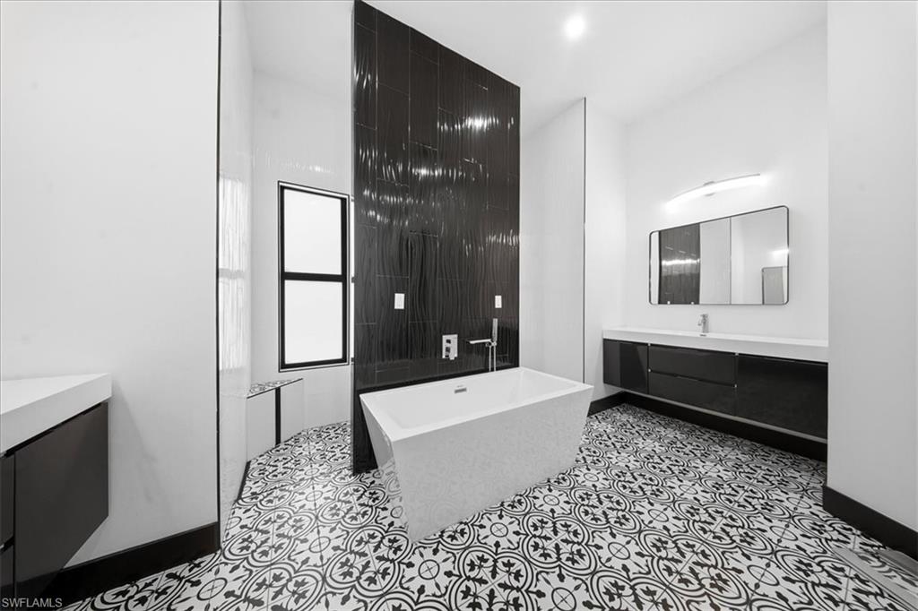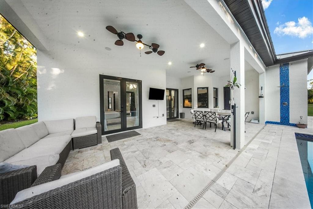 Modern 3 bedroom + den, 3 bath pool home on nearly half an acre in Bonita Springs, just minutes from Barefoot Beach, shopping and dining. A long paver drive and contemporary elevation with metal roof lead into a light-filled open layout with high ceilings and wide-plank tile flooring. Sleek kitchen with oversized waterfall island, flat-panel cabinetry, smart stainless appliances and double wall ovens opens to the living and dining areas; oversized den with private bathroom works well as a media room or your own personal gym. Spa-style primary suite offers a striking bath with patterned tile, floating dual vanities, freestanding soaking tub and large shower. Outside, enjoy a private outdoor oasis with saltwater pool, raised spa, auto-fill/auto-drain system, travertine deck and covered lanai. Spray-foam attic insulation, smart features and generous yard space on all sides complete this move-in ready retreat.